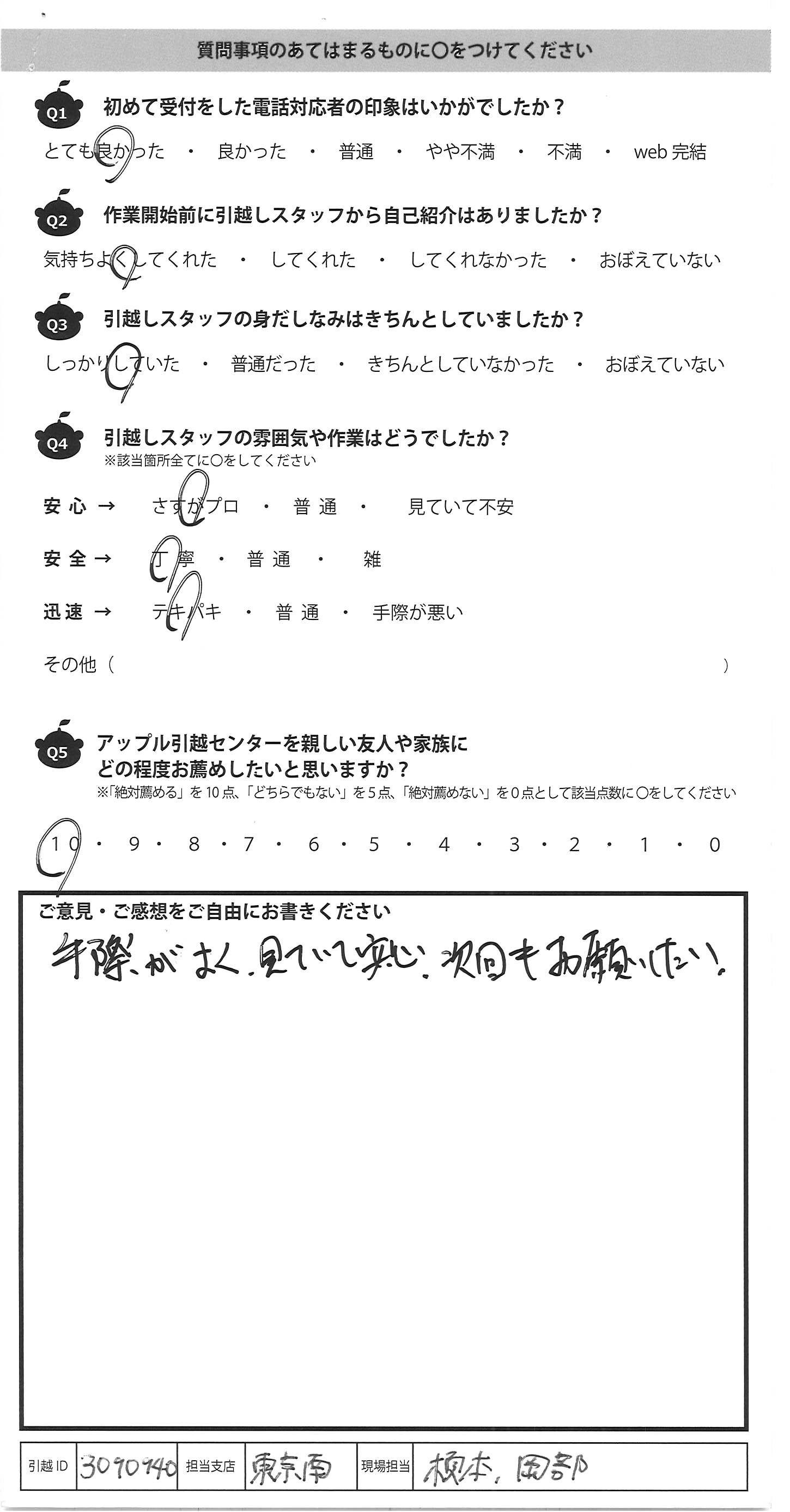A.手際がよく、見ていて安心、次回もお願いしたい。