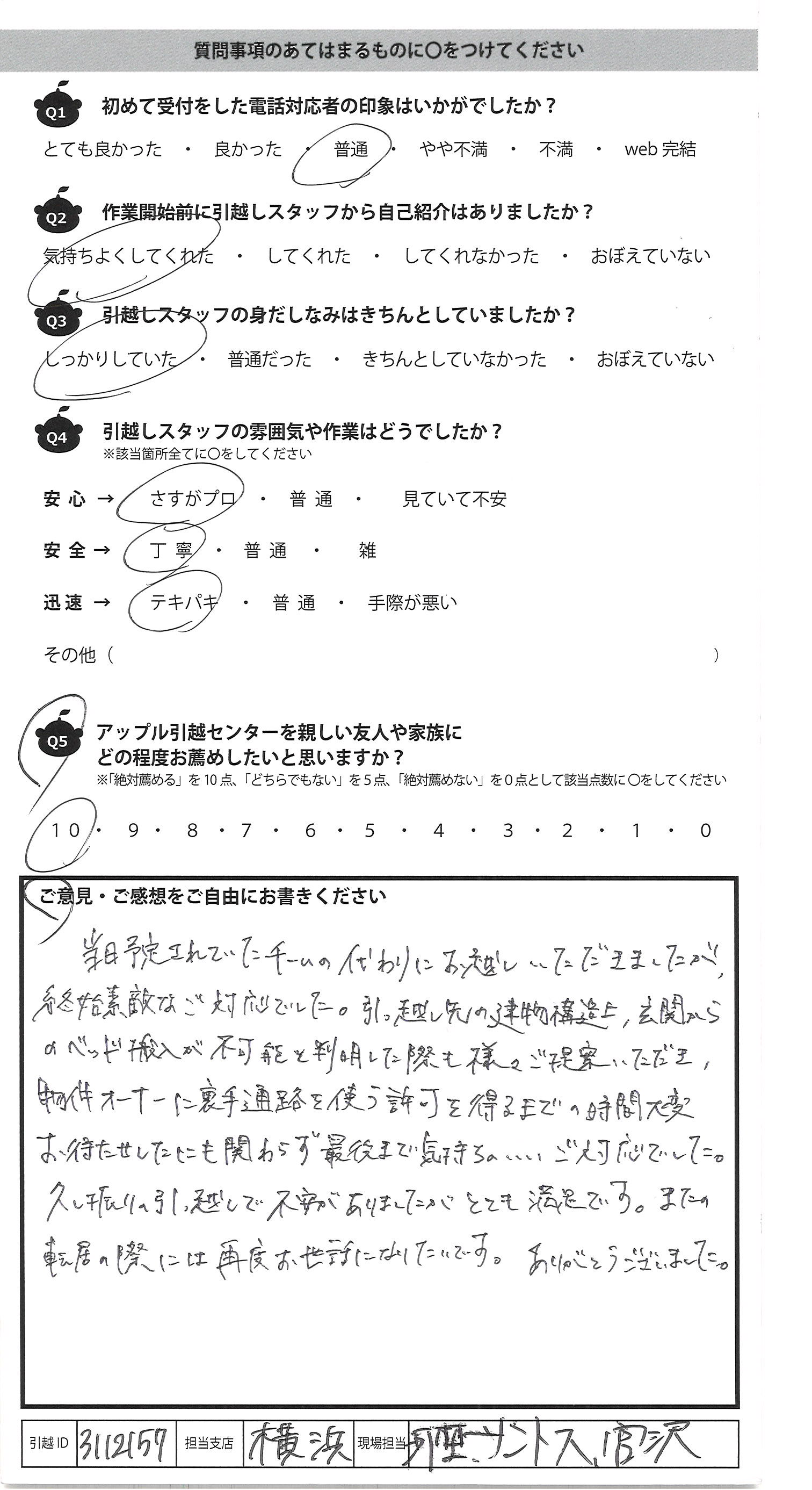 A.当日予定されていたチームの代わりにお越しいただきましたが、 終始素敵なご対応でした。引っ越し先の建物構造上、玄関から のベッド搬入が不可能と判明した際も様々ご提案いただき、 物件オーナーに裏手通路を使う許可を得るまでの時間大変 お待たせしたにも関わらず最後まで気持ちのいいご対応でした。 久し振りの引っ越しで不安がありましたがとても満足です。またの 転居の際には再度お世話になりたいです。ありがとうございました。