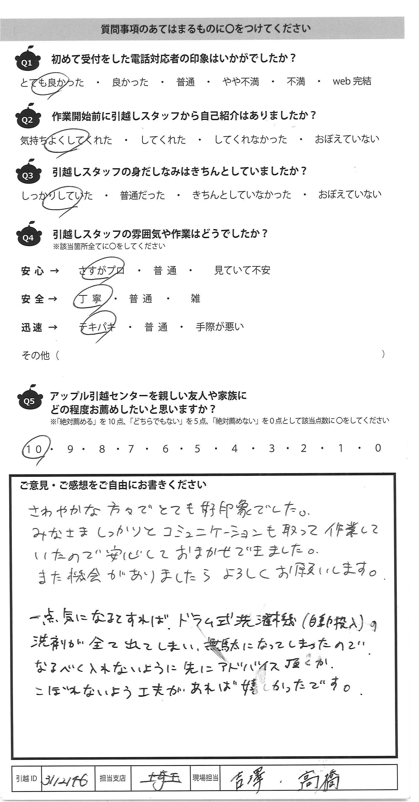 A.以前、仕事でアップルさんの引越しに立ち合い いつか自分の引越しはアップルさんに依頼しよう と思っていました。今回、引越してみて、依頼 して良かったと改めて思いました。会う人あう人 に、前からアップルさんいいよ、と言ってきましたが これからも、友人みんなに言っておきます。 次、個人のミシン移動をお願いしようかと思ってます。 色々とありがとうございました。1つだけ、引越後の ウォーターサーバーの電話は、メールかLINEが良いと思いました