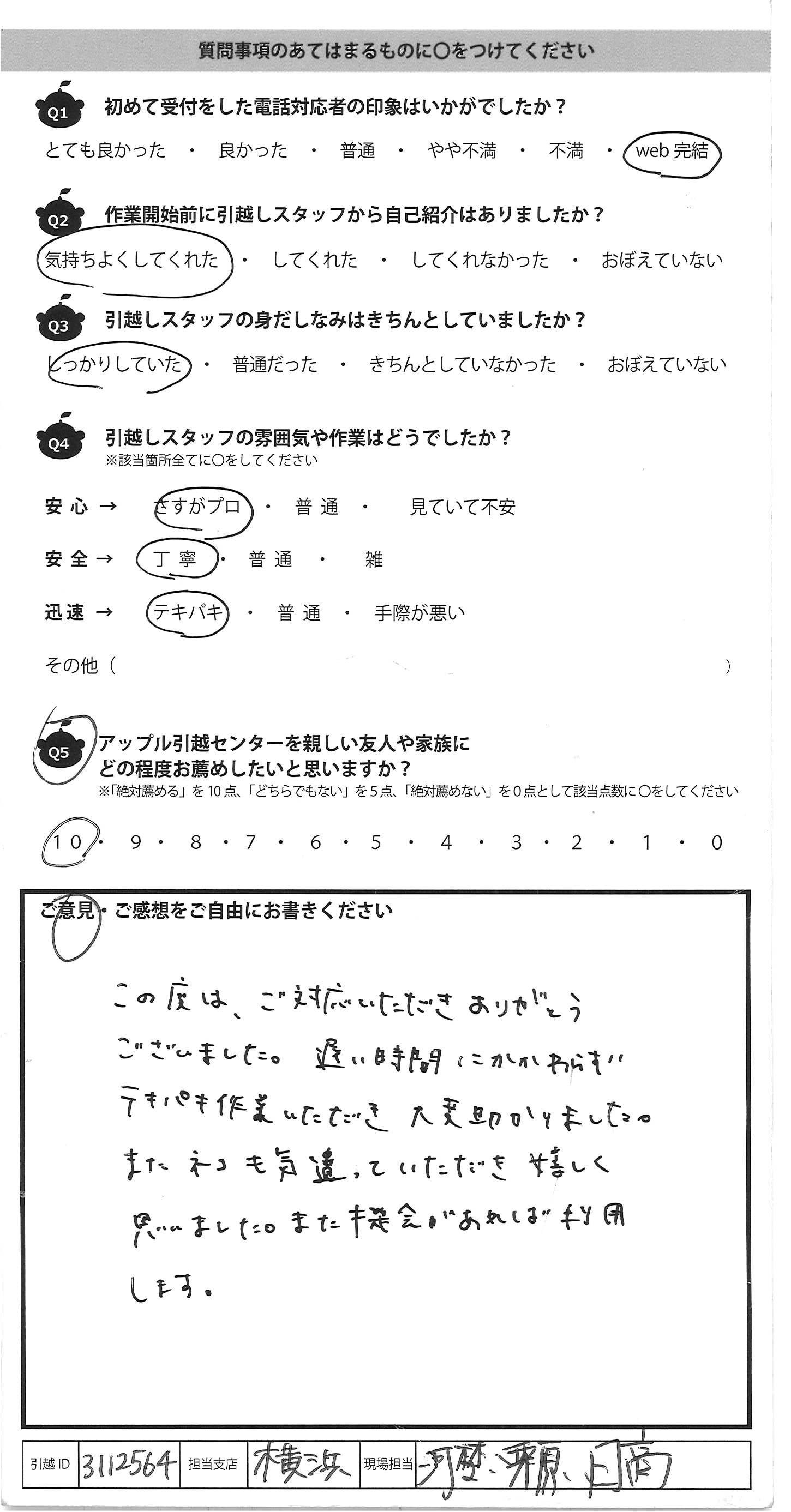 A.とてもしんせつに丁寧な対応をありがとう ございます! また引越しの際はアップルさんにお願いしたいです。 ありがとうございました!!