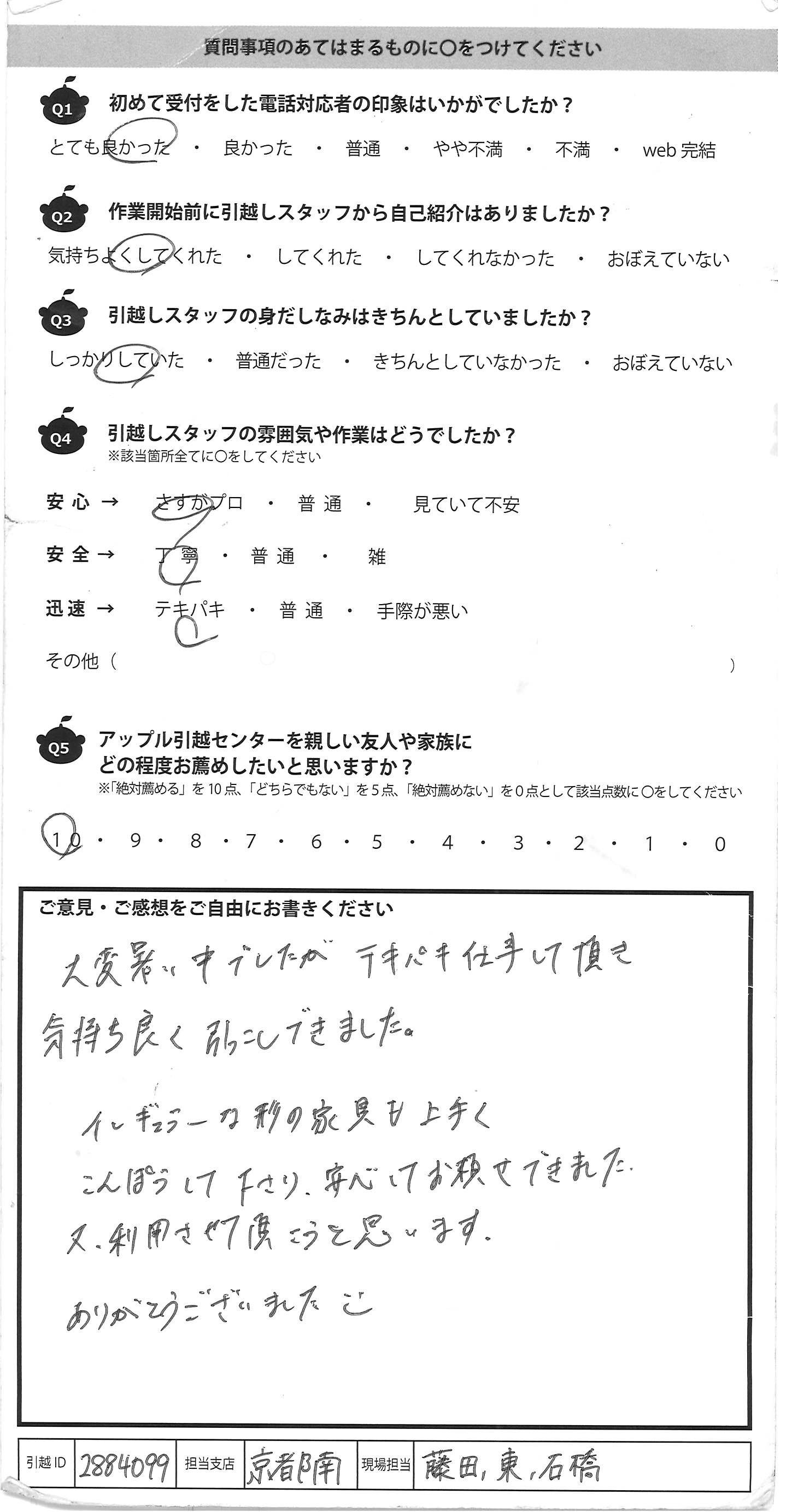 A.大変暑い中でしたがテキパキ仕事して頂き 気持ち良く引っこしできました。 イレギュラーな形の家具も上手く こんぽうして下さり、安心してお願せできました。 又、利用させて頂こうと思います。 ありがとうございました