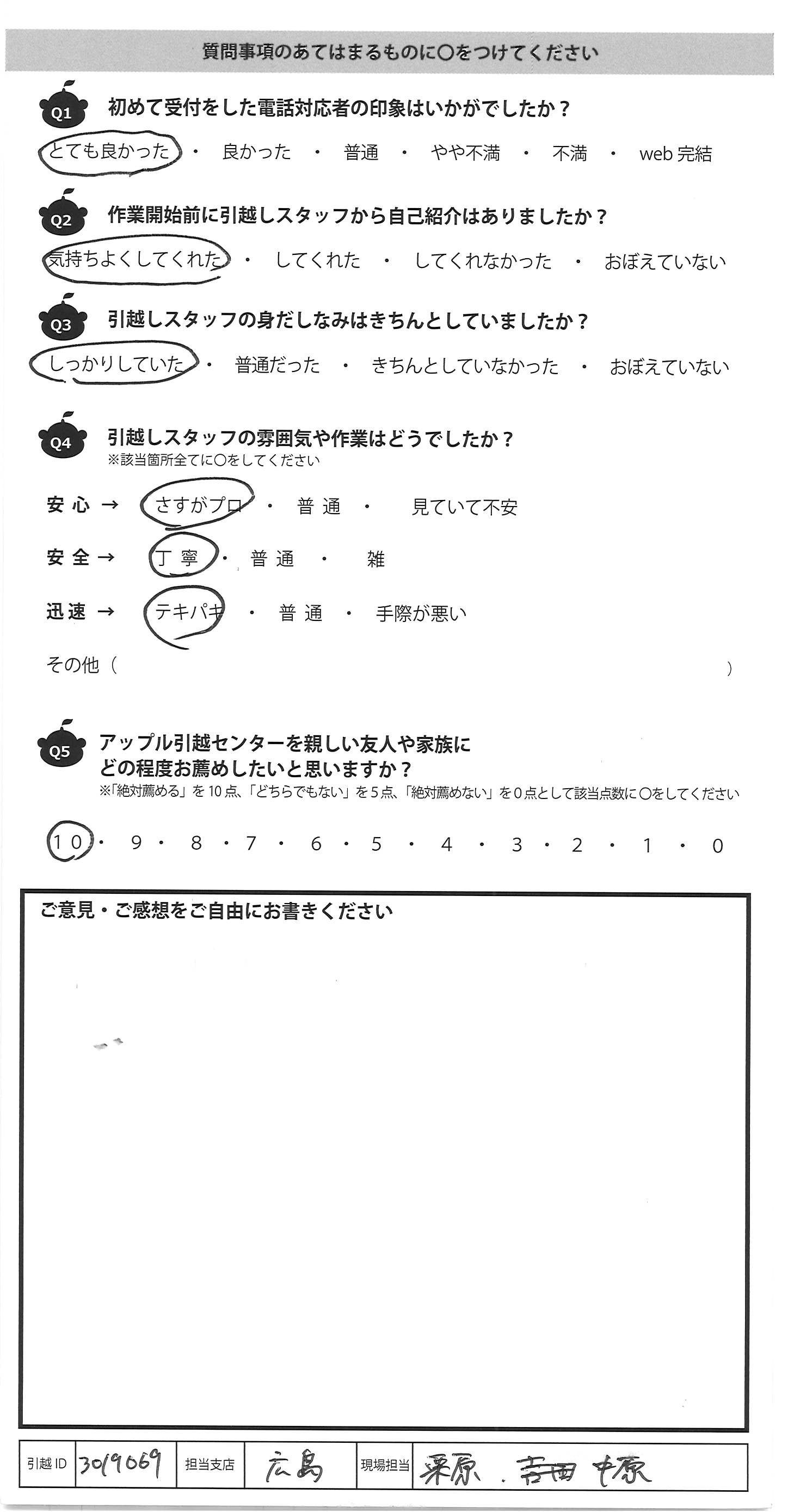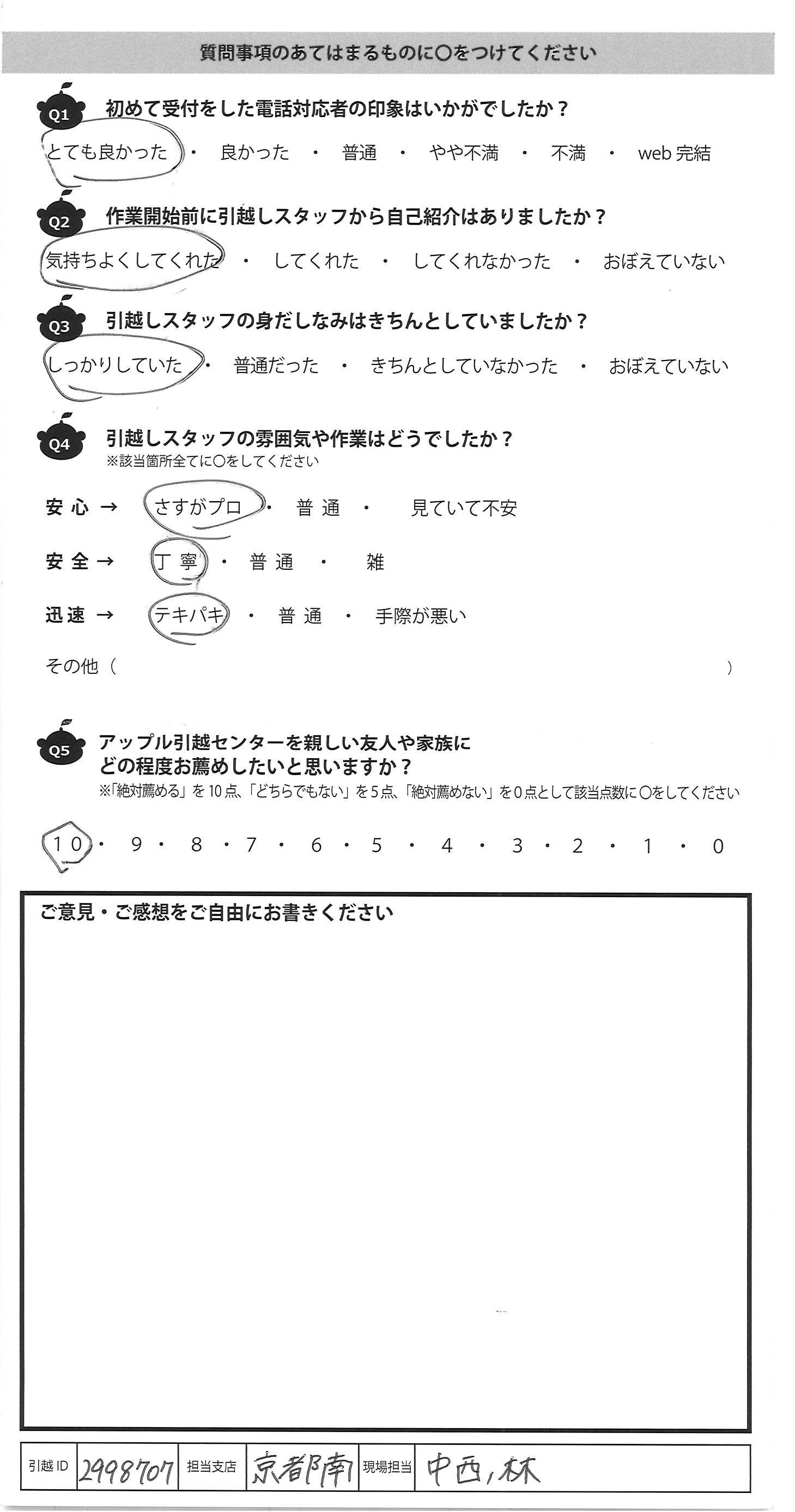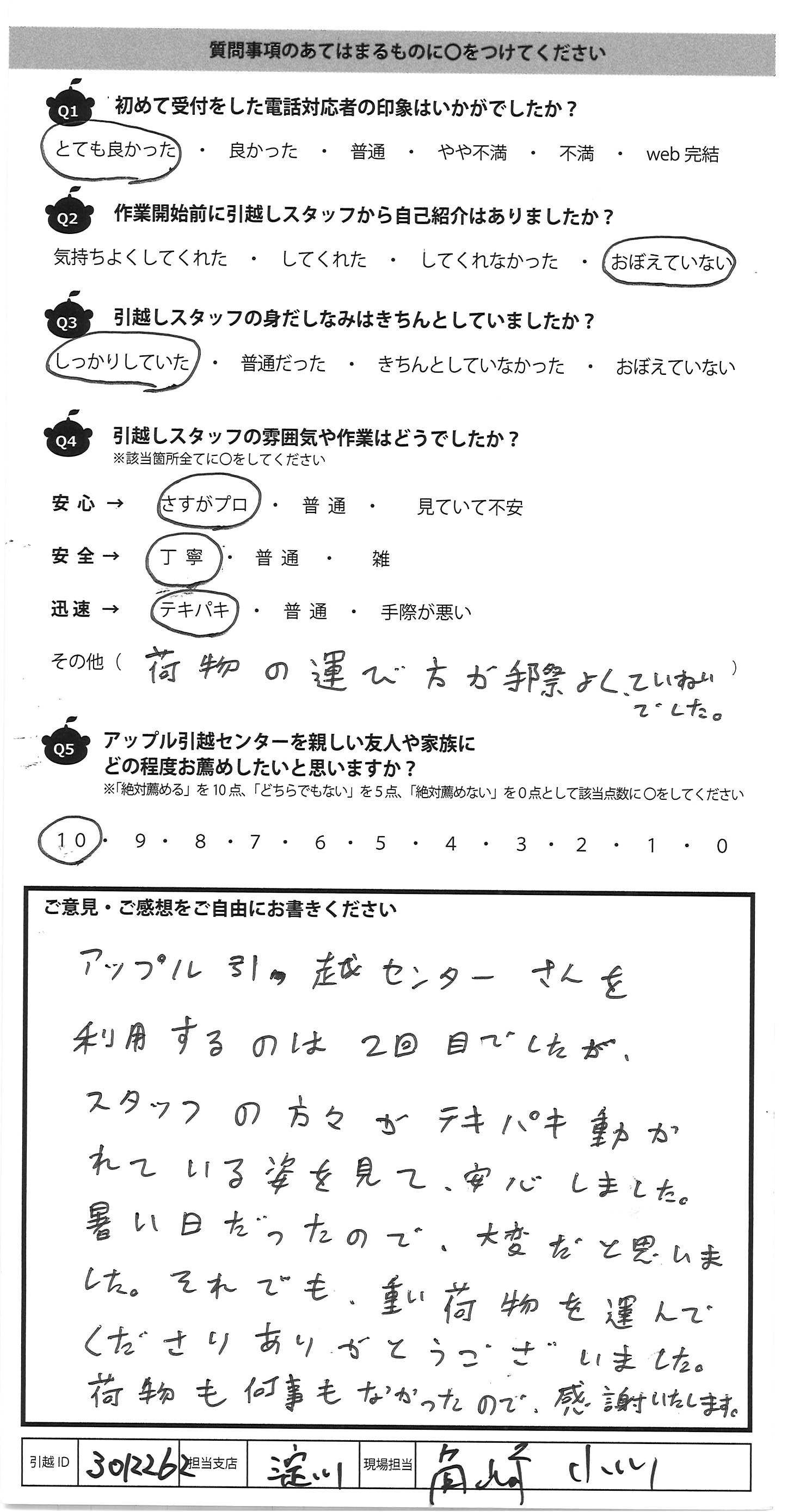 A.アップル引越センターさんを 利用するのは2回目でしたが、 スタッフの方々がテキパキ動か れている姿を見て、安心しました。 暑い日だったので、大変だと思いま した。それでも、重い荷物を運んで くださりありがとうございました。 荷物も何事もなかったので、感謝いたします。