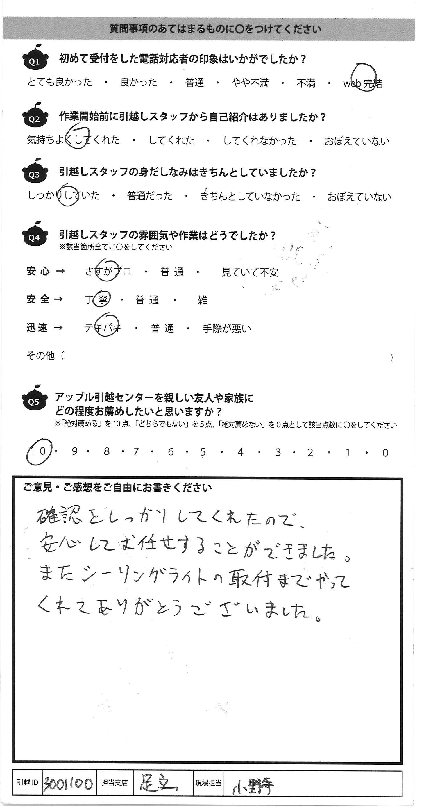 A.確認をしっかりしてくれたので、 安心してお任せすることができました。 またシーリングライトの取付までやって くれてありがとうございました。