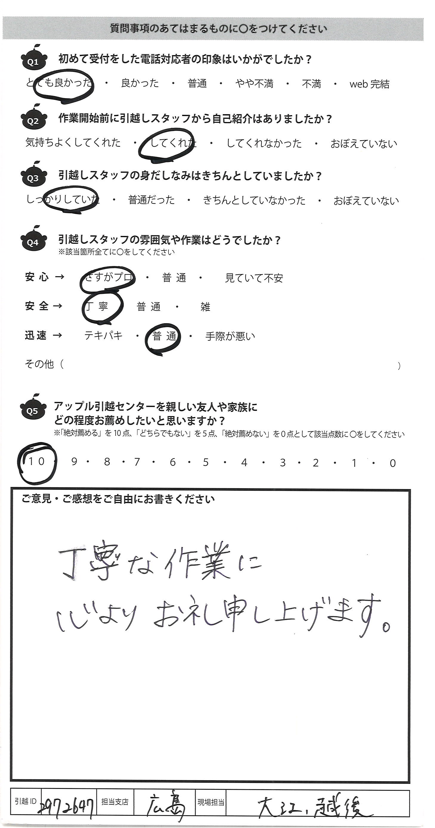 A.初めて引越業者に頼みましたがとても良かったです。 皆さん若いのにしっかりしていて、頼もしかったです。 また引越をする際にはアップルさんに頼もうと思います。 今回は荷物も多い中大変だったと思いますが 最後まで素晴しい対応でした。 リーダーの山口さんは若いのにベテランで終始笑顔で 対応してくれました。とても印象の良い青年です。 引越を手伝だってくださりありがとうございました。