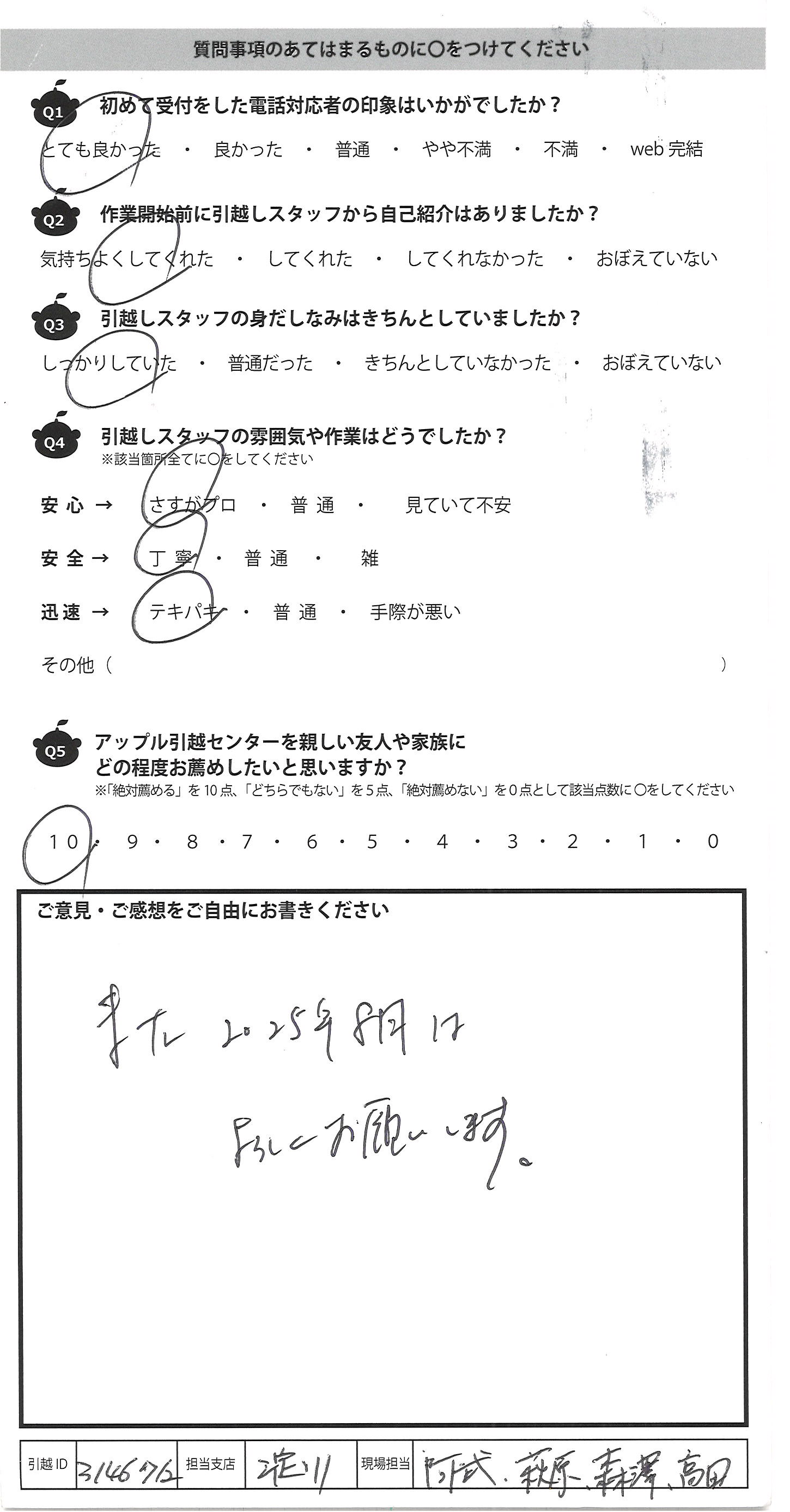 A.2回目の利用でしたが、今回も丁寧に対応して 頂きました。 お陰でスムーズに引っ越し作業も済み、 新生活を順調に送れています。 スタッフお2人のコンボも良くテキパキされていました。 また機会があればお願いしたいと思っています。 ありがとうございました。
