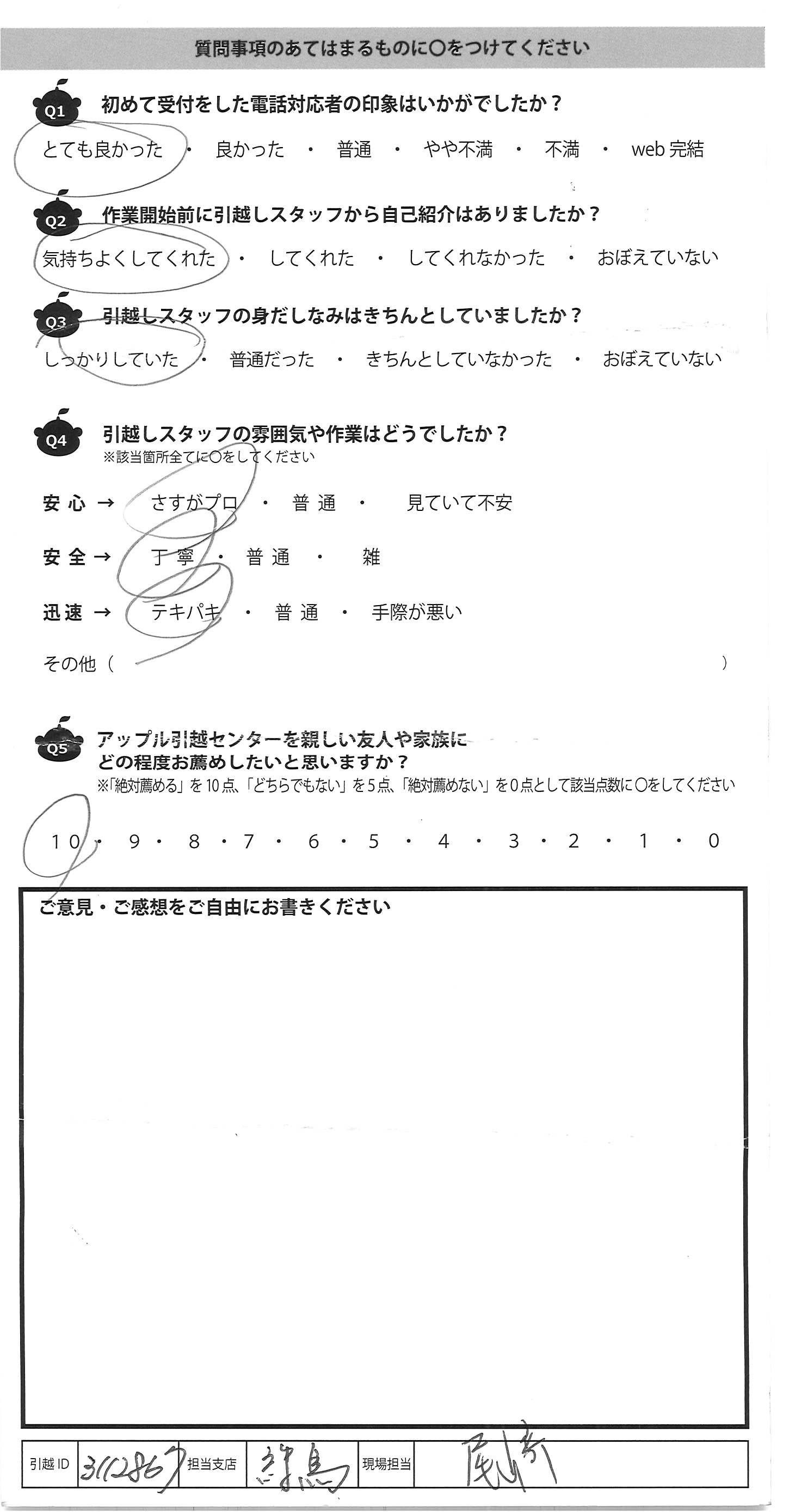 A.ご提出が遅くなりまして申し訳ございません。 2度目の利用です。前回アップルさんへ依頼し、 とても良い印象を持ちましたのでまたぜひお願い したいと思っていました。今回は2名分の引っ越し (前回は単身)でしたので、家具の運び出しや設置 が予想以上に大変そうでしたが、さすがはプロという 感じであらゆる方法で傷をつける事なくかつ素早く 作業をしてくださいました。午後開始で夕方過ぎまで 長いお休みもとれらず作業されていて申し訳なかった ですが、最後まで丁寧に対応してくださり感謝しています。 また、見積り等担当してくださった佐藤様も大変素晴しい 対応で、お願いして本当に良かったと思います。 スタッフの皆様、本当に有難うございました。