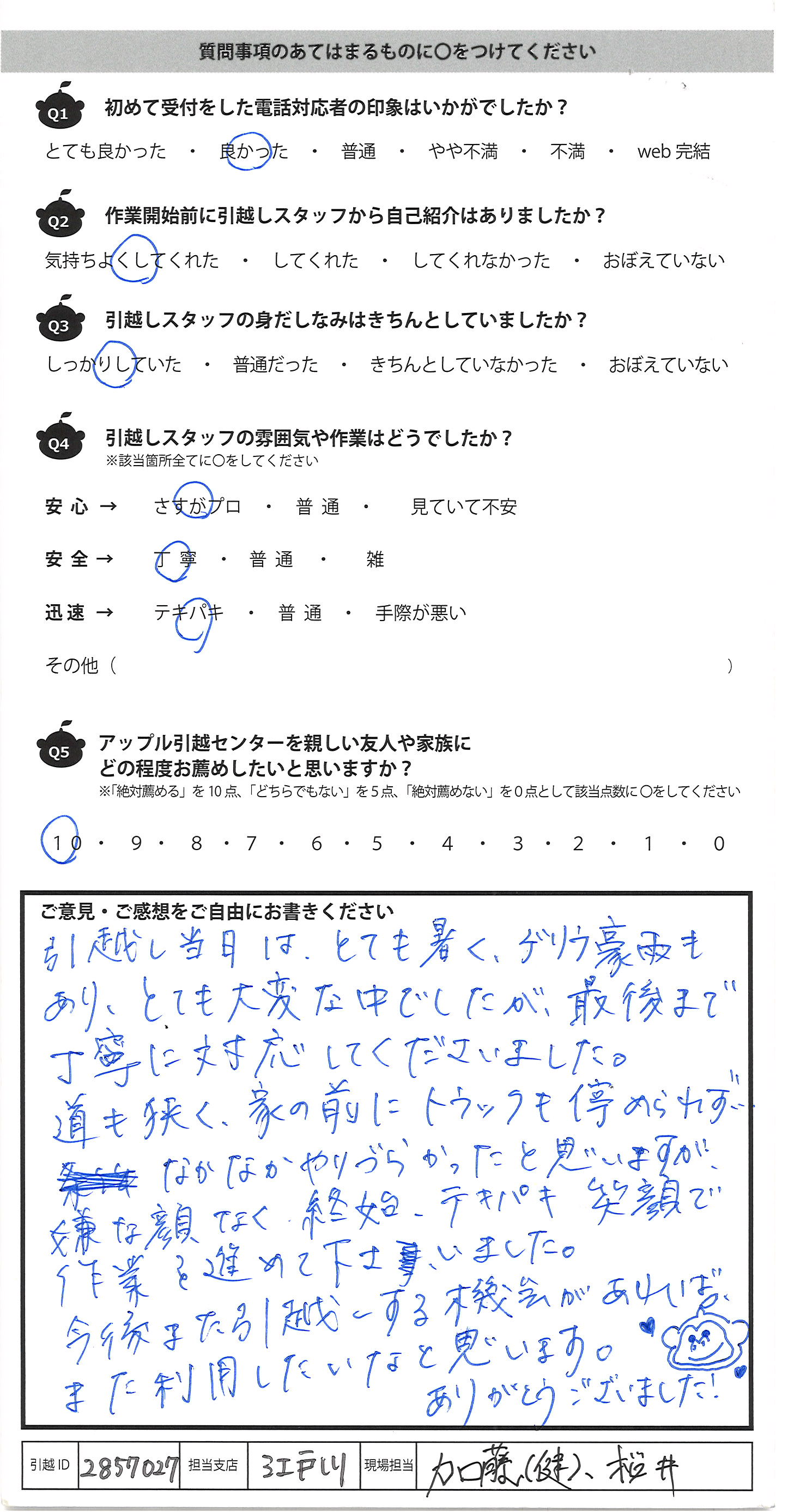A.見積もりの時の営業の方が誠実で信頼のおける方でしたので、それだけでも安心していましたが、引越しの作業の3人のスタッフの皆さんが機敏で、ものすごく手際の良い作業をして頂きました。家族みんなで驚いています。本当に心から感謝しています。引越しは15回目でしたが、こんなに気持ちのいい引越しは初めてです。SUUMOの人気ランキングを見て選びましたが、さすがですね!納得の第1位です。また引越しの時が来ましたら、アップル引越しセンターさんに是非お願いしたいです。みなさま本当にありがとうございました。