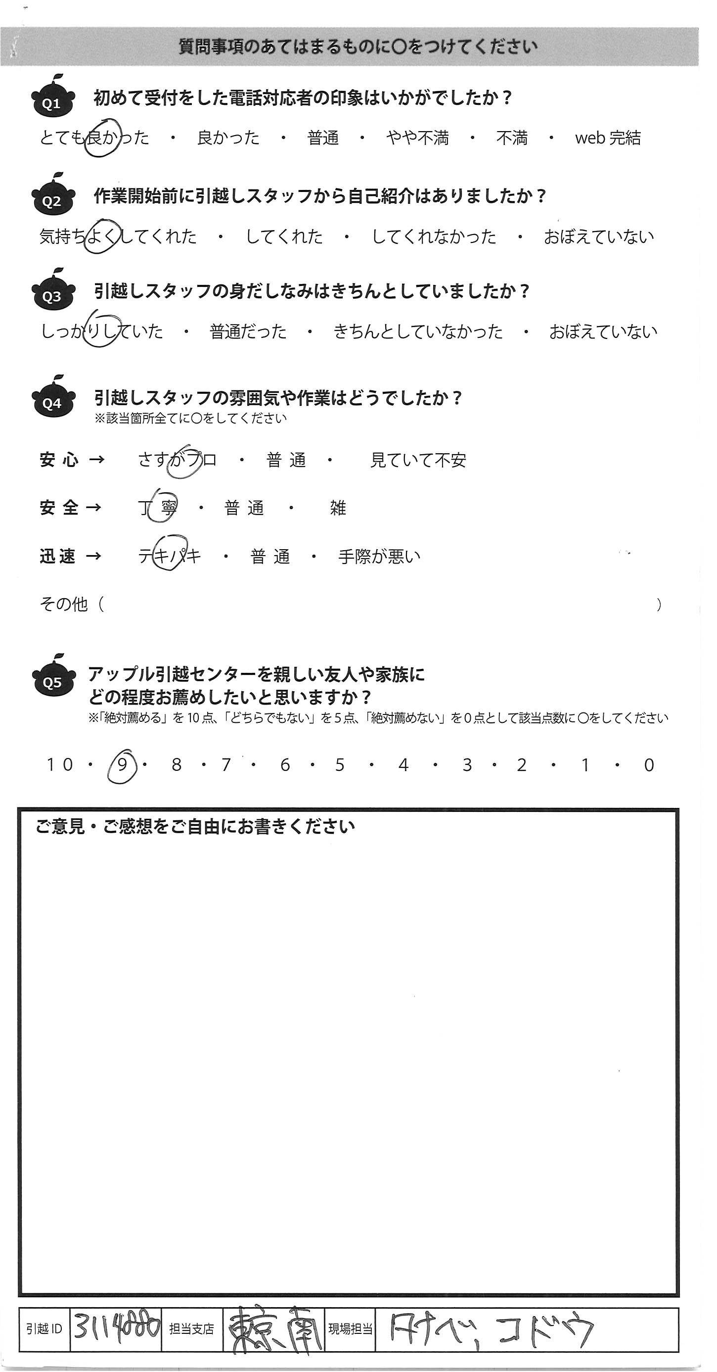 A.完璧すぎてびっくりしました!!最高です 対応もとても良く家具のネジが緩んでいた コタツやテーブルを進んで直して頂いたり、 こちら側の今後の事を考え、案内して頂き 荷造りで激疲れだったのでとても頼りに なり助かりました。親切でテキパキとかっこ良 かったです。何より長尾さん、佐藤さん、テンテンさんの チームワークバッチリでした。本当に有りがとうございました!!