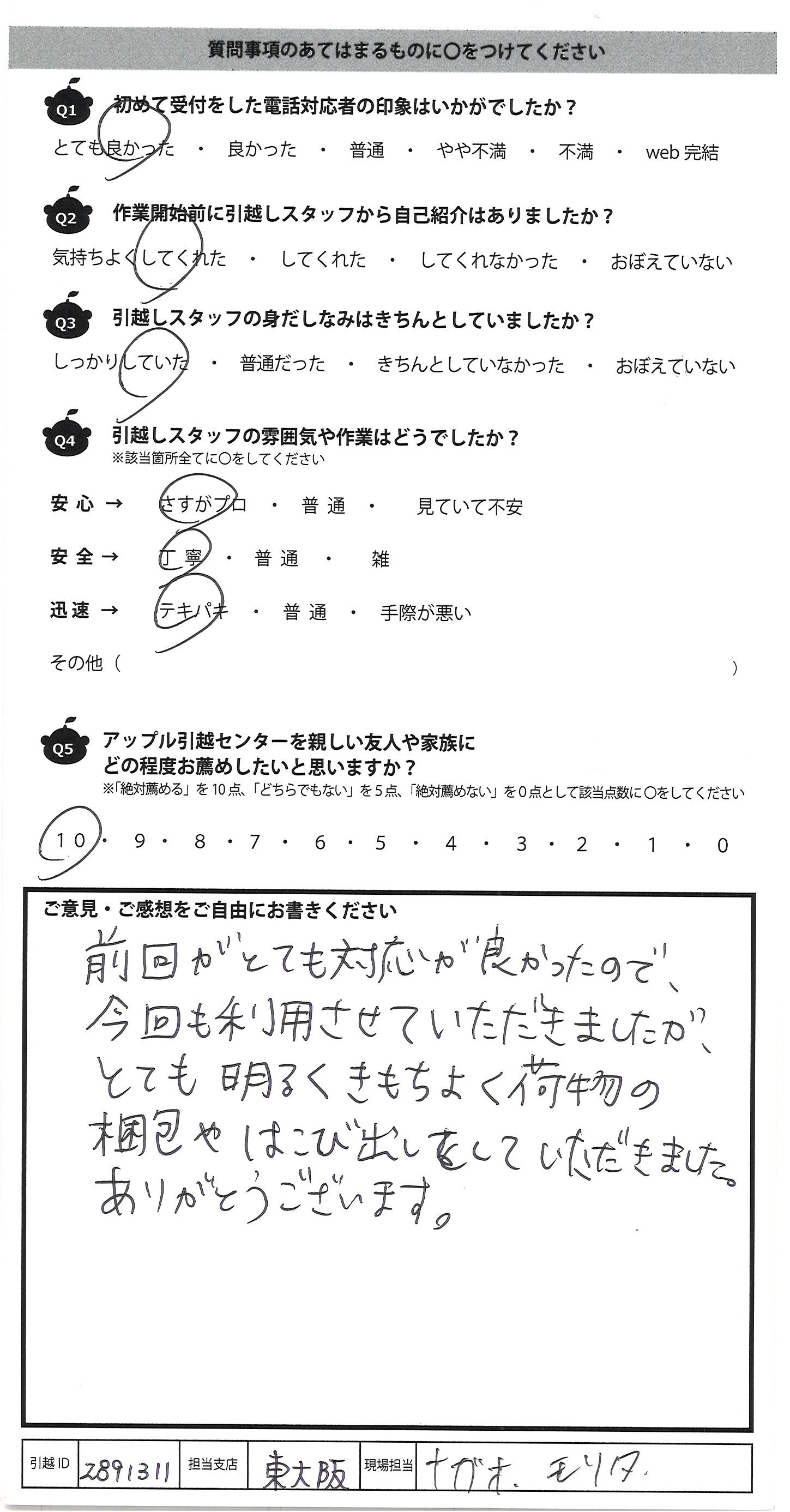 A.貴社の利用は3回目ですが今回もとても 気持ち良くてきぱき、明るく、すがすがしい 仕事ぶりで感心しました。ちょっとした手違いがありまし たが対応は完璧でした! リーダーの岩瀬さんは、さすがの働きでした。 荷出しや引越しはこちらが疲れている 状況ですが、アップルさんが手伝って下さると元気が 出ますし、若者のはつらつさを目のあたりにすると 日本も、まだ大丈夫だ、と安心いたします。 又、何かの機会ありましたらよろしくです。
