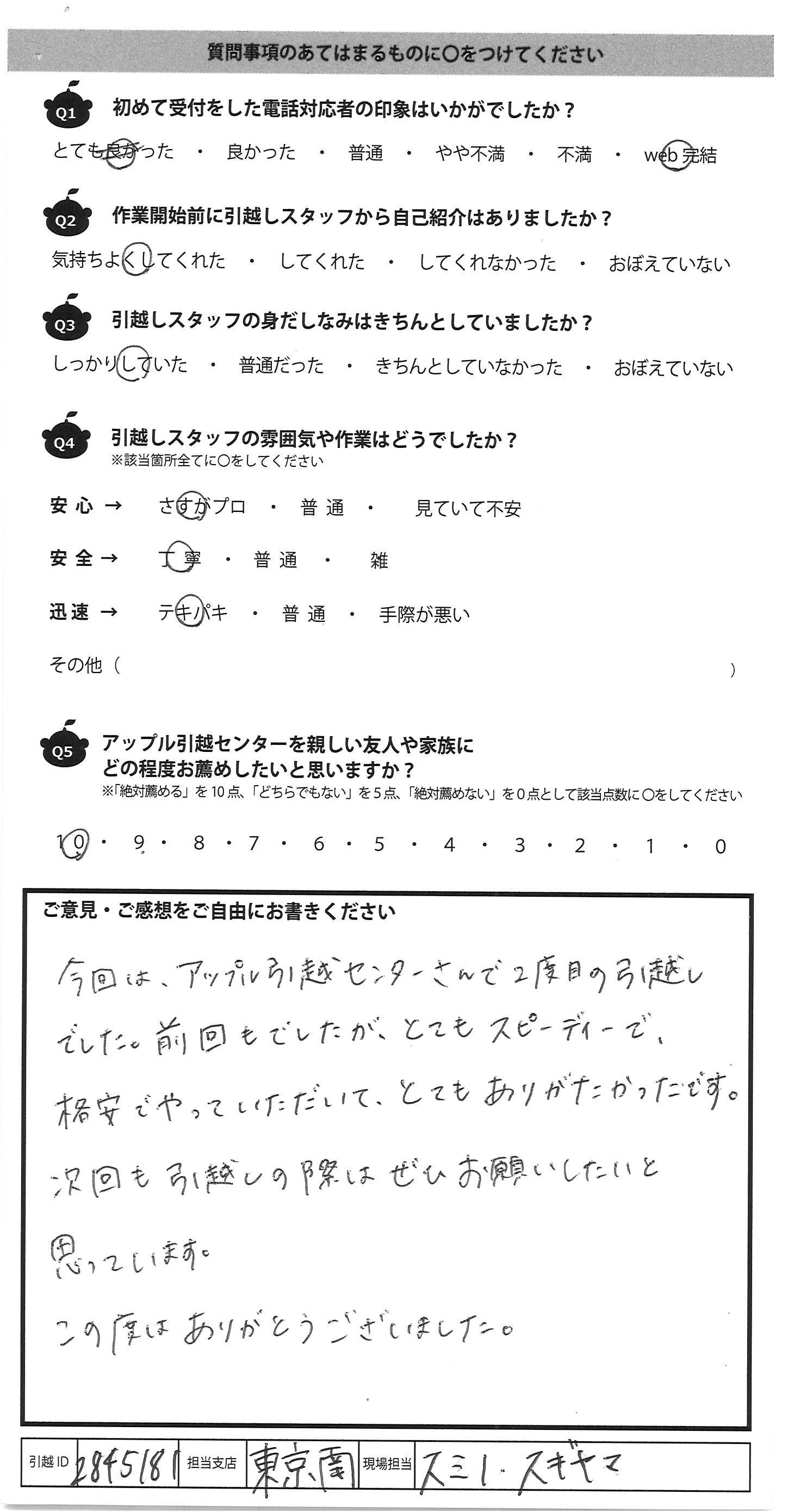 A.今回は、アップル引越センターさんで2度目の引越し でした。前回もでしたが、とてもスピーディーで、 格安でやっていただいて、とてもありがたかったです。 次回も引越しの際はぜひお願いしたいと 思っています。 この度はありがとうございました。