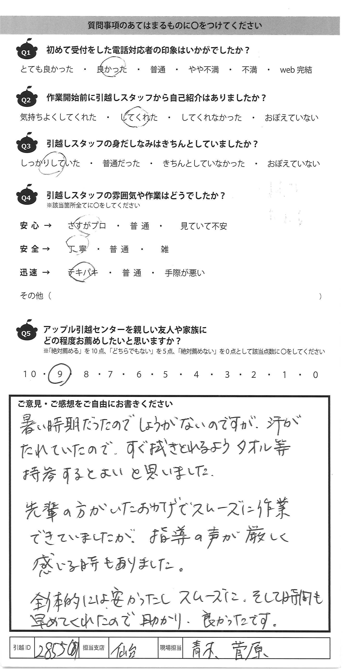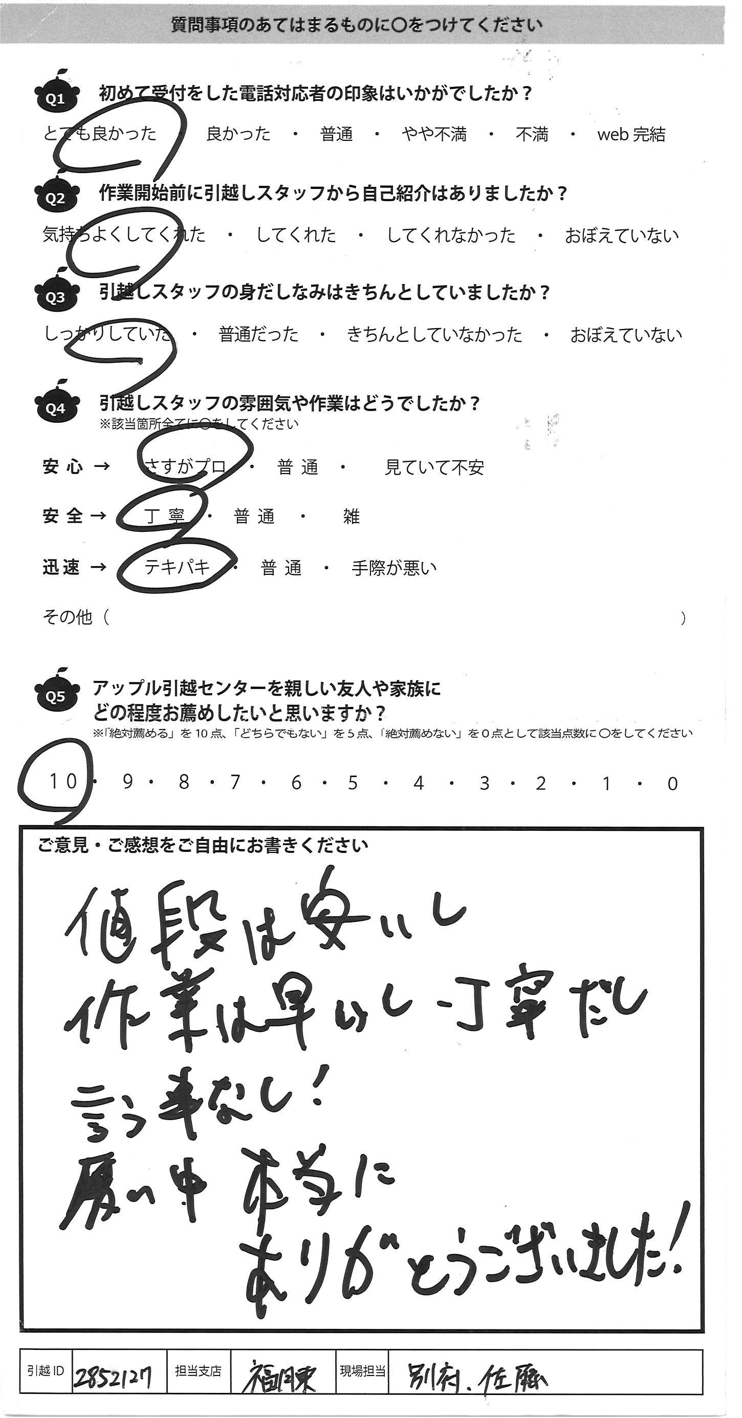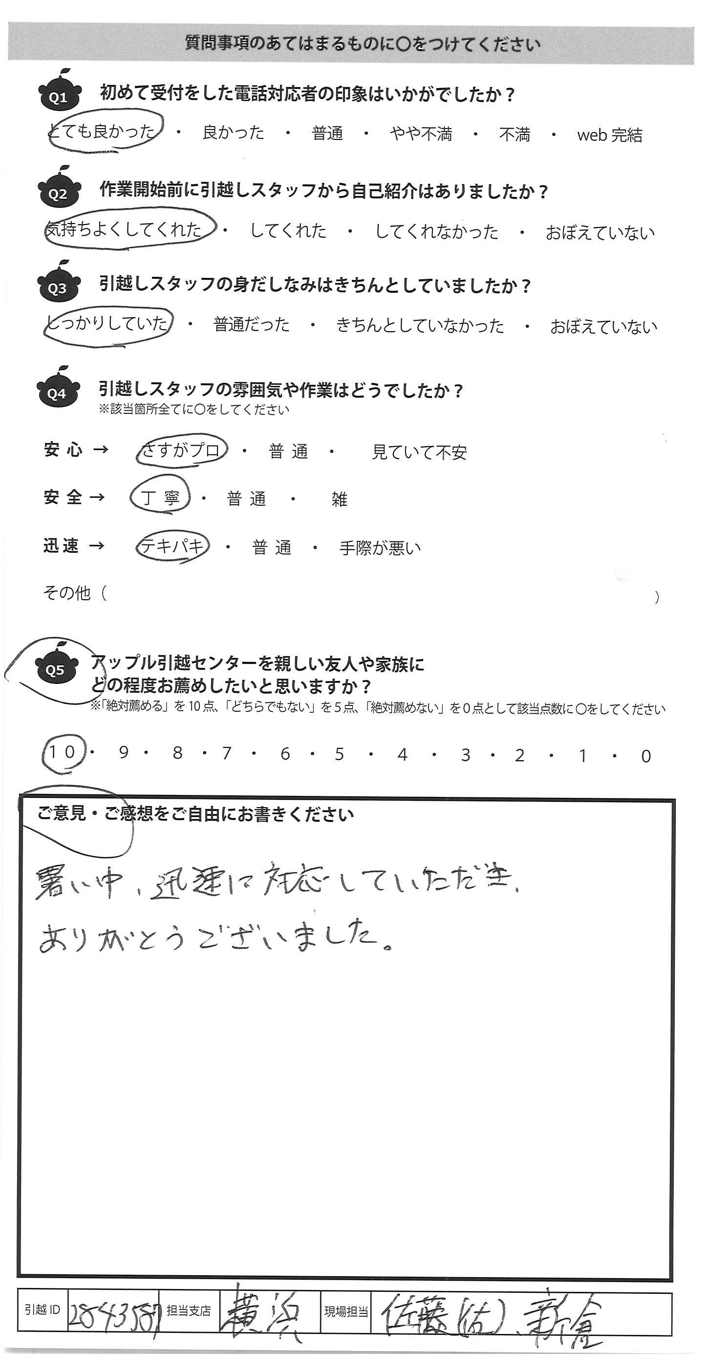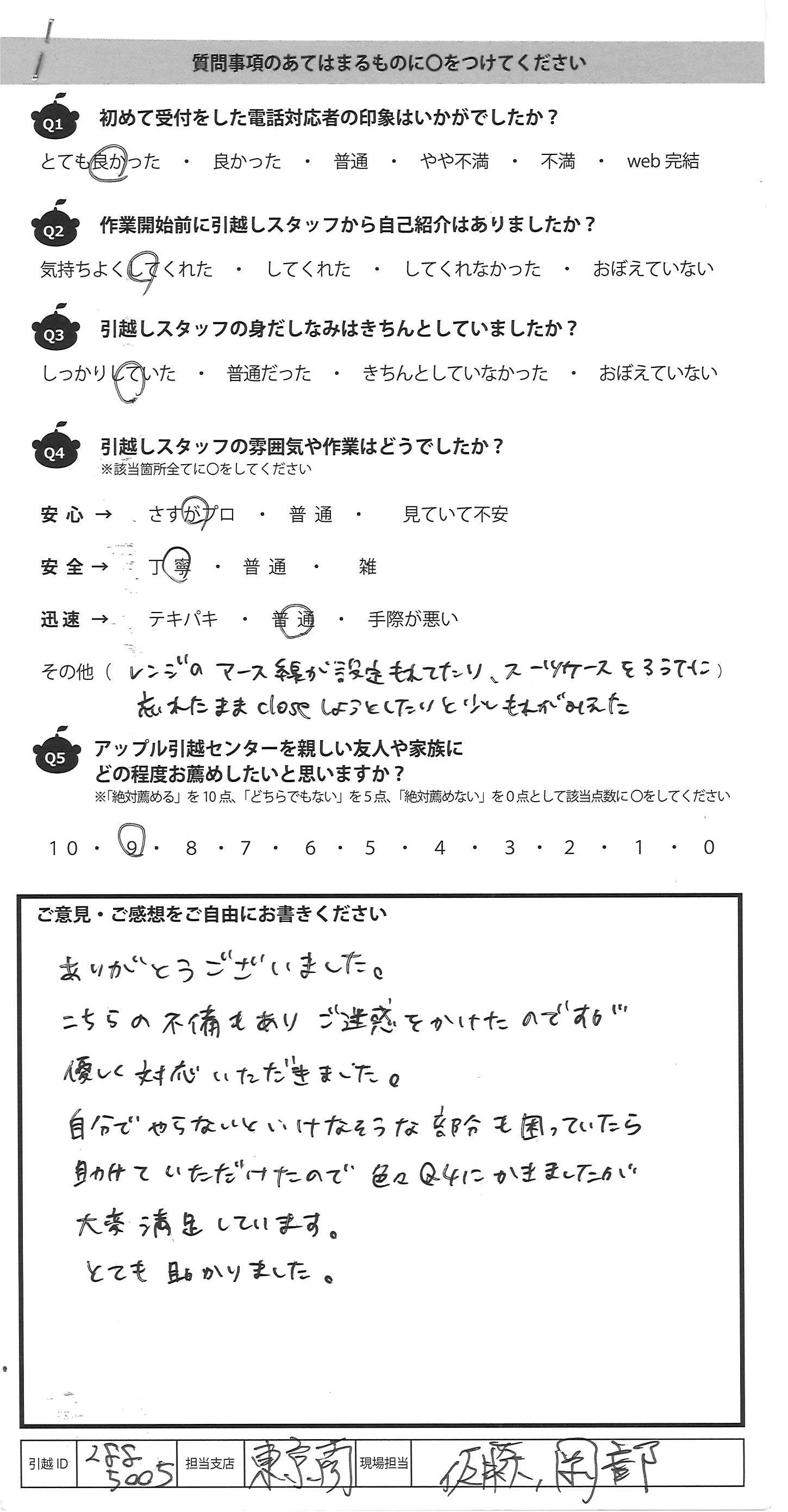 A.非常に丁寧且つ迅速な対応で良かったです。他社と比較してもハイレベルだと思います。あとは、ダンボールの引き取りと、食器を包む紙が最初からダンボールと一緒に同梱されていたら10点満点でした。家族それぞれの引越しが多いので、また利用させて頂きます。この度は大変お世話になりました。
