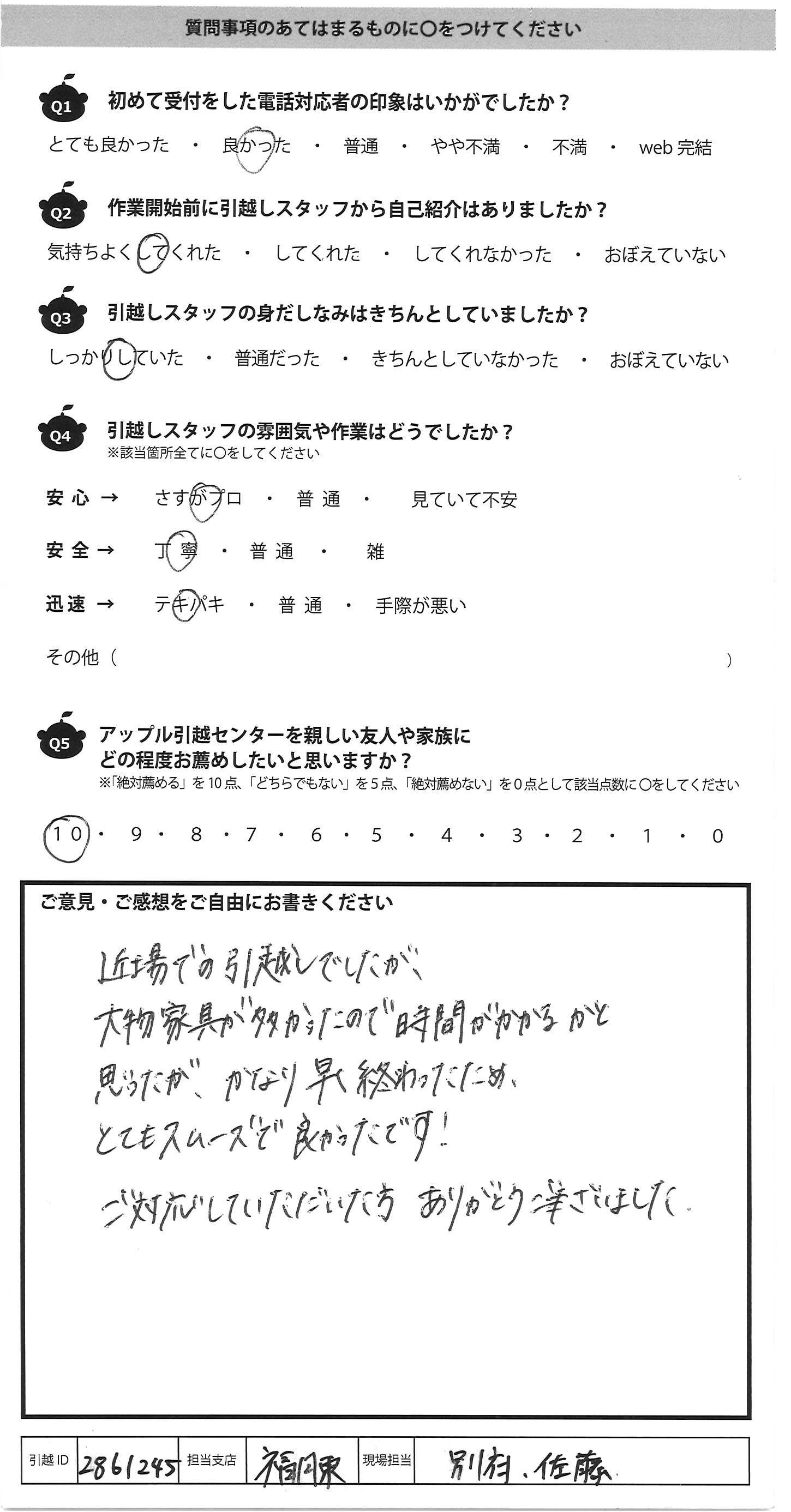 A.近場での引越しでしたが、 大物家具が多かったので時間がかかるかと 思ったが、かなり早く終わったため、 とてもスムーズで良かったです! ご対応していただいた方ありがとうございました。