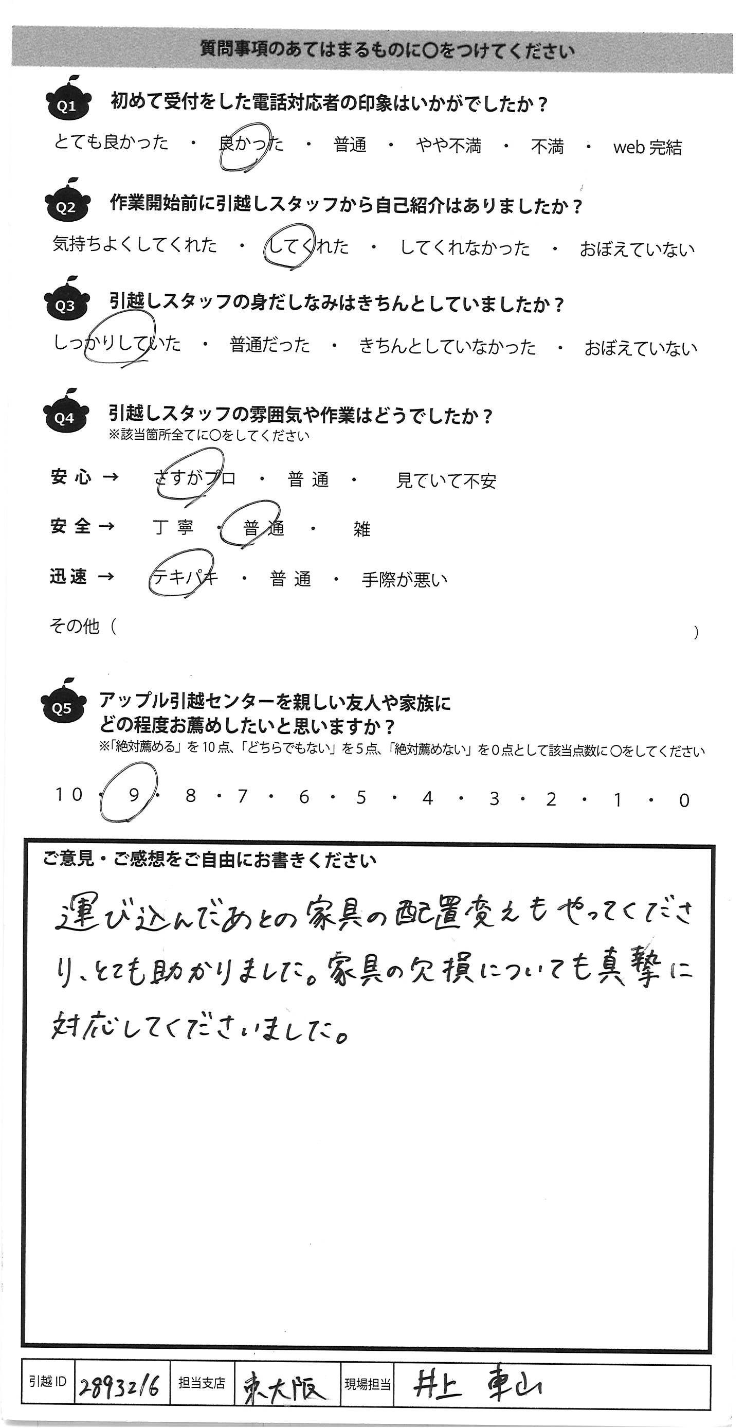A.運び込んだあとの家具の配置変えもやってくださ り、とても助かりました。家具の欠損についても真撃に 対応してくださいました。