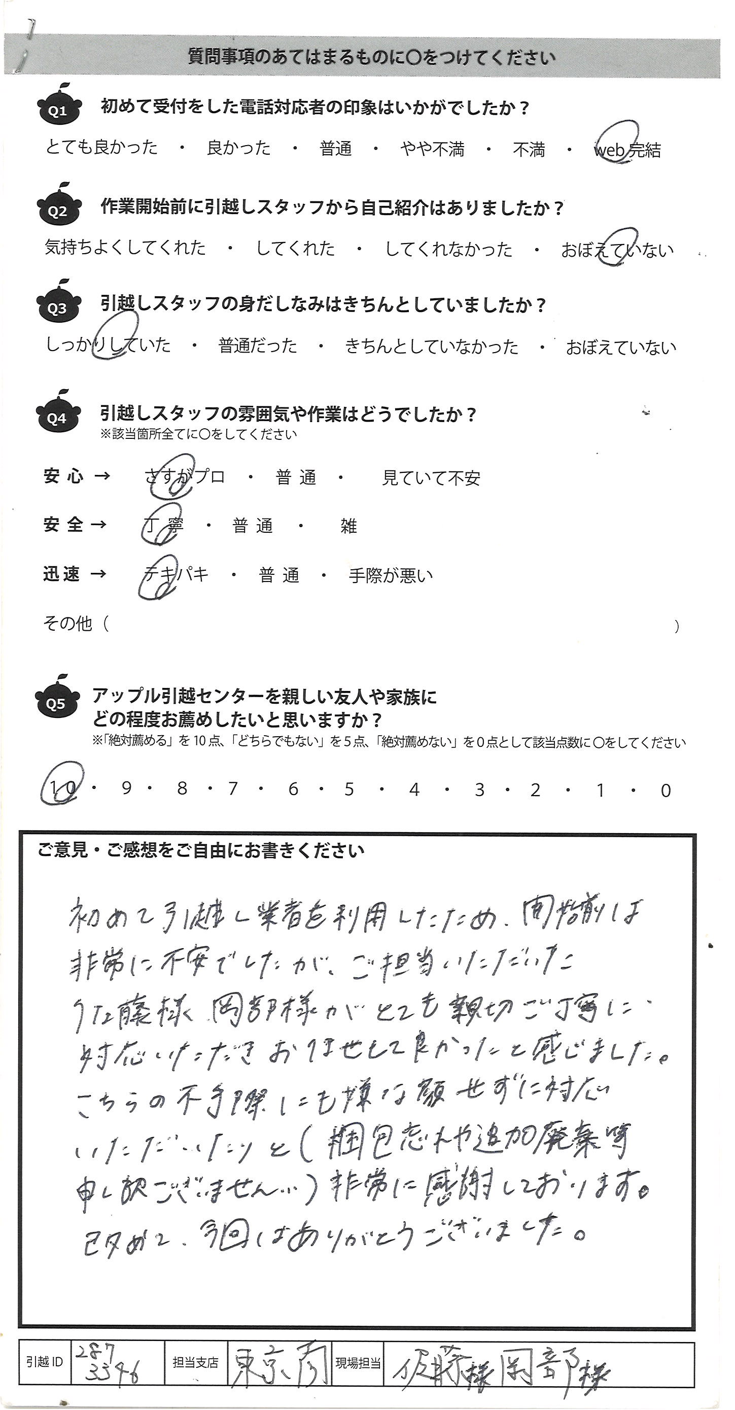 A.初めて引越し業者を利用したため、開始前は 非常に不安でしたが、ご担当いただいた 佐藤様岡部様がとても親切ご丁寧に、 対応いただきお任せして良かったと感じました。 こちらの不手際にも嫌な顔せずに対応 いただいたりと(梱包忘れや追加廃棄等 申し訳ございません…)非常に感謝しております。 改めて、今回はありがとうございました。