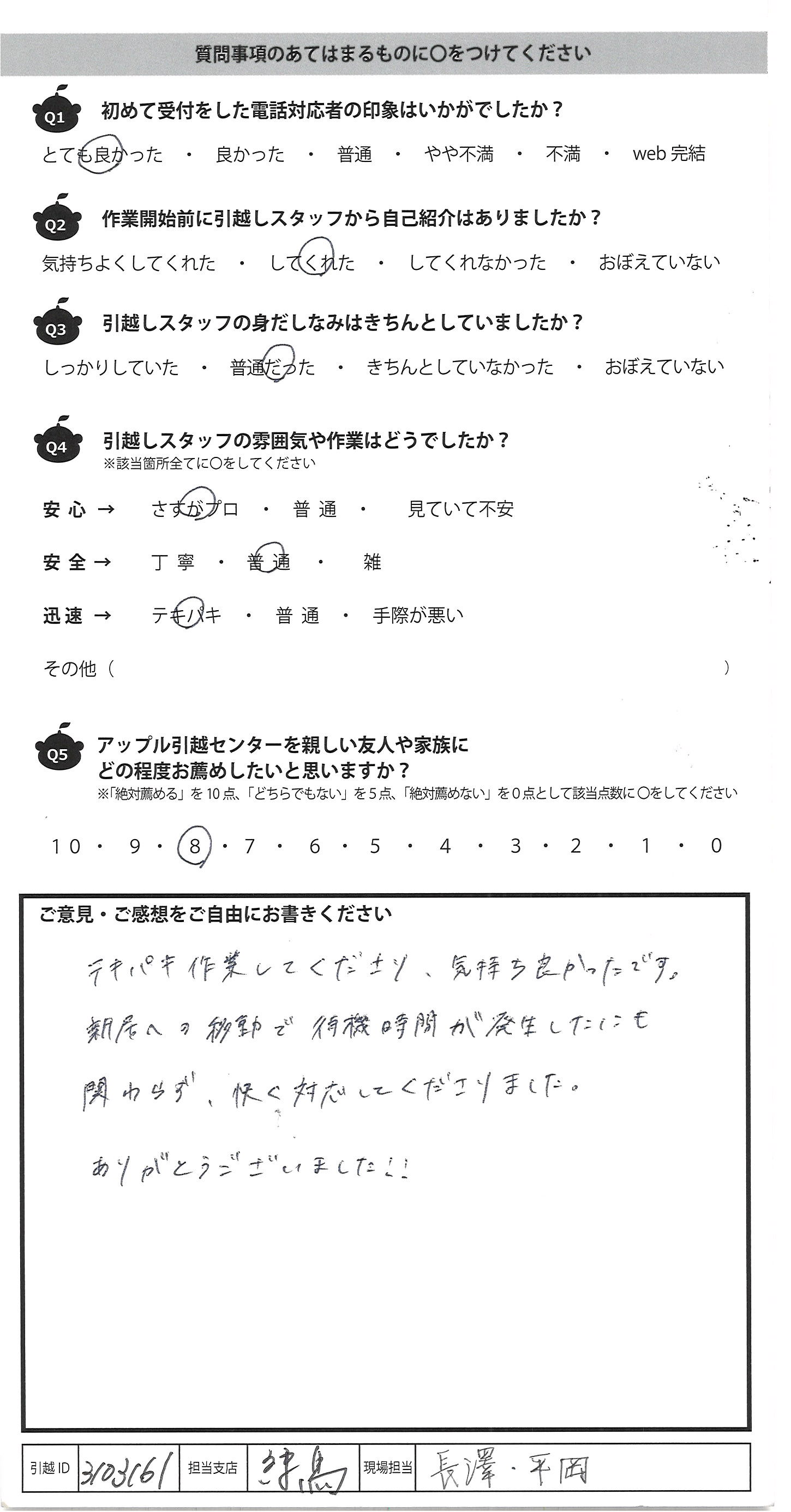 A.東京南支店の川崎さんが担当してくださいました。本当に素早く丁寧で、親切な対応で感謝しています。 当日スタッフさんが2名の予定が、もう1人のアルバイトさんが体調不良の為積み込み作業は1人で来てくださったのですが本当に素早く丁寧で驚きました。 新居に到着するともう1名アルバイトの方が急遽来てくださり助かりました。 私たちに丁寧に確認して、希望の部屋に設置をしてくださいました。 また、まだ洗濯機が届いていなかった為、ホースのタイプから「カサ上げをした方が良いかもしれないです」等アドバイスを下さったり洗濯機にもとても詳しく助かりました。 一緒にいた義理の両親も感心していました。 今回アップルさんにお願いしたのは2回目でした。持ち家を購入したのでもう引っ越す機会はないかもしれませんが友人には必ず紹介したいと思いました。 新生活のスタートを気持ちよく始められて本当によかったです。 ありがとうございました。