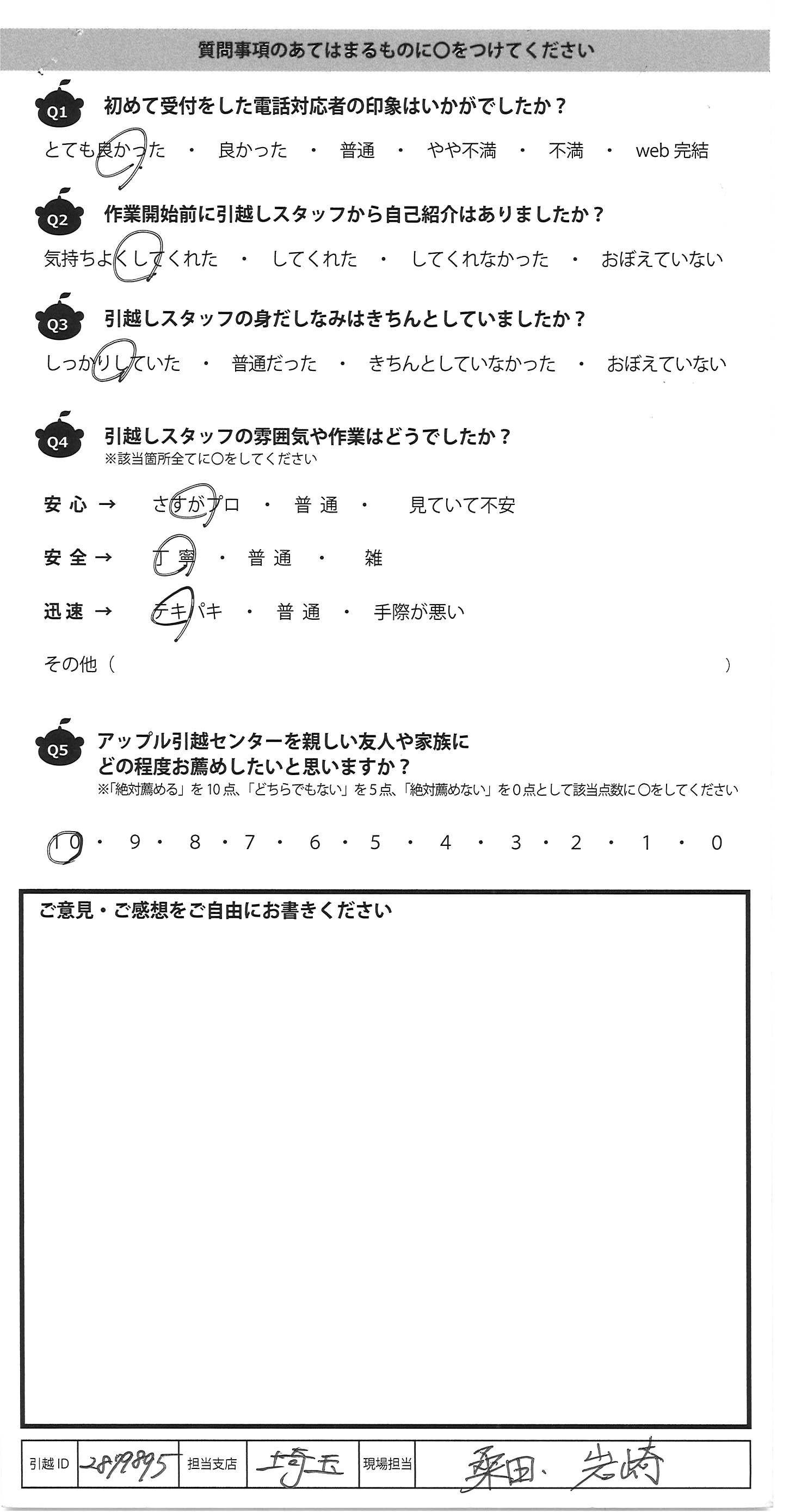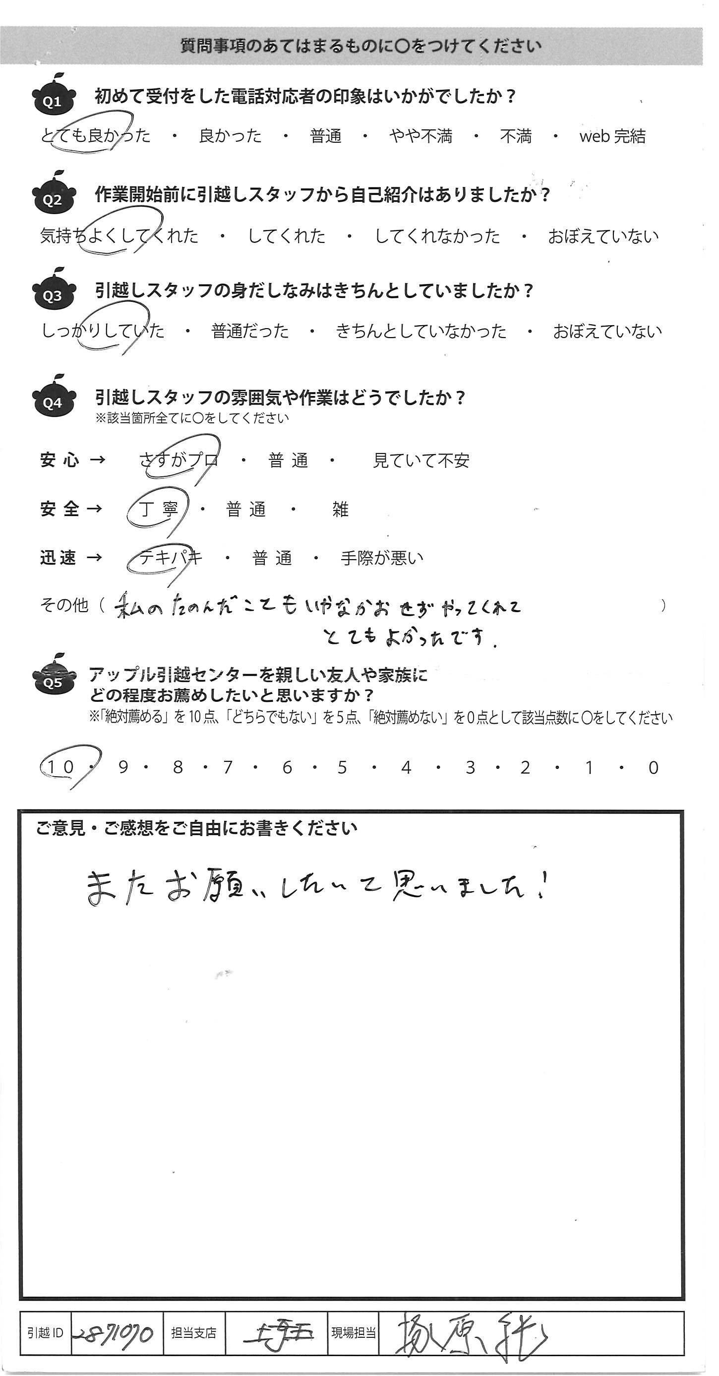 A.事前にお電話をいただいた際、とても対応がよかったので 御社にお願いしようと決めました。 当日のスタッフの方もとても丁寧で、たくさん荷物が ありましたが、嫌な顔せず対応していただきました。 大変お世話になり、誠にありがとうございました。