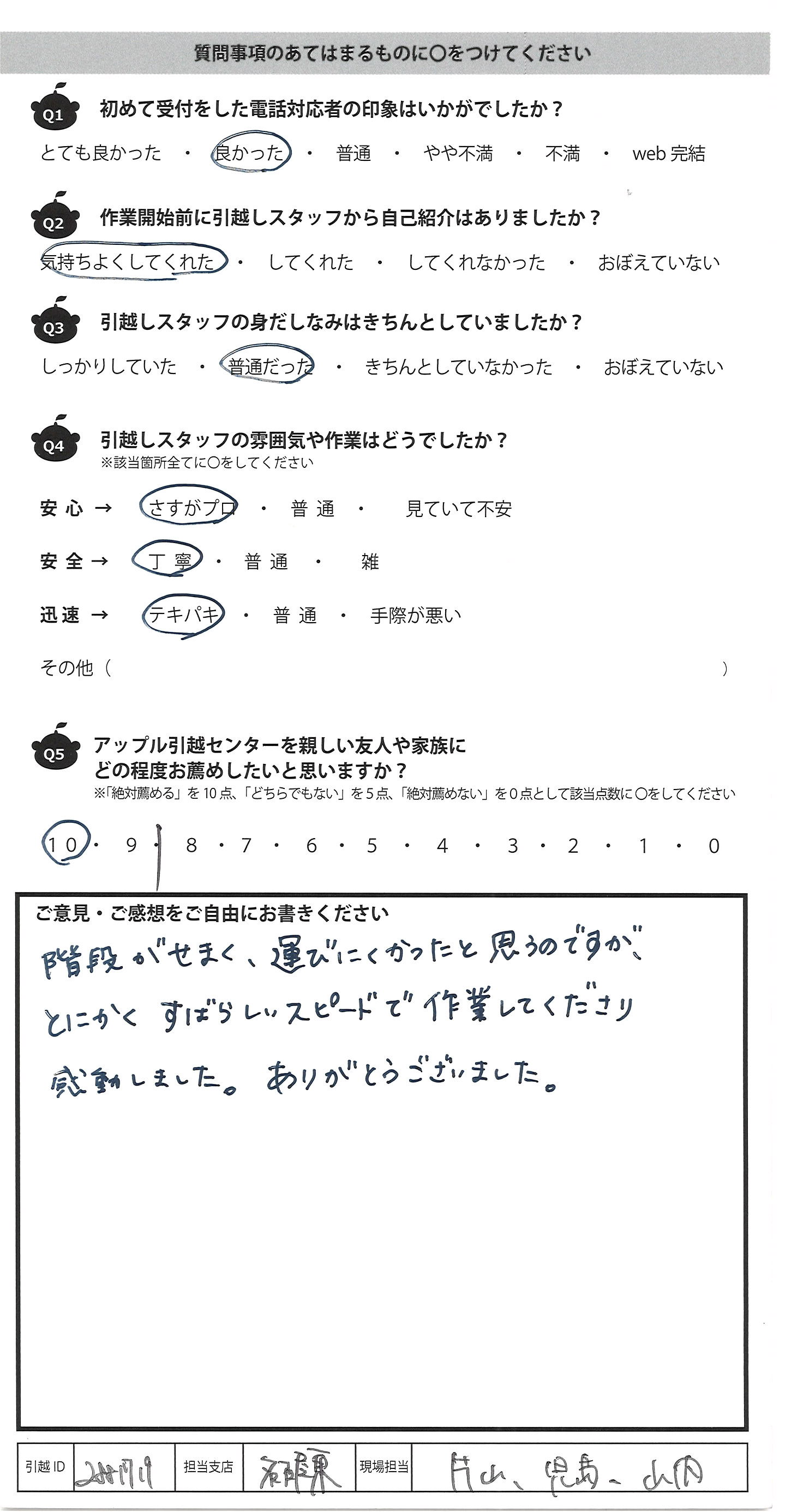 A.階段がせまく、運びにくかったと思うのですが、 とにかくすばらしいスピードで作業してくださり 感動しました。ありがとうございました。