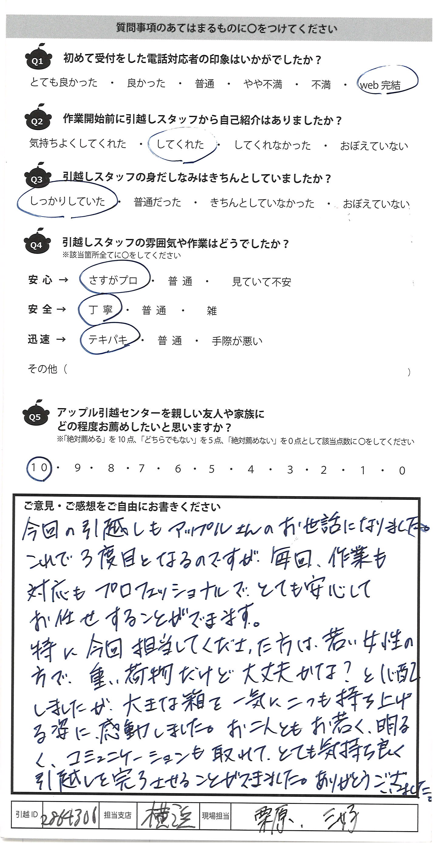 A.今回の引越しもアップルさんのお世話になりました。 これで3度目となるのですが、毎回、作業も 対応もプロフェッショナルで、とても安心して お任せすることができます。 特に今回担当してくださった方は、若い女性の 方で、重い荷物だけど大丈夫かな?と心配 しましたが、大きな箱を一気に二つも持ち上げ る姿に感動しました。お二人ともお若く、明る く、コミネケーションも取れて、とても気持ち良く 引越しを完了させることができました。ありがとうございました。