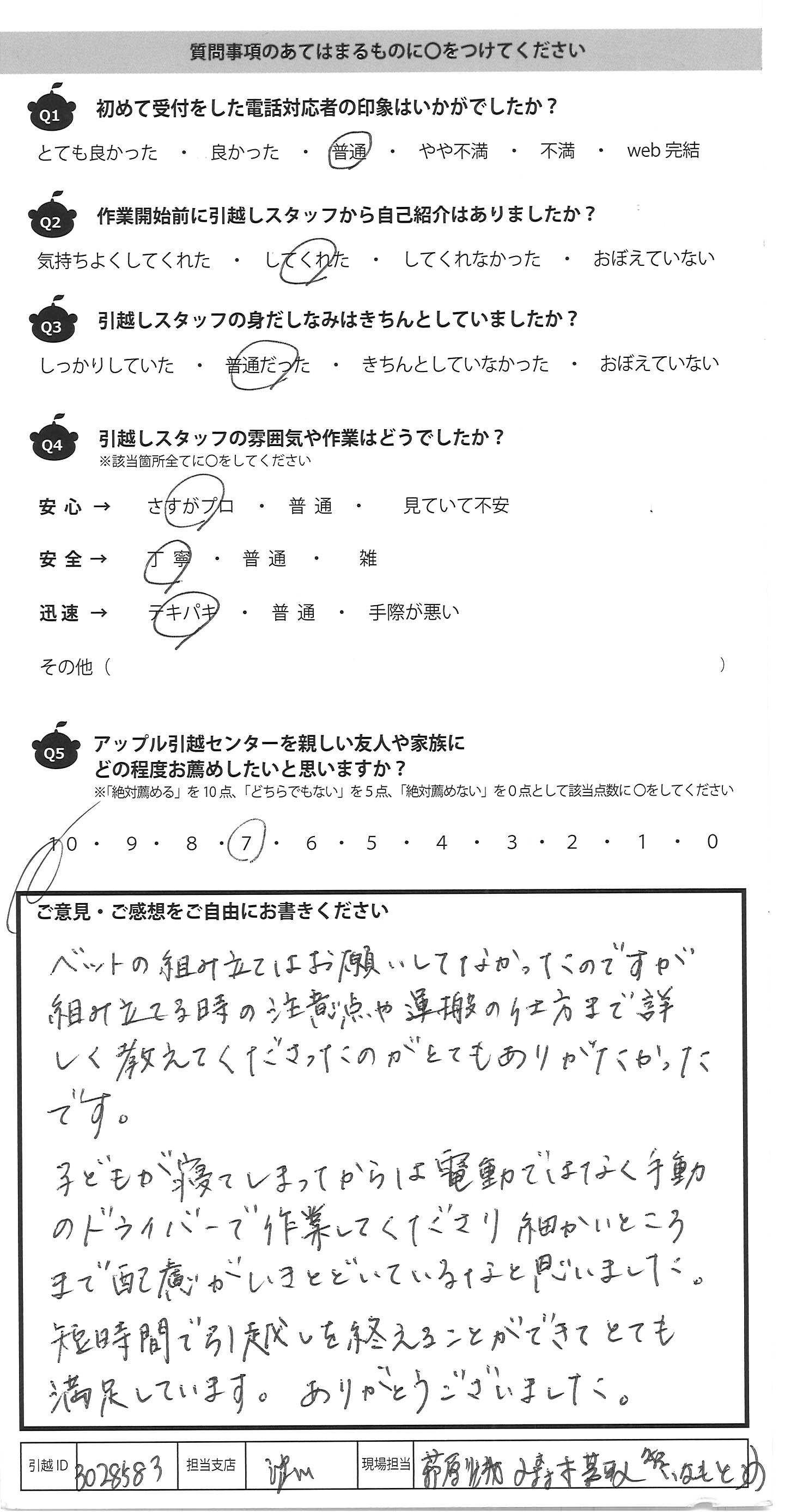 A.ベットの組み立てはお願いしてなかったのですが 組み立てる時の注意点や運搬の仕方まで詳 しく教えてくださったのがとてもありがたかった です。 子どもが寝てしまってからは電動ではなく手動 のドライバーで作業してくださり細かいところ まで配慮がいきとどいているなと思いました。 短時間で引越しを終えることができてとても 満足しています。ありがとうございました。