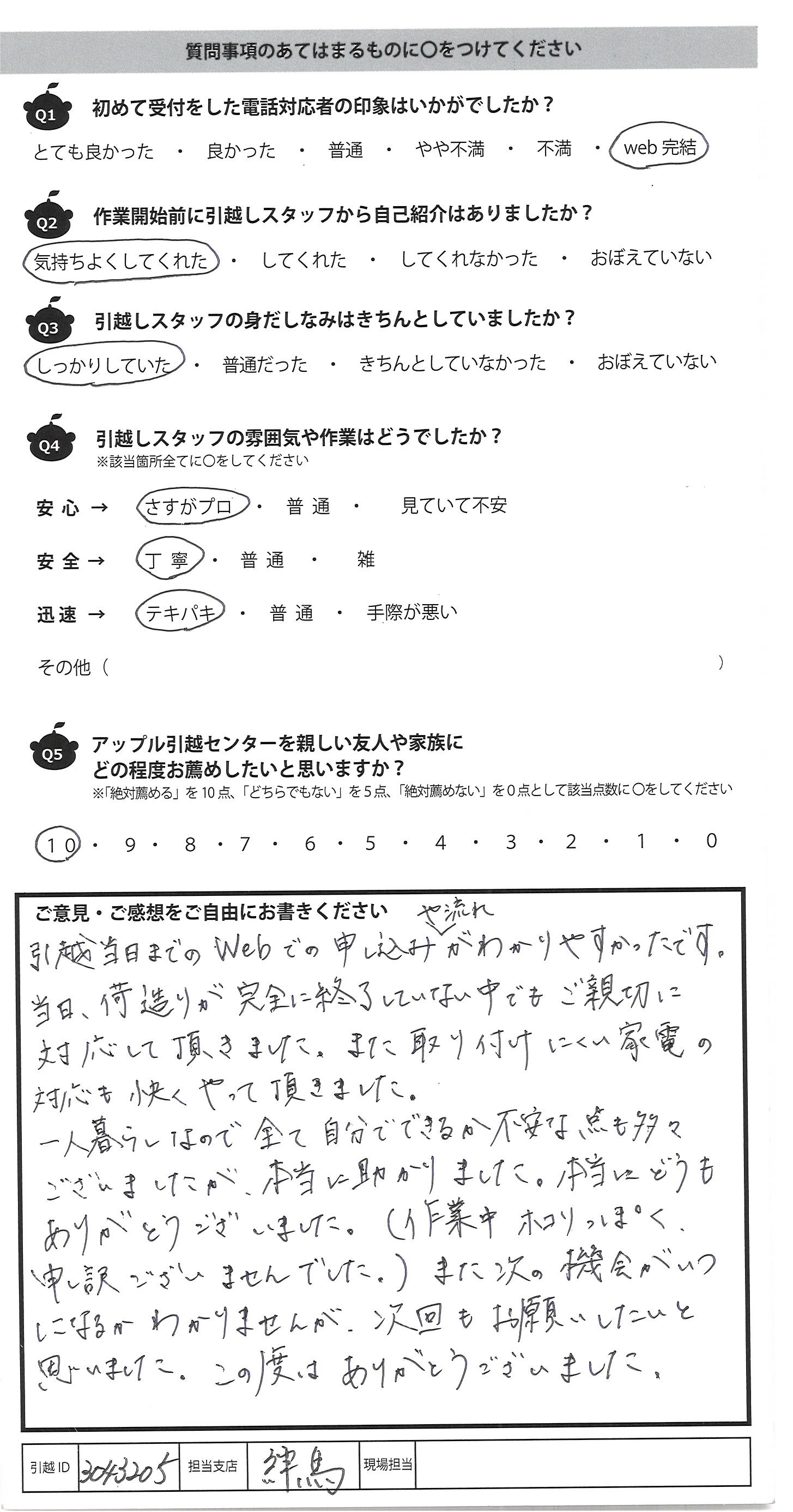 A.引越当日までのWebでの申し込みや流れがわかりやすかったです。 当日、荷造りが完全に終了していない中でもご親切に 対応して頂きました。また取り付けにくい家電の 対応も快くやって頂きました。 一人暮らしなので全て自分でできるか不安な点も多々 ございましたが、本当に助かりました。本当にどうも ありがとうございました。(作業中ホコリっぽく 申し訳ございませんでした。)また次の機会がいつ になるかわかりませんが、次回もお願いしたいと 思いました。この度はありがとうございました。