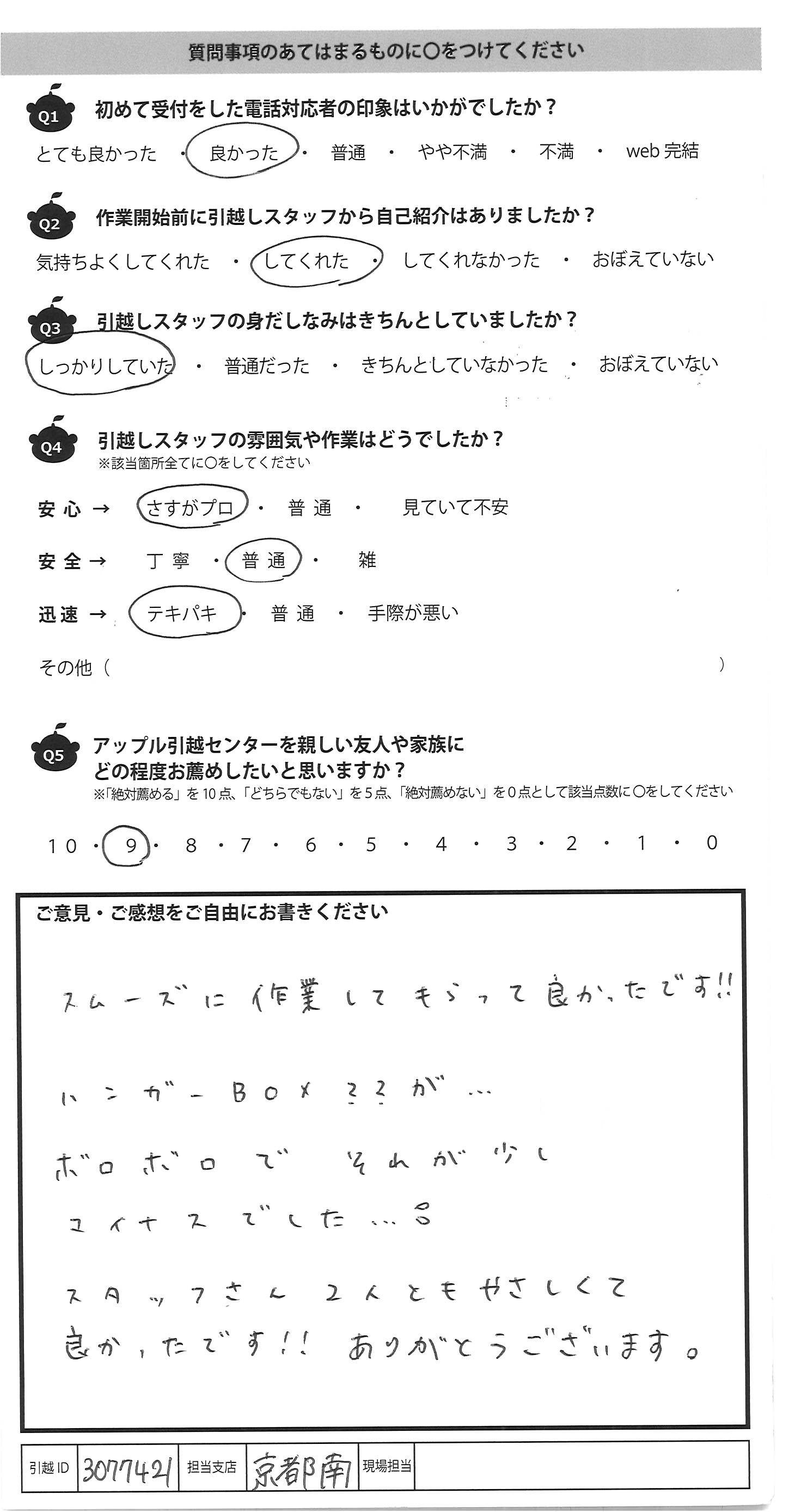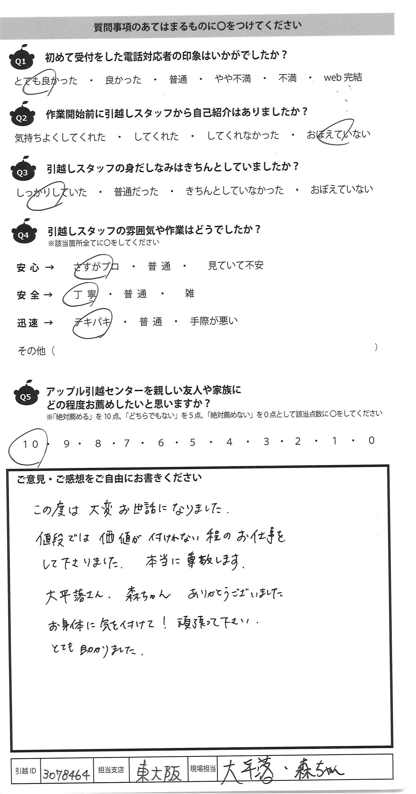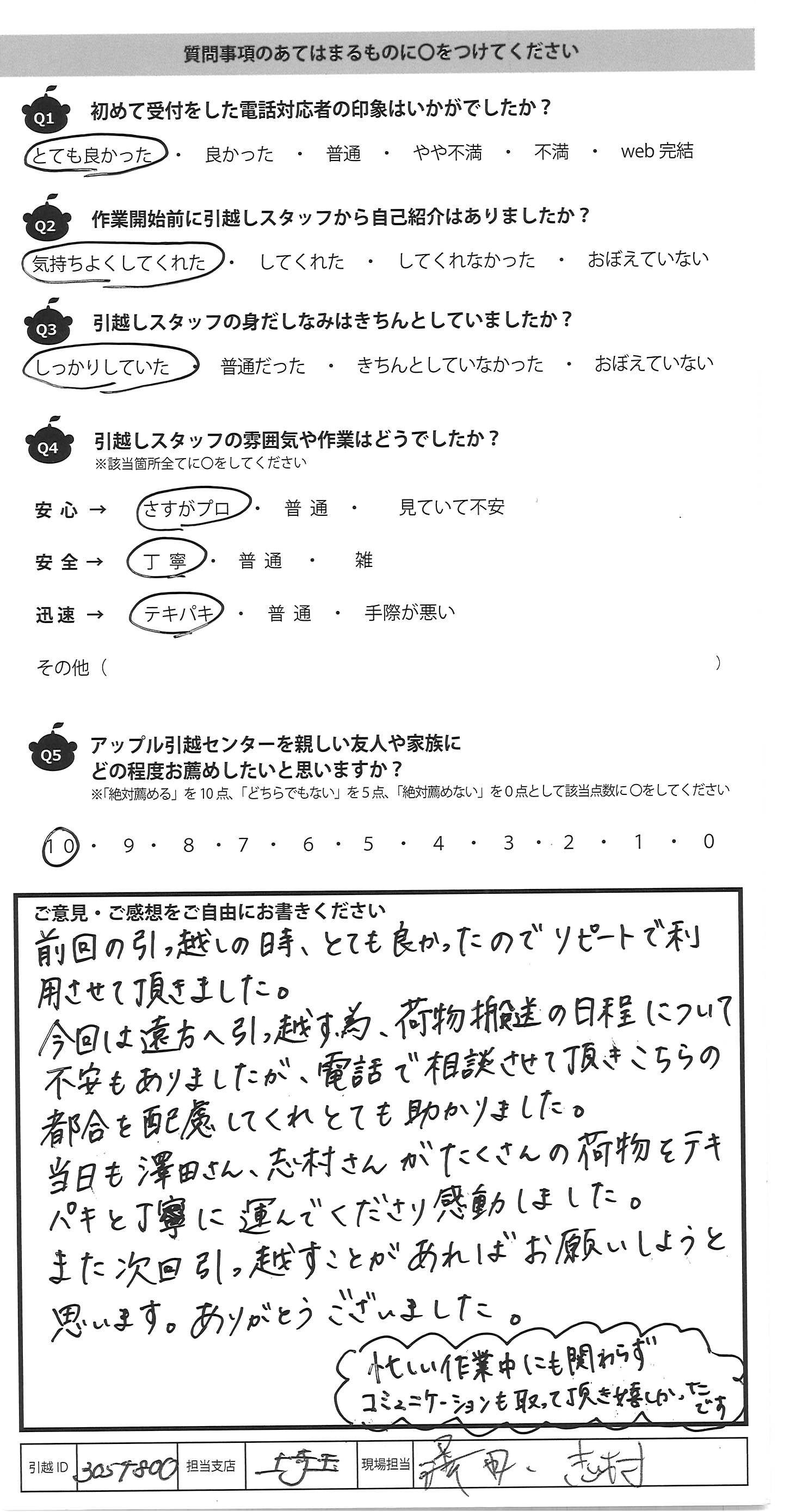 A.前回の引っ越しの時、とても良かったのでリピートで利 用させて頂きました。 今回は遠方へ引っ越す為、荷物搬送の日程について 不安もありましたが、電話で相談させて頂きこちらの 都合を配慮してくれとても助かりました。 当日も澤田さん、志村さんがたくさんの荷物をテキ パキと丁寧に運んでくださり感動しました。 また次回引っ越すことがあればお願いしようと 思います。ありがとうございました。 忙しい作業中にも関わらず コミュニケーションも取って頂き嬉しかったです