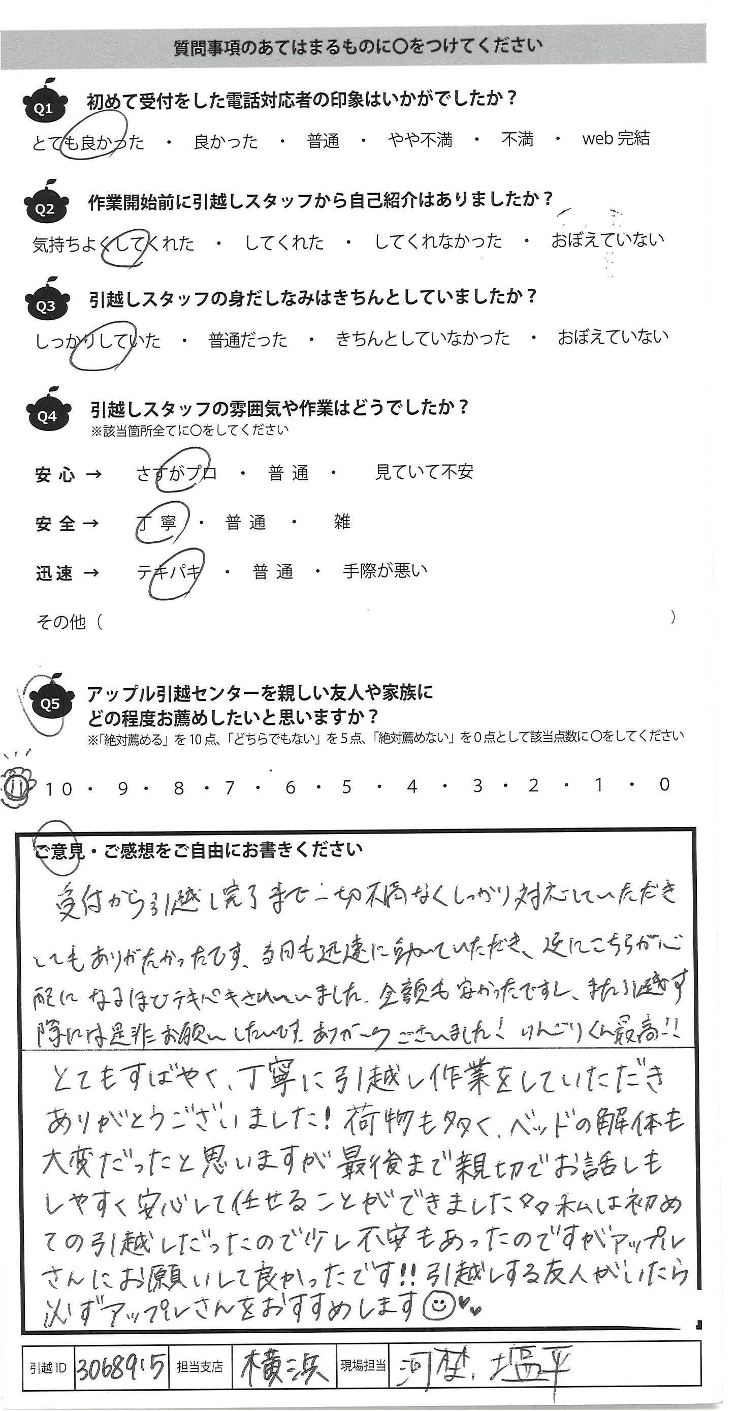 A.当日、臨機応変にお願いしたことにも 心よく応対いただきとても助かりました はじめの電話対応も初めての引越しで 不安がいっぱいでどちらの業者様にしようか 悩んでいましたが、親身になって色々教えて 下さったのでお願いしたいとすぐに思いました。 当日担当して下さったお二人もとても親切に 対応下さり、お二人にお願いできて本当に 良かったと心から感じました。初めての引越し でしたが最後までとても丁寧な対応で とても満足です!ありがとうございました!