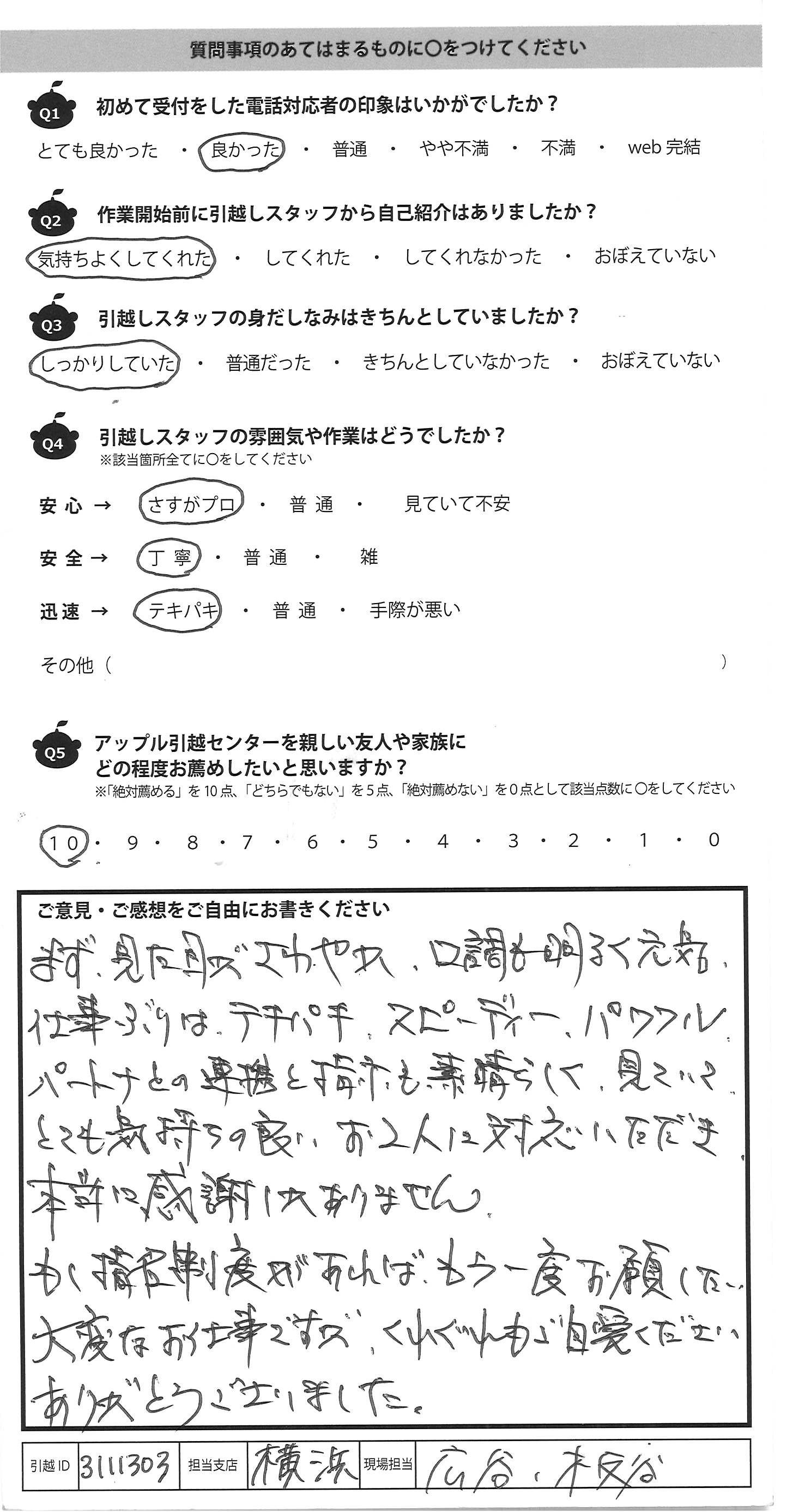 A.まず、見た目がさわやか、口調も明るく元気 仕事ぶりは、テキパキ、スピーディー、パワフル、 パートナとの連携と指示も素晴らしく、見ていて、 とても気持ちの良い、お2人に対応いただき、 本当に感謝しかありません。 もし指名制度があれば、もう一度お願したい 大変なお仕事ですが、くれぐれもご自愛ください ありがとうございました。