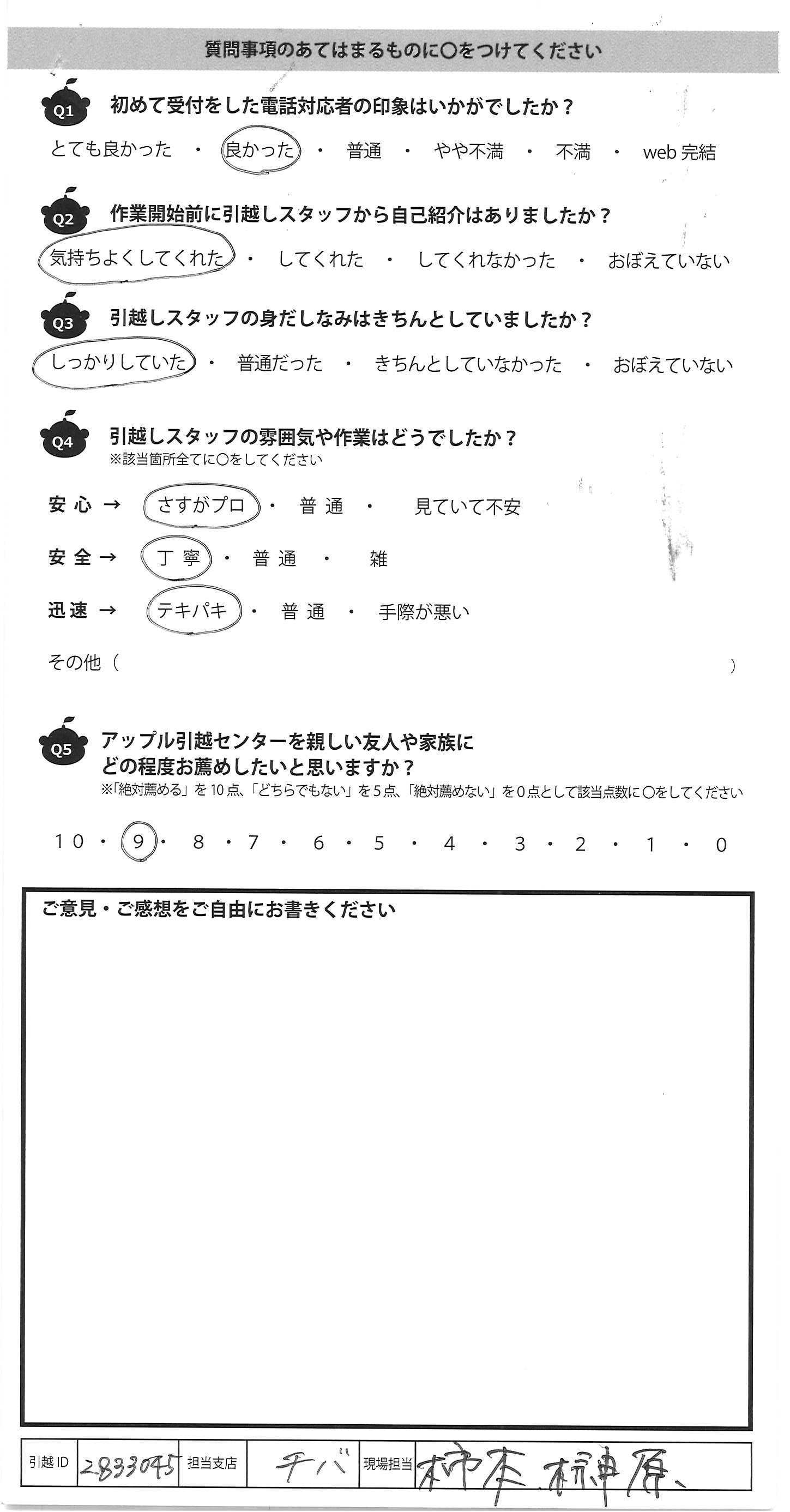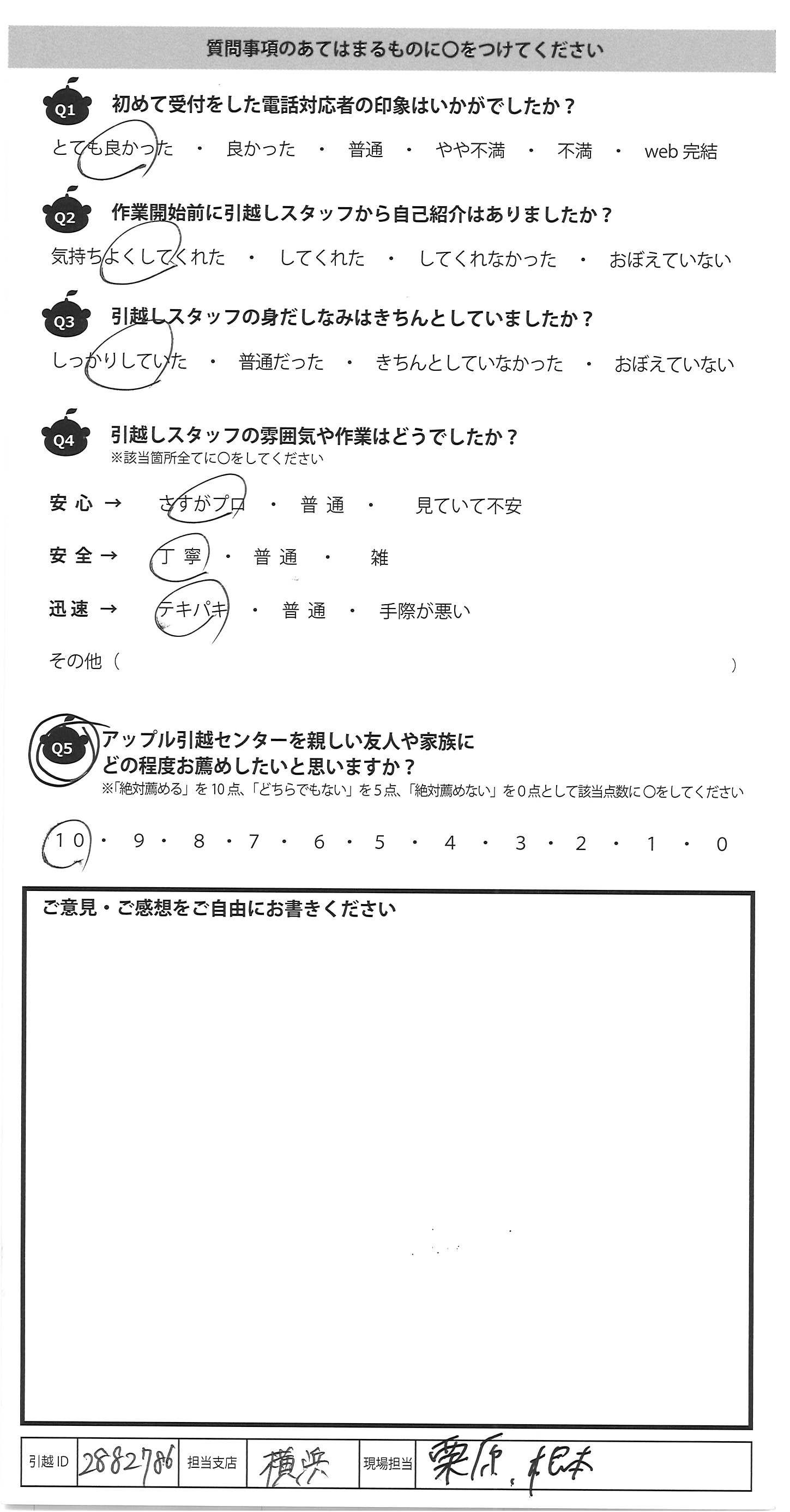 A.引っ越し前はやや不安でしたが、引っ越し後には、また次もお願いしようと思えました。 とても迅速で丁寧で、本当に助かりました。