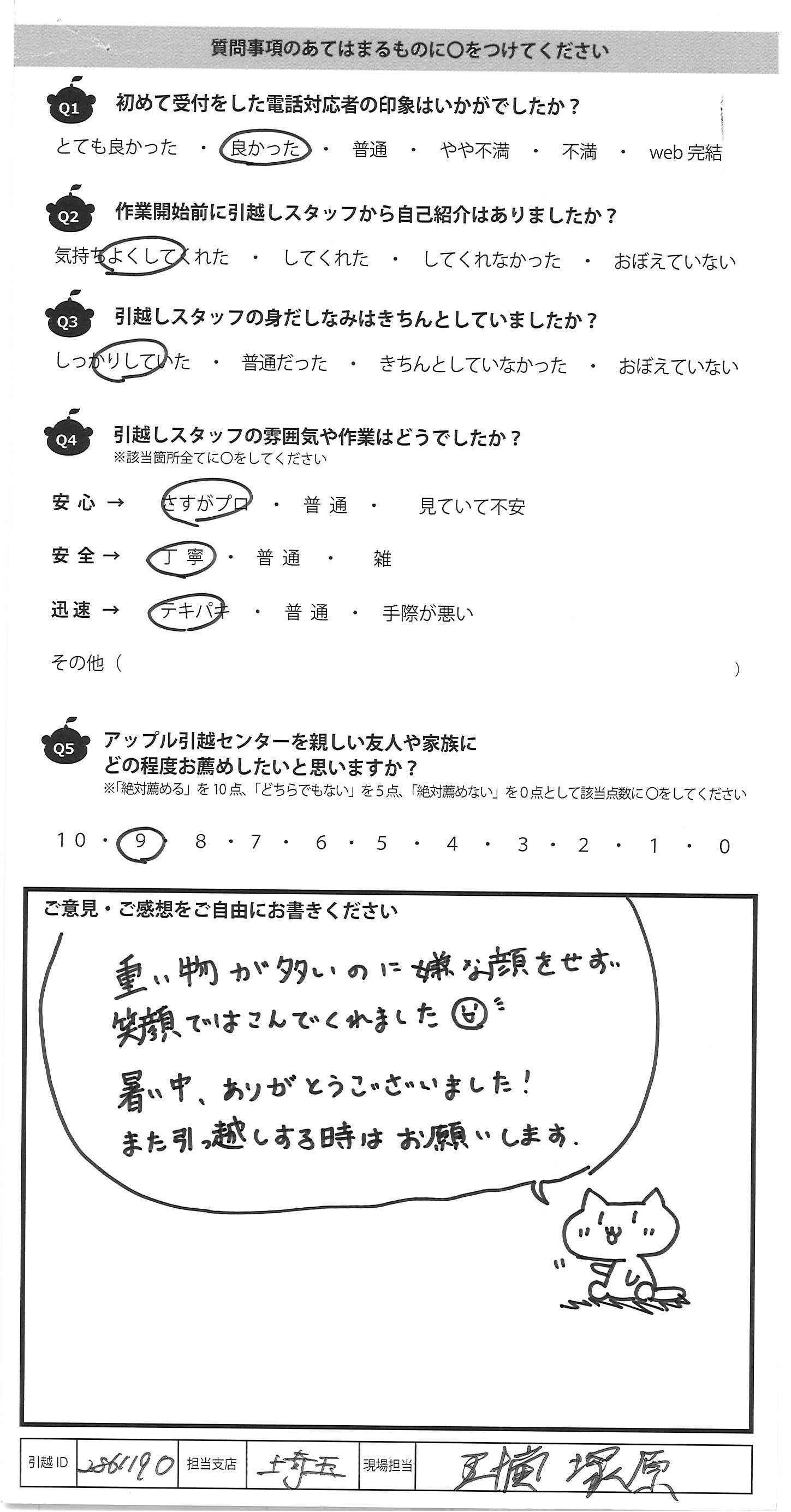 A.重い物が多いのに嫌な顔をせず 笑顔ではこんでくれました 暑い中、ありがとうございました! また引っ越しする時はお願いします。