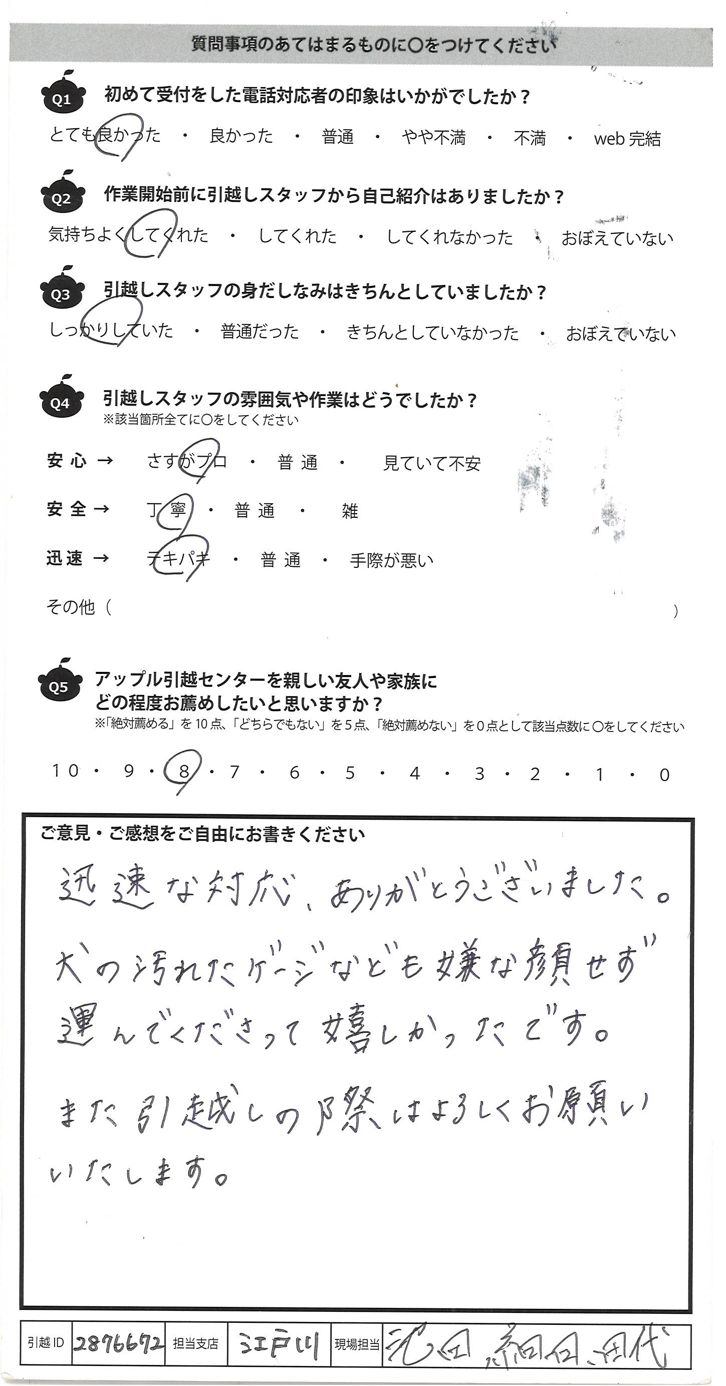A.迅速な対応、ありがとうございました。 犬の汚れたゲージなども嫌な顔せず 運んでくださって嬉しかったです。 また引越しの際はよろしくお願い いたします。