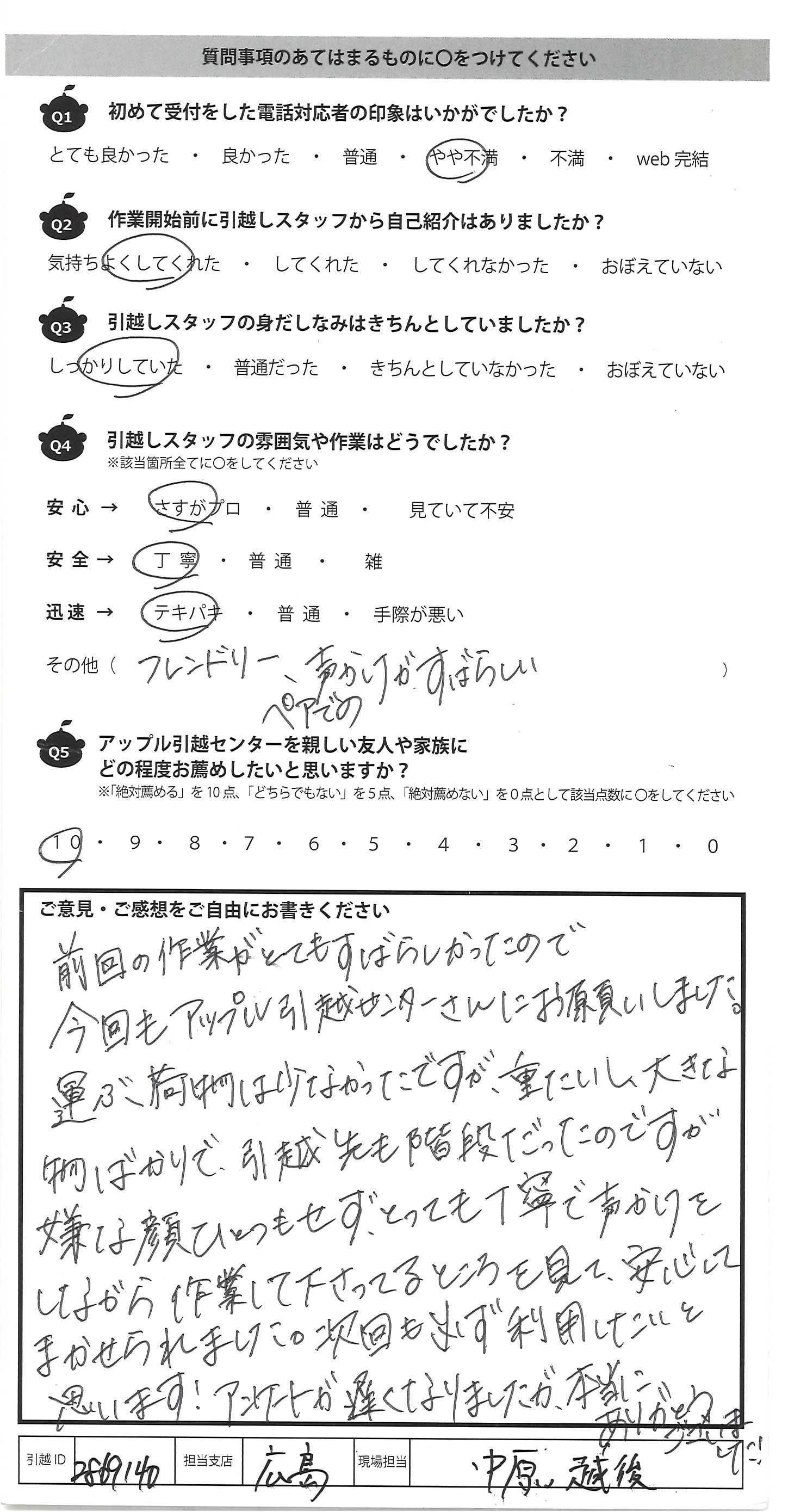 A.今回初めての引越しだったが不安なく作業をして頂き、 大変助かりました。 丁寧な作業で会話もして頂き気持ち良く 引っ越しを終えることができました。 全てにおいてアップル引越センター様に依頼して良かったと 思えました。