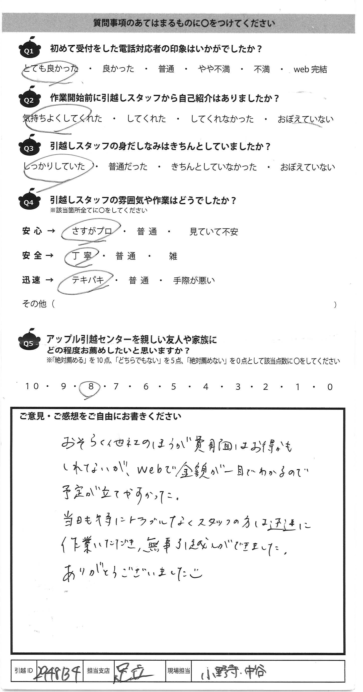 A.webで引越し申し込み後、細々とした質問を チャットで手軽にさせていただくことができ、回答も 素早く頂けたのがありがたかったです。 当日も非常にスムーズに作業してくださり、 気持ちよく引越しを終えることができました。 次回引越しをする時もぜひお願いしたいです!