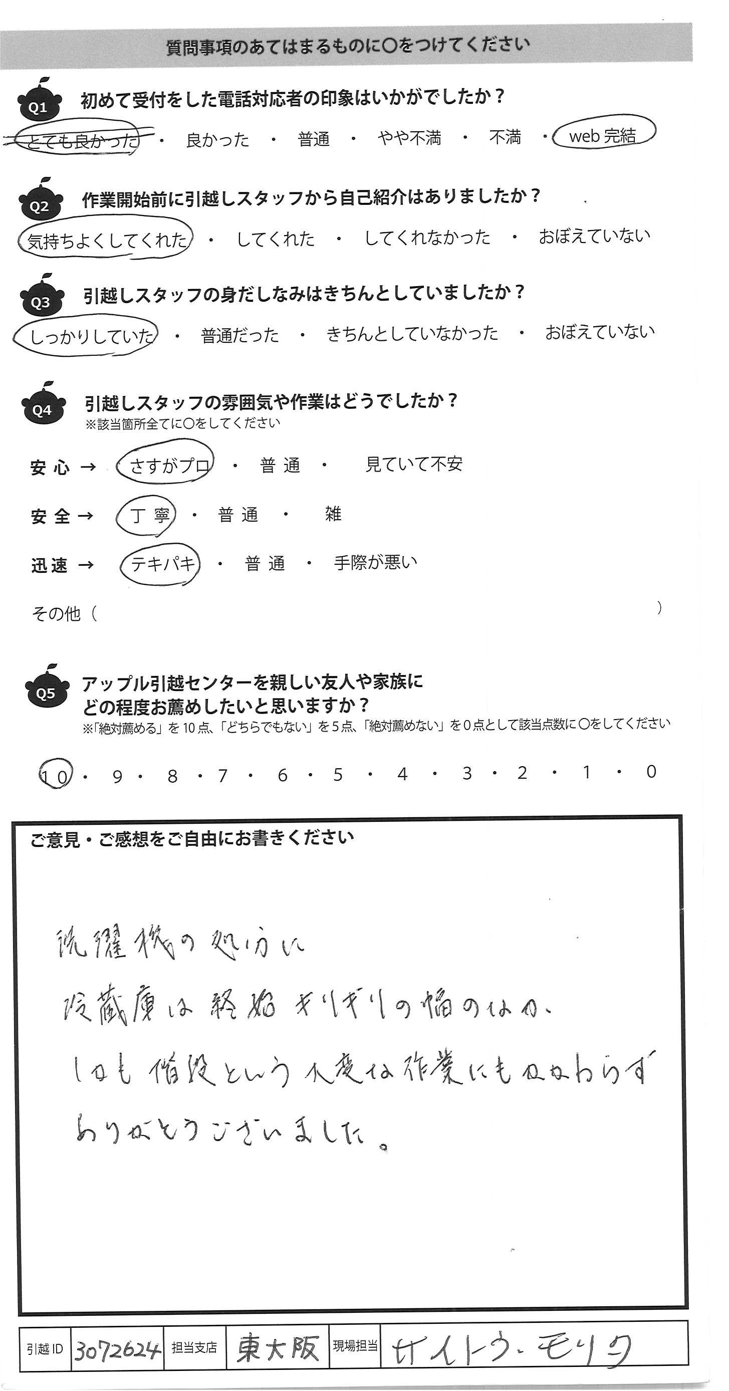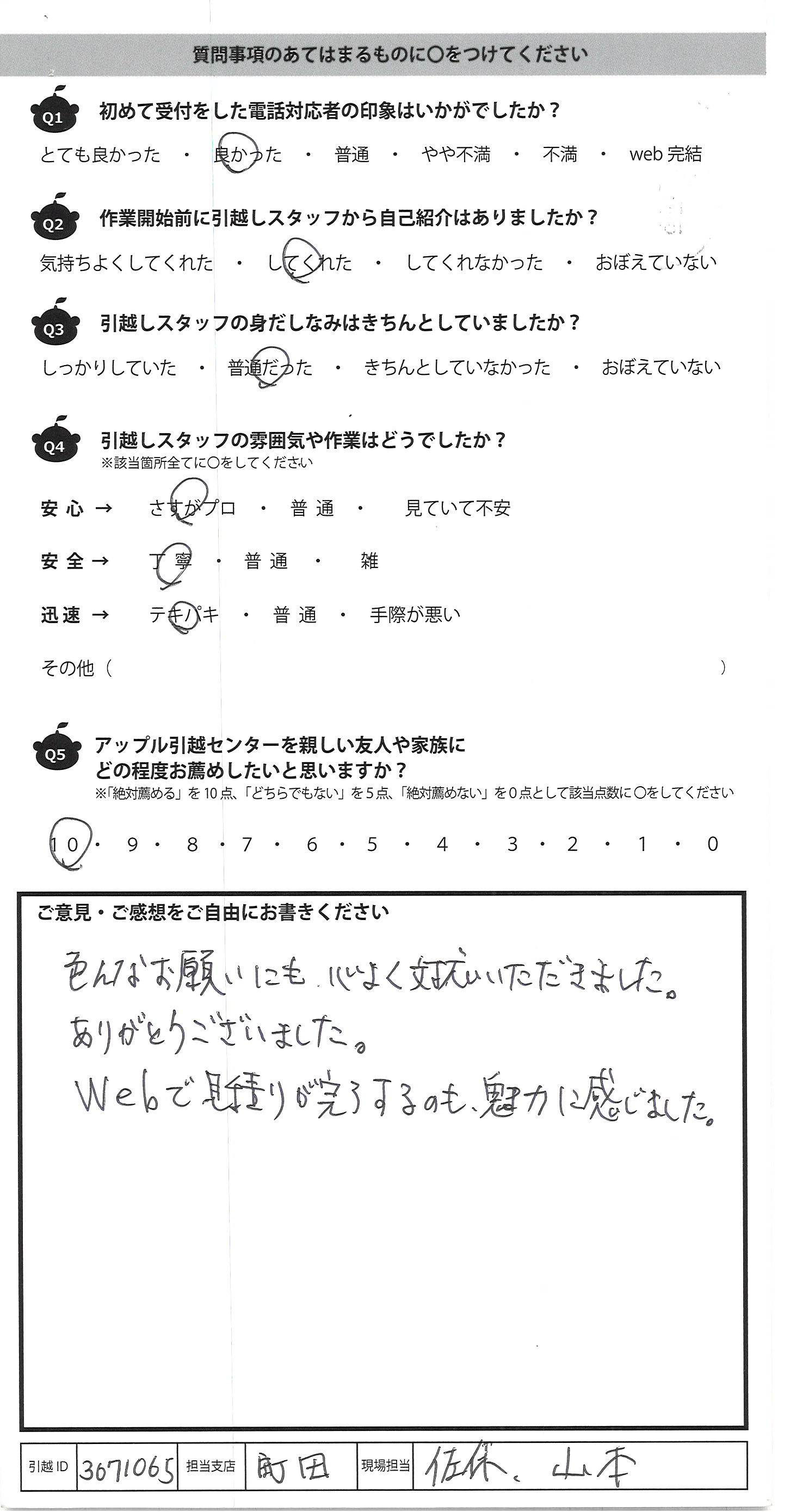 A.今まで多くの会社(ひっこし会社)を利用してきた が、料金も内容も1番でした。 3人とも、優しく、明るく、話しやすくて、とても安心 できた。次ひっこす時も利用したいと思うし 友人にもすすめたいと思う。 とても頼りになりました。 ありがとうございました。