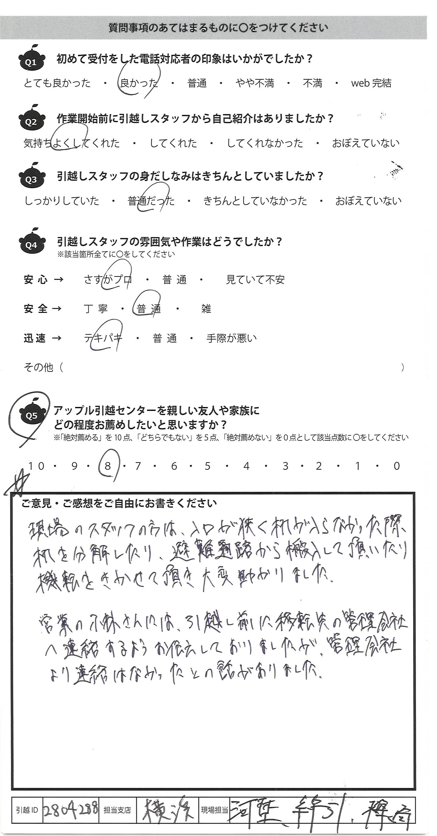 A.現場のスタッフの方は、入口が狭く机が入らなかった際 机を分解したり、避難経路から搬入して頂いたり 機転をきかせて頂き大変助かりました。 営業の小林さんには、引越し前に移転先の管理会社 へ連絡するようお伝えしておりましたが、管理会社 より連絡はなかったとの話がありました。