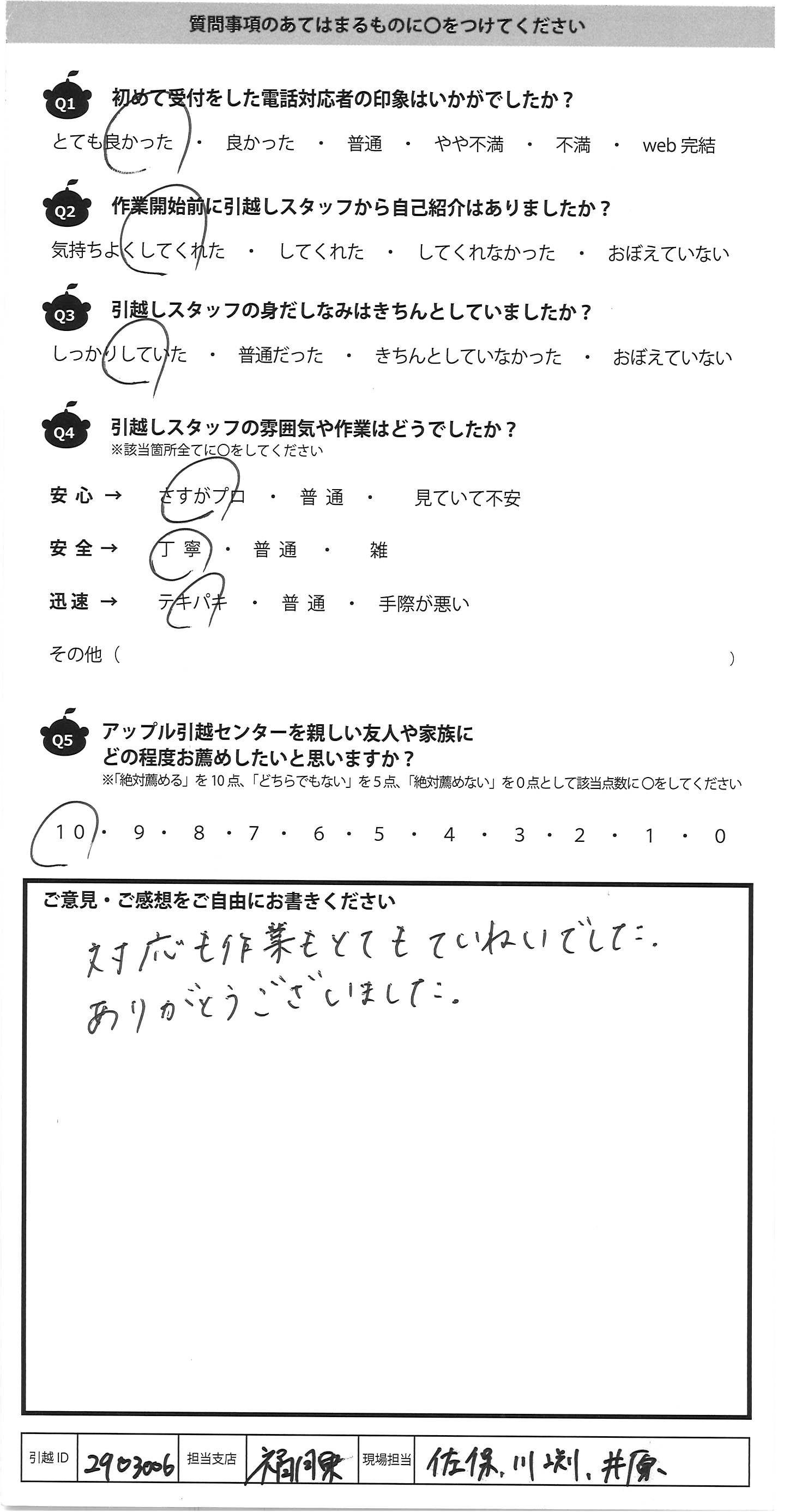A.酷暑の中、皆様明るく迅速に作業して頂けました。 期待していなかった洗濯機の取り付けまでして頂いてとても感謝です。 また引越しの際はお願いしたいと思います。