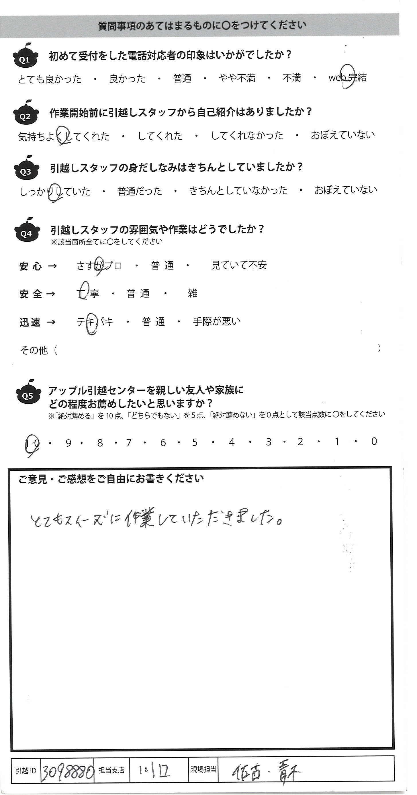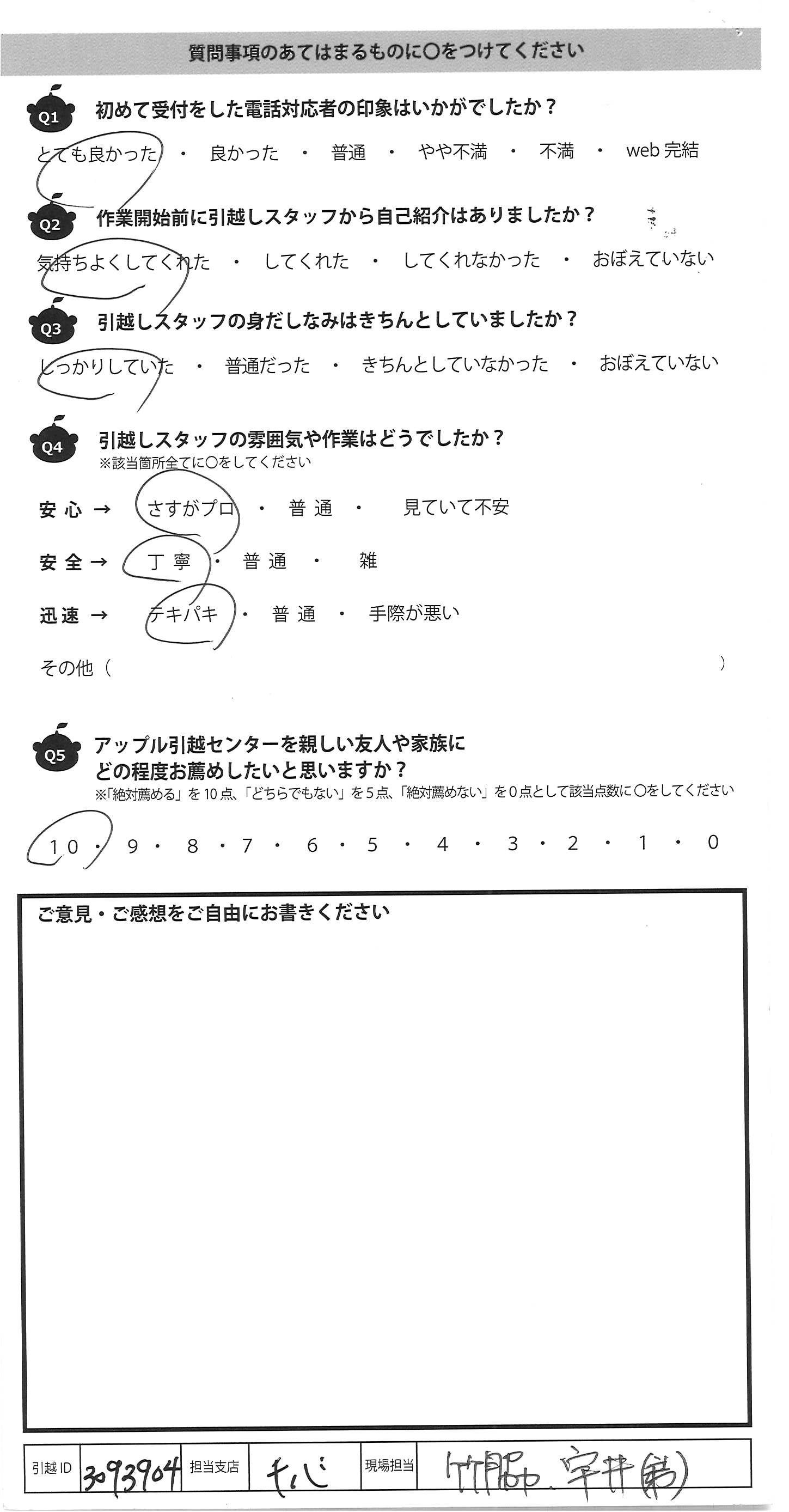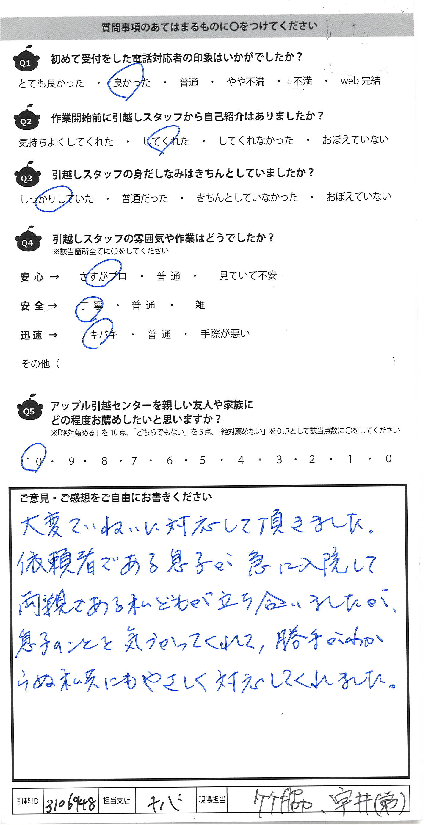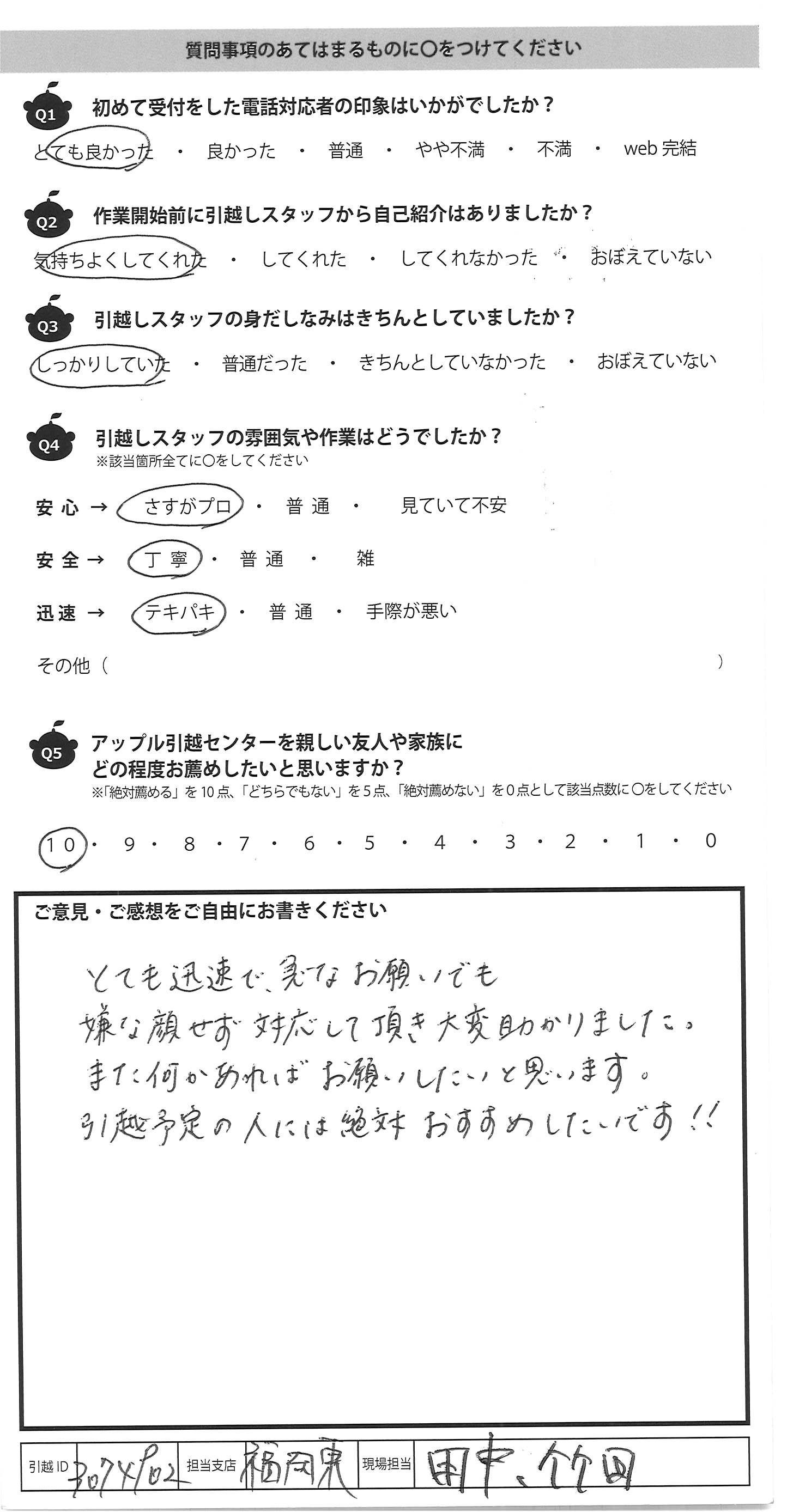 A.引っ越し後の対応が迅速で丁寧でありがたかったです。
