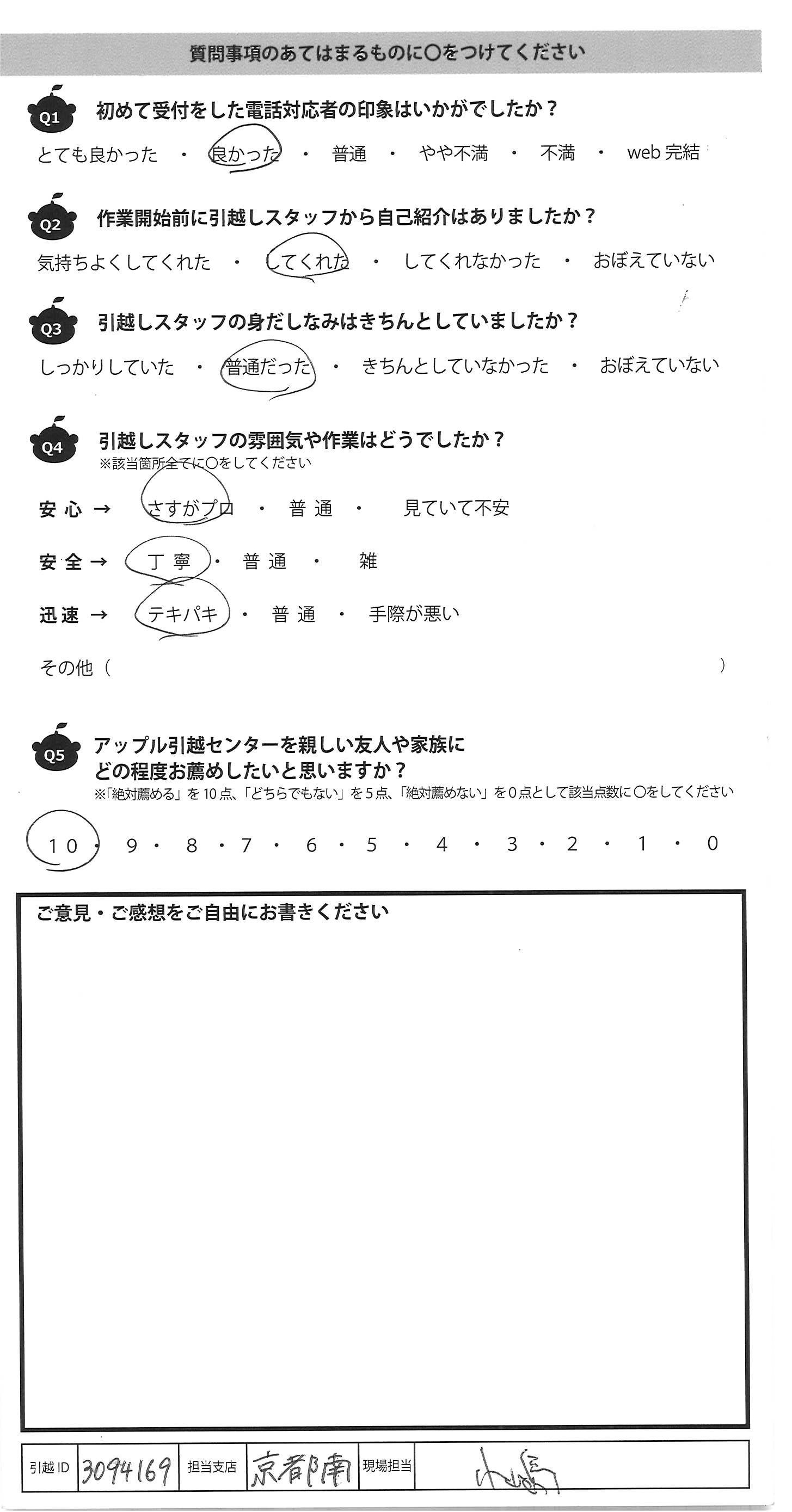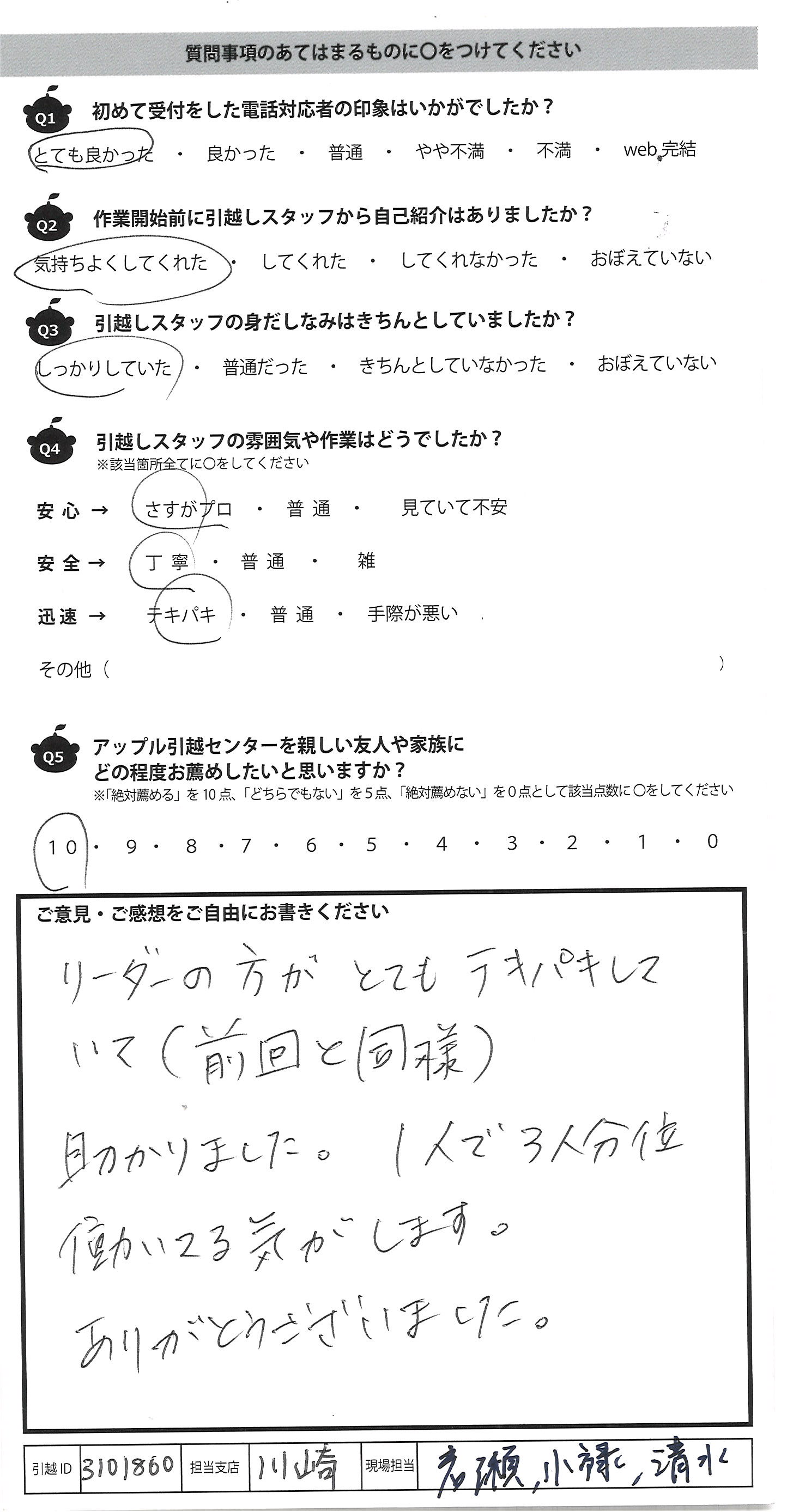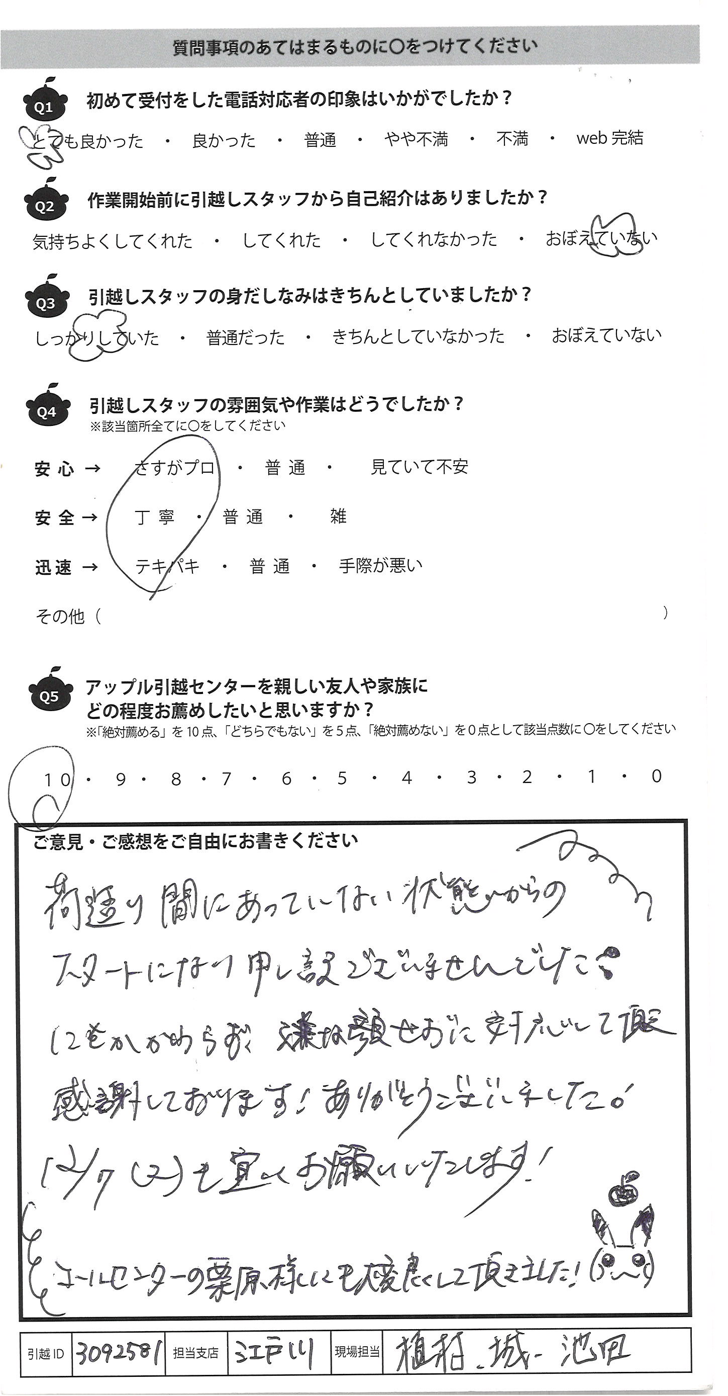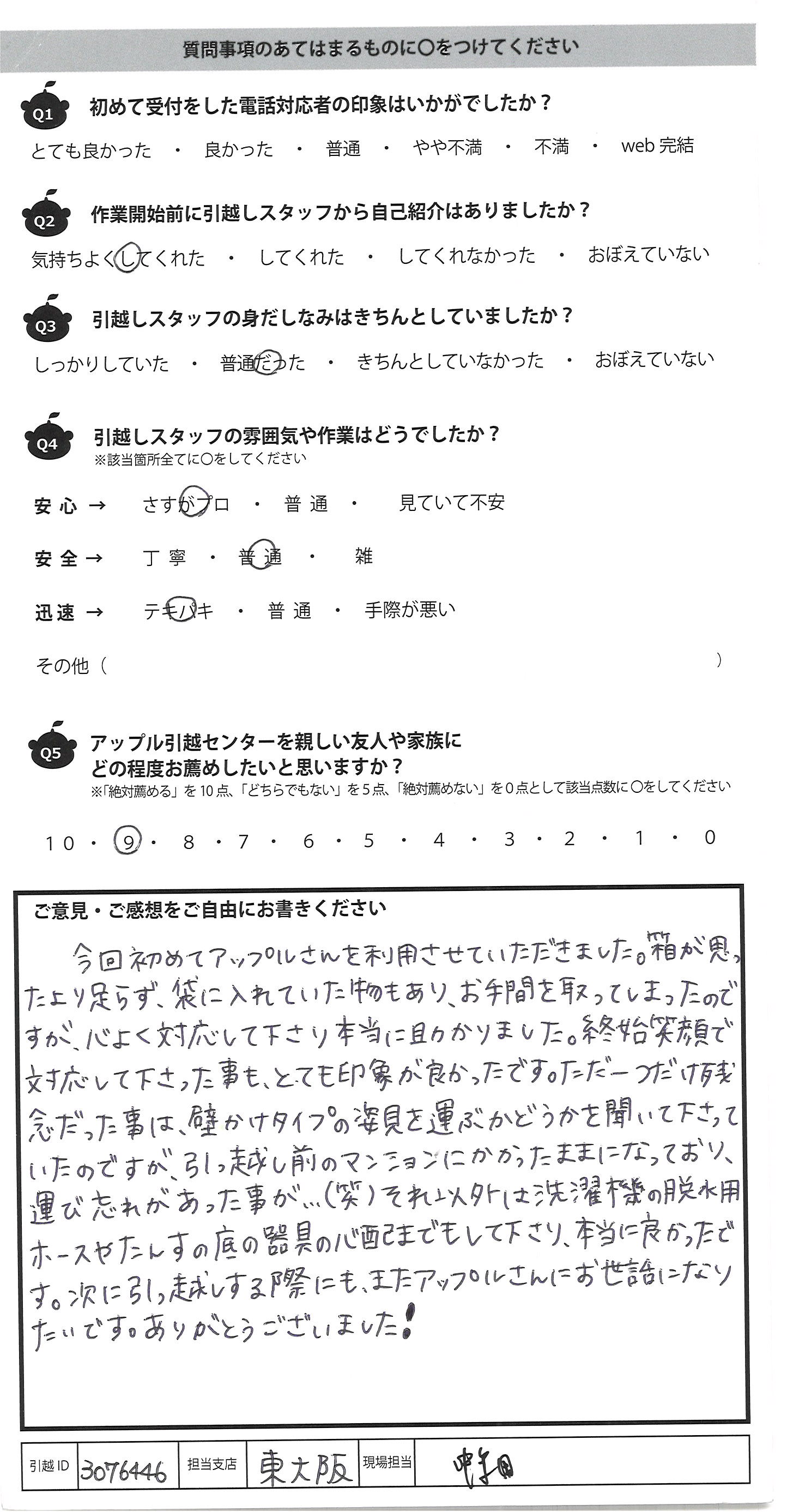 A.今回初めてアップルさんを利用させていただきました。箱が思っ たより足らず、袋に入れていた物もあり、お手間を取ってしまったので すが、心よく対応して下さり本当に助かりました。終始笑顔で 対応して下さった事も、とても印象が良かったです。ただ一つだけ残 念だった事は、壁かけタイプの姿見を運ぶかどうか聞いて下さって いたのですが、引っ越し前のマンションにかかったままになっており、 運び忘れがあった事が…(笑)それ以外は洗濯機の脱水用 ホースやたんすの底の器具の心配までもして下さり、本当に良かったで す。次に引っ越しする際にも、またアップルさんにお世話になり たいです。ありがとうございました!