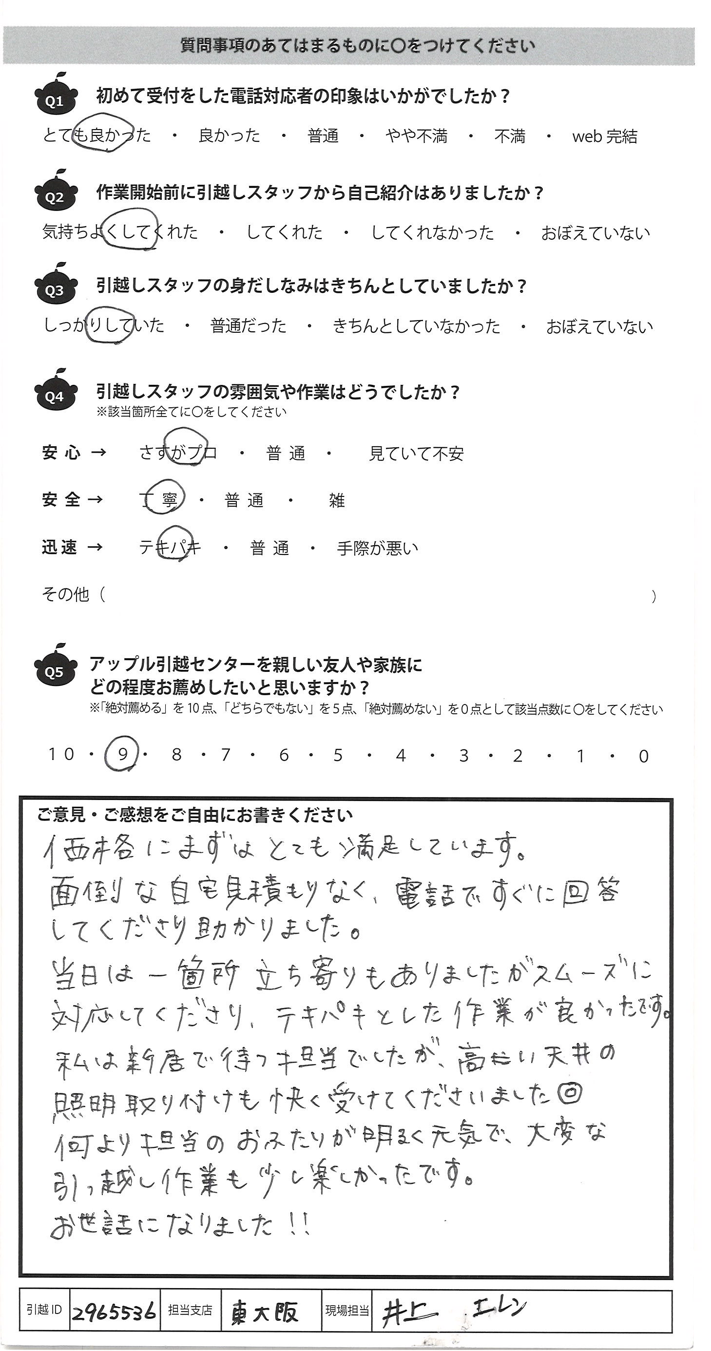 A.価格にまずはとても満足しています。 面倒な自宅見積もりなく、電話ですぐに回答 してくださり助かりました。 当日は一箇所立ち寄りもありましたがスムーズに 対応してくださり、テキパキとした作業が良かったです。 私は新居で待つ担当でしたが、高い天井の 照明取り付けも快く受けてくださいました◎ 何より担当のおふたりが明るく元気で、大変な 引っ越し作業も少し楽しかったです。 お世話になりました!!