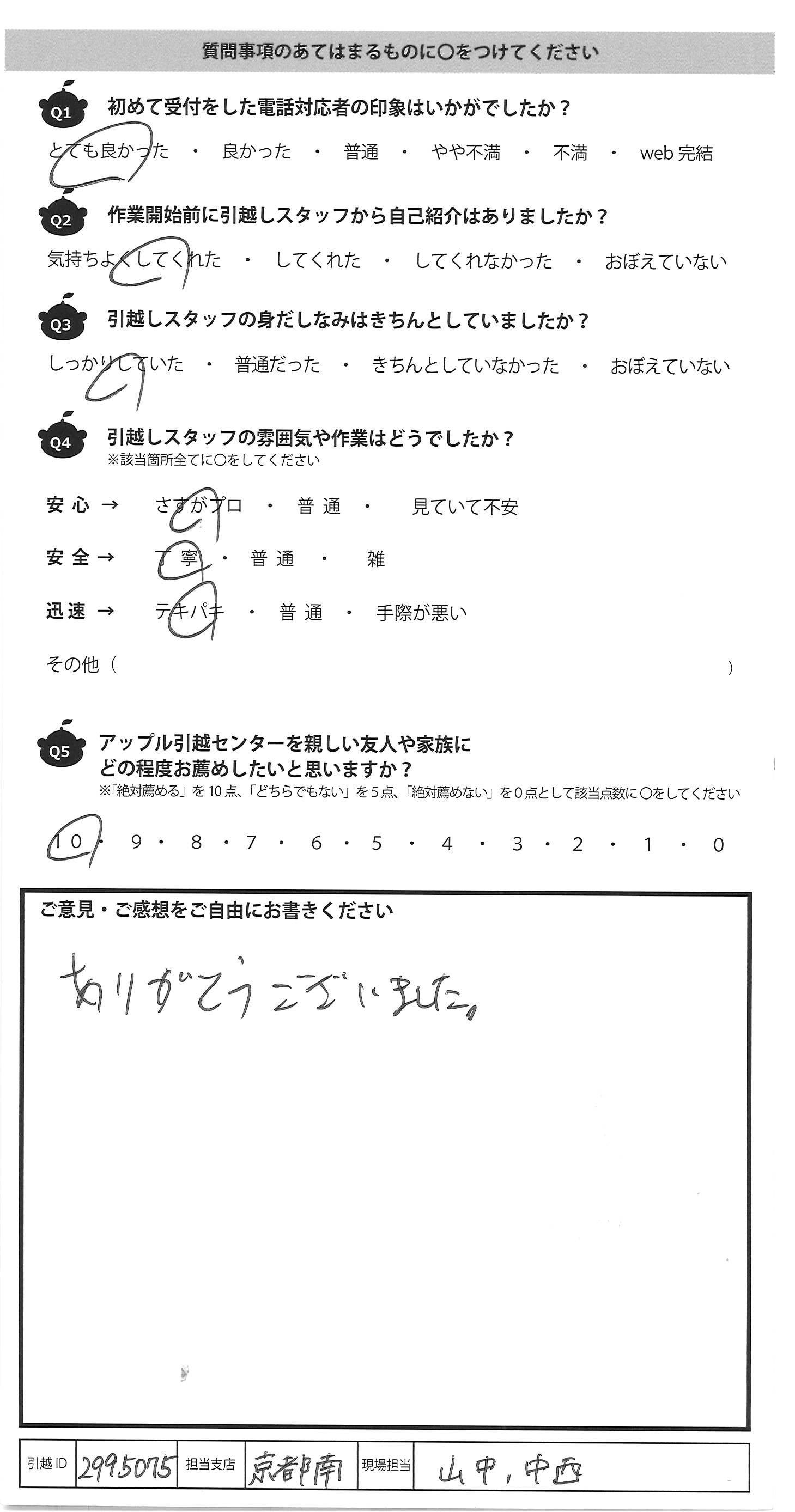 A.受付の方、オンラインの方 作業の方、皆さん対応が良い 会社でした。 料金も満足です。 ありがとうございました。 また引っ越しの時はお願い したいと思います。