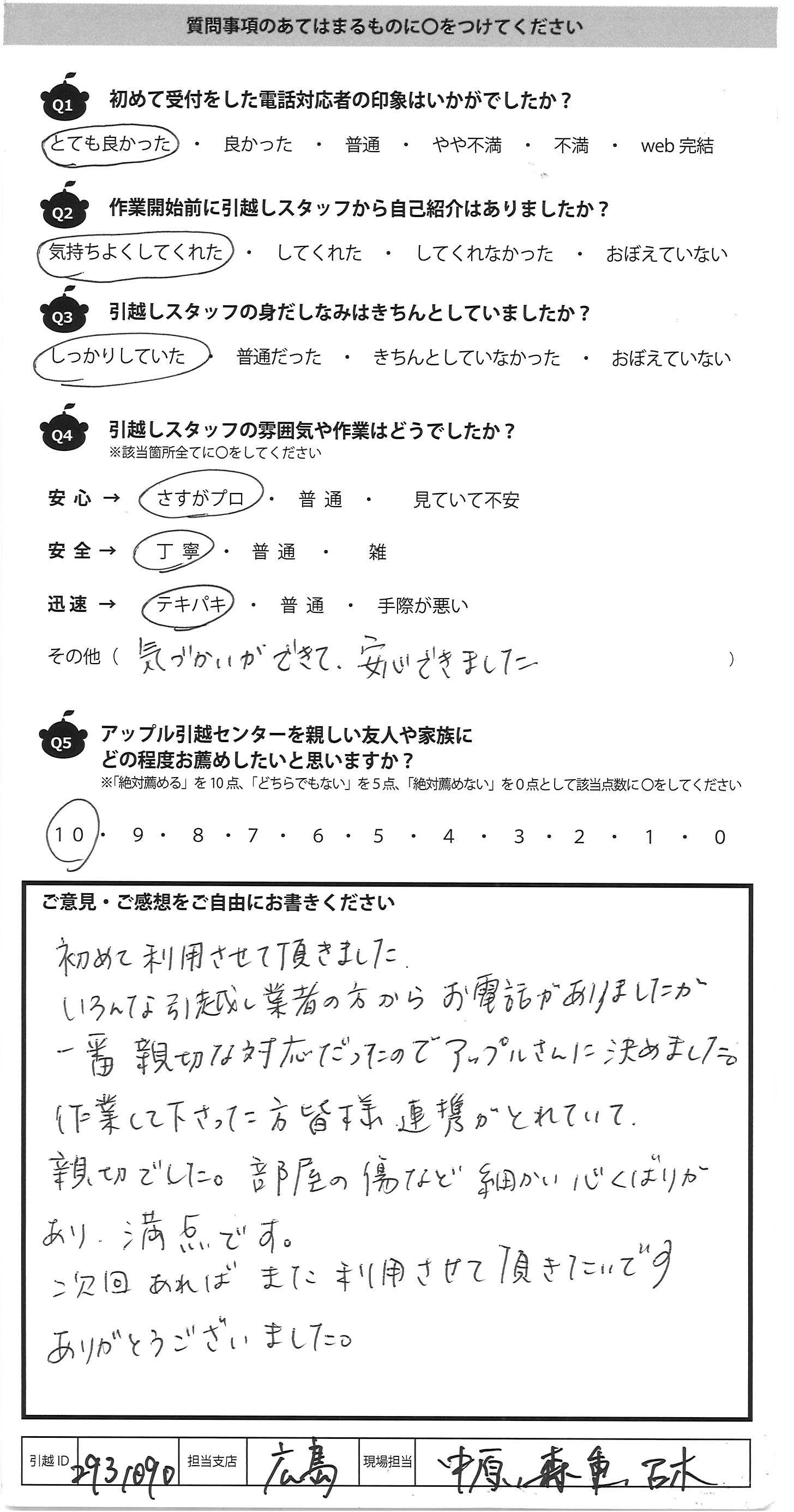 A.ライン見積りなど初めてで不安でしたまた次回ありましたらお願いしたいです。 安心して引越しできました。 営業担当の松本さんは超ご多忙にもかかわらず 誠意を持って大変気持ちよく柔軟に対応していただきありが とうございました、アップルさんにしてよかったです。 引っ越し当日の尾崎さんは大変リーダーとして優秀でした。 荷物の搬入が大変だったのですが、いやな顔1つ せず、チームの方にも適切な指示を出しながらテキパキ 進めていらっしゃいました。長時間本当によくやってい ただき感謝しています。松本さん、尾崎さんで 本当に良かったです。とり組む姿勢、柔軟さが100点以上でした。