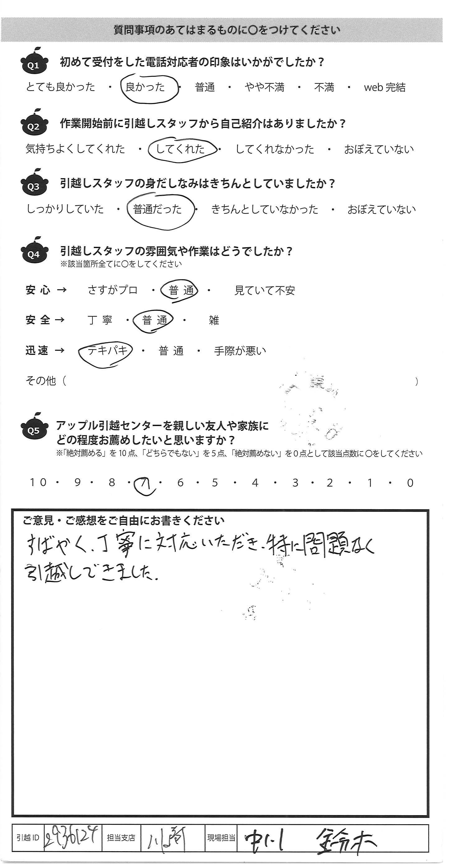 A.すばやく、丁寧に対応いただき、特に問題なく 引越しできました。