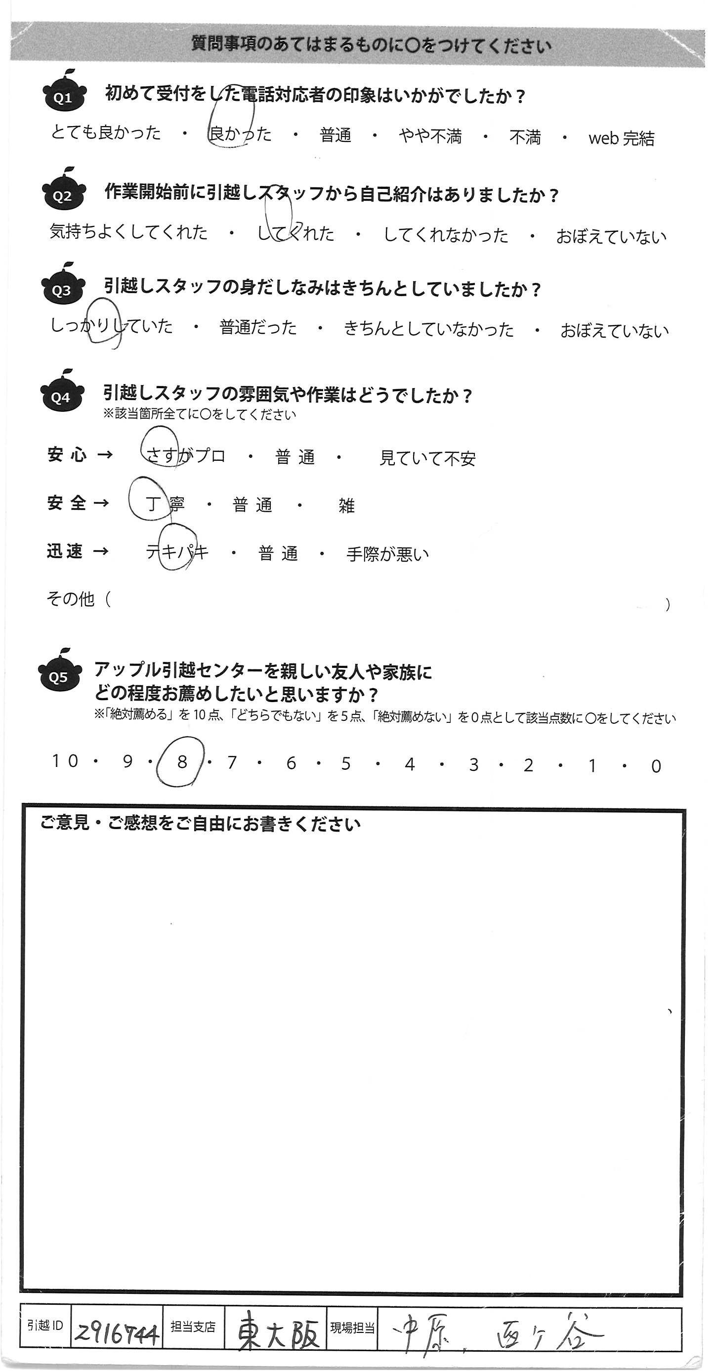 A.スムーズに引っ越しが完了して大変助かりました。またの機会がありましたら、よろしくお願いいたします。