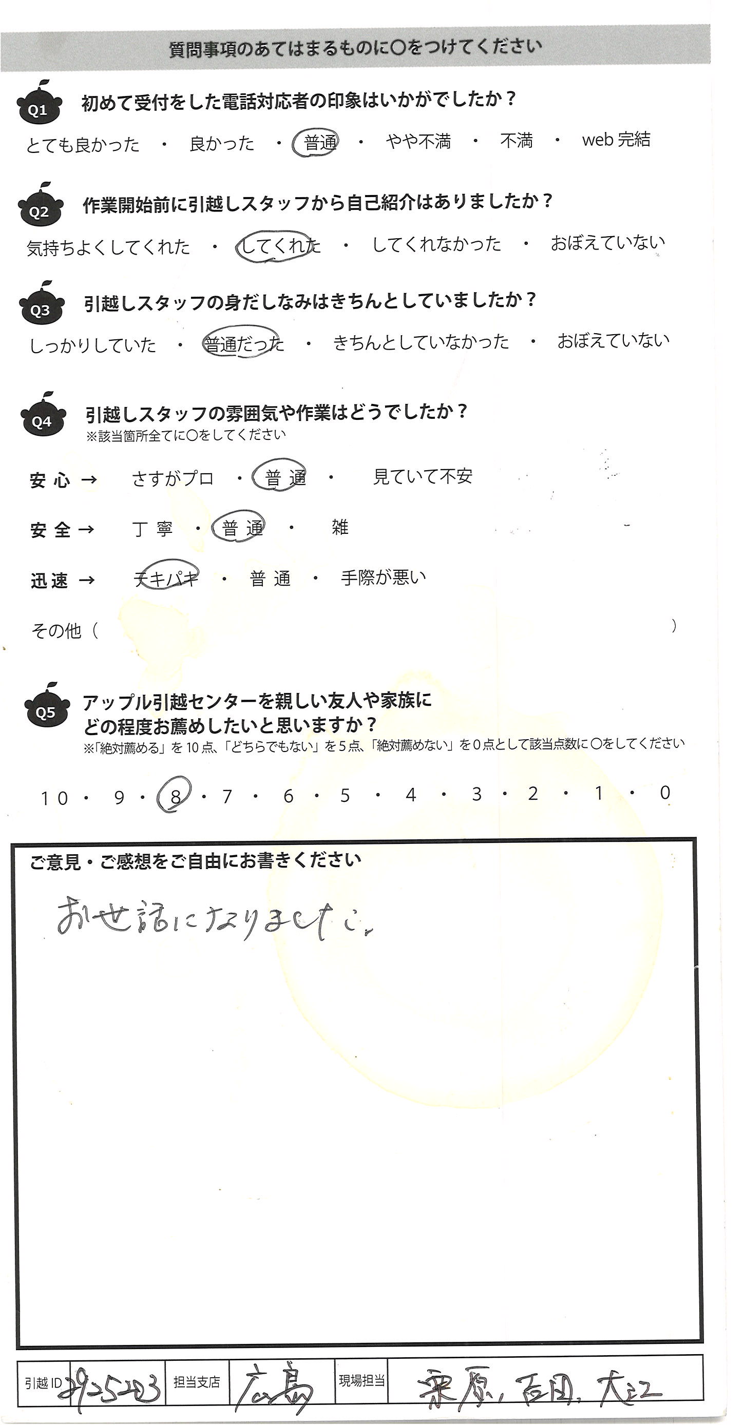 A.とても丁寧に迅速に作業してくださり 感謝しています。 前回の引っこしでもアップルさんを利用 させて頂き、今回もリピートしましたが、 やっぱりお願いしてよかったと思いました。 いつも丁寧なお仕事をありがとう ございます。