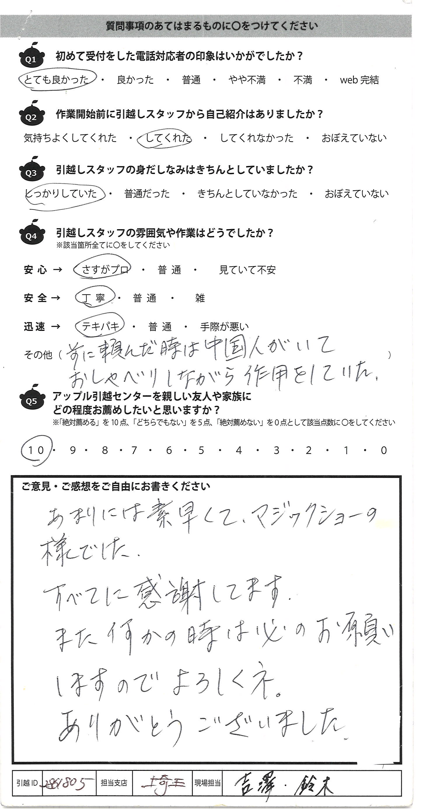 A.私達の案件はとても大変な作業だったのがとても申し訳なく思っていたのですが、それにもかかわらず、皆さん、とても明るく作業もテキパキと丁寧で頼もしく、その上で感じがとても良く、何回か引っ越しはしてますが、この様な素晴らしい方々は本当に初めてでした。また引っ越しする際には、また是非お願いしたいと思います。 本当にありがとうございました。