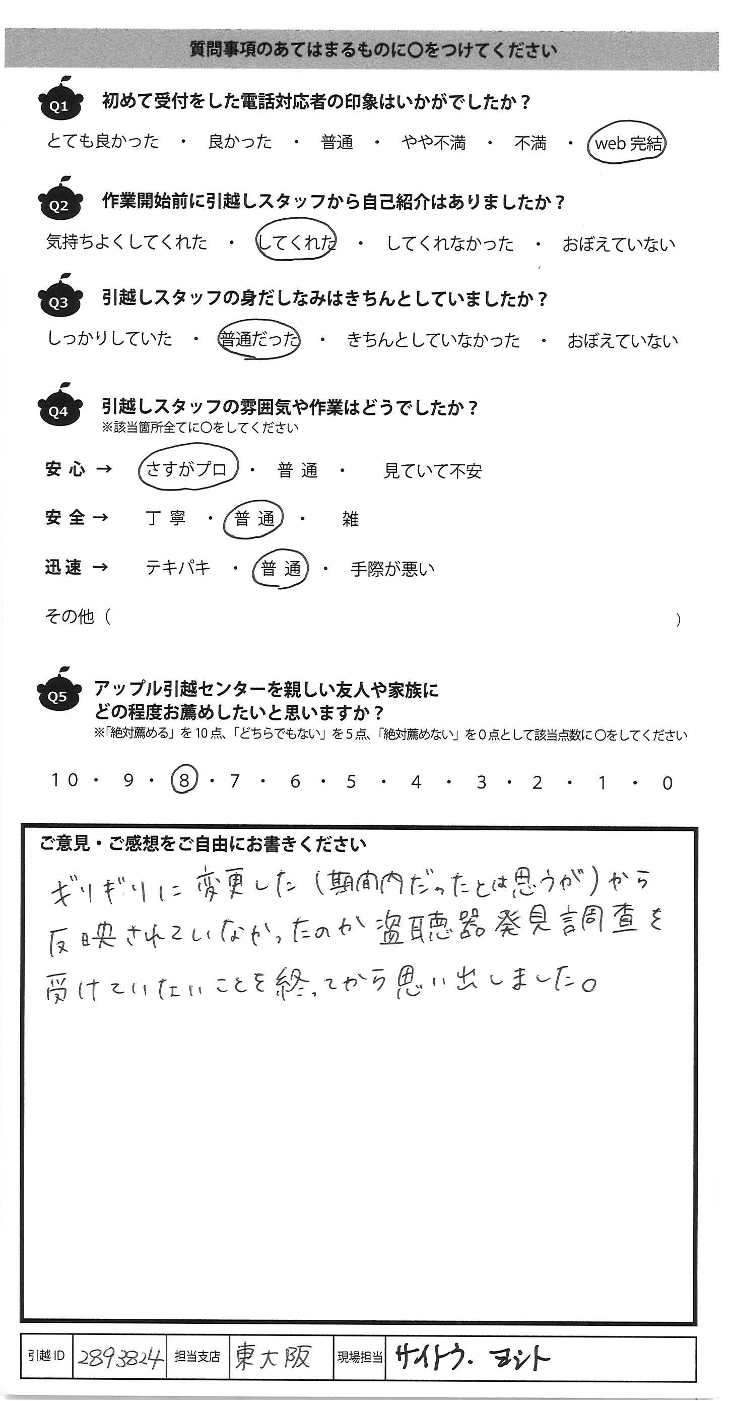 A.見積もりで来られた営業の方はとても感じがよかったです。 こちらの希望にも応えて下さりありがとうございました。 引越しスタッフの方はテキパキされていましたが気になった点が。 家財のほこりを拭きながら運ぶので雑巾を数枚用意しておいてください と営業の方に言われていたので当日いつお声が掛かるのかと思って いましたが結局そのような対応はなく、ほこりのついたままの運搬 でした。また、過去に利用した大手の業社だと家電のコンセントを テープなどで止め運搬されていましたが貴社は縛ることもなく だら~んと伸びたまま運ばれビックリしました。それから盗聴器サービス があるとパンフレットに書いてあったので荷物運搬後質問すると、「あー、それは 養生する時にしました」との回答で、一言、「今から盗聴器検査しますねー」が ほしかったです。でないと本当にしてくれたのかと猜疑心になります。