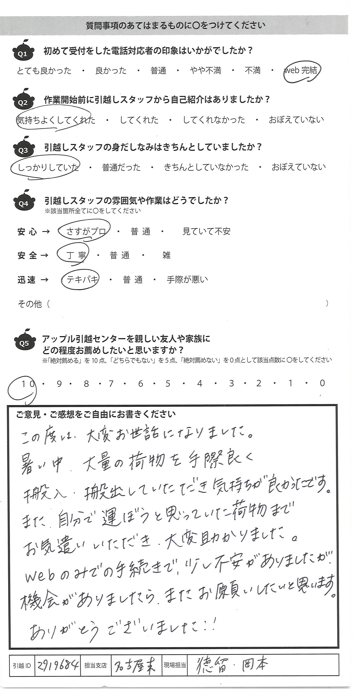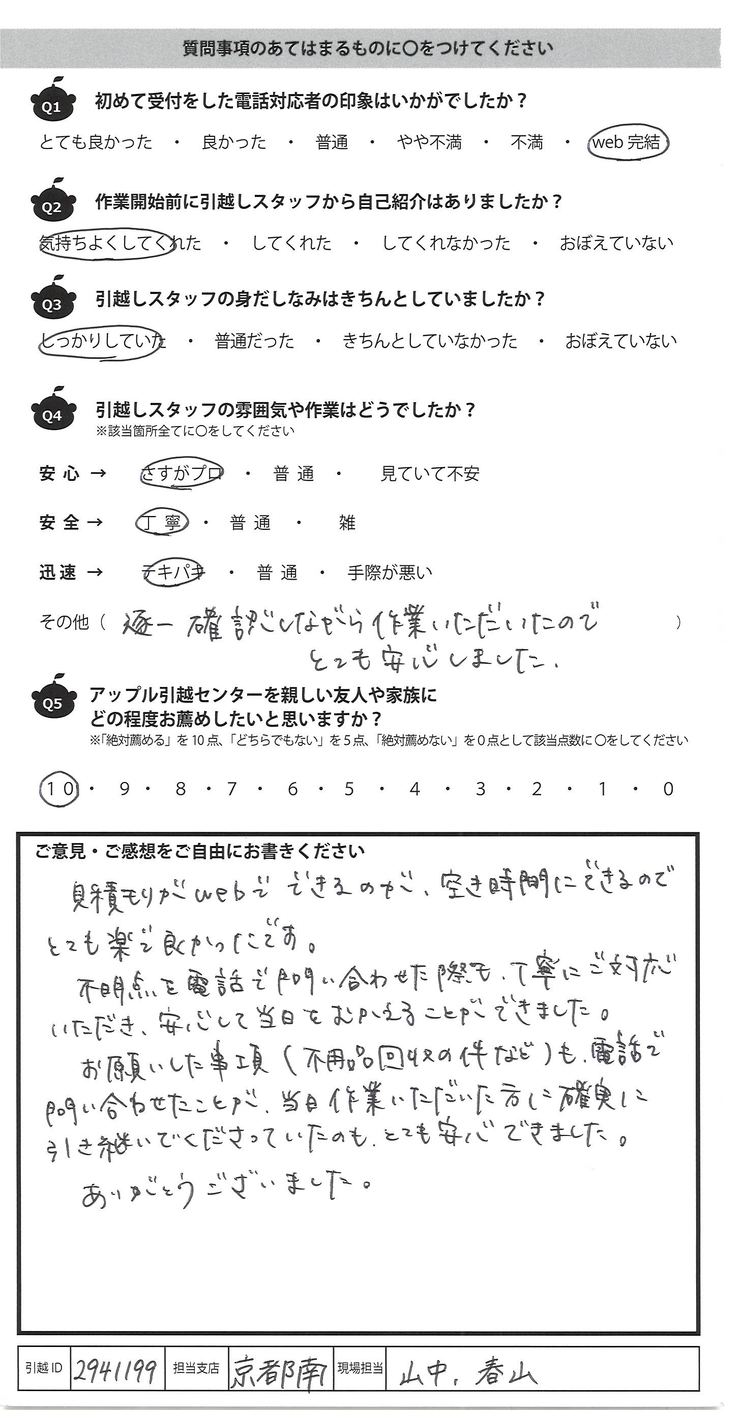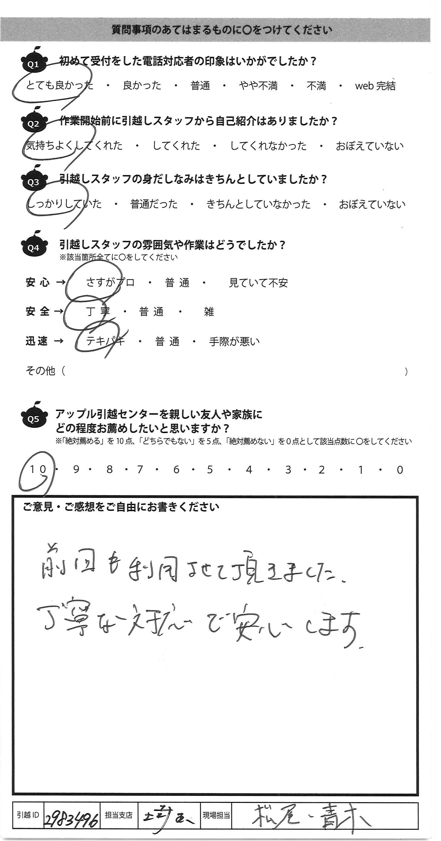 A.今回が2回目の利用でしたが横浜支店の河埜さん、宮下さん、小泉さんと、応援に来てくださった3名の方を合わせ計6名でご対応いただき、暑い中かつ遅い時間での作業でしたが皆さん爽やかに進めていただき非常にスムーズで助かりました。こちらの荷解きの順まで気を遣って荷物の移動をしていただき、さすがプロだなぁと感心しきりでした。IKEA製のマットレスが運べるか不安でしたが、事前に写真を共有し了承を得ておりましたので、作業員の皆様にはご迷惑をお掛けしましたが当日も滞りなく進みよかったです。 一点、玄関の金具を搬入前に取り外してもらったのですが復旧までお願いできると非常にありがたいです。また、玄関扉を抑えていた黒いゴム製のドアストッパーが新居の家に最初から置かれていたものであり、引っ越し後に見当たらなくなってしまっていたため次回以降は見分けがつくようにしておきたいと思います。 全体としてはお勧め度10点なので、次回も是非使わせていただきます!