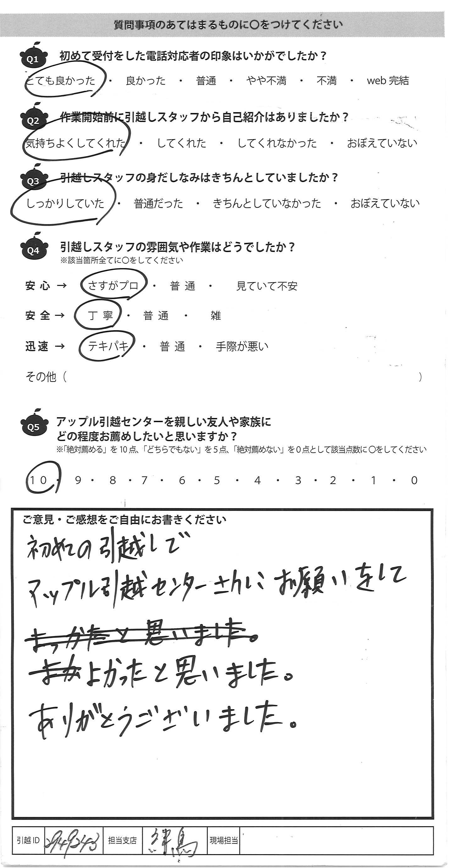 A.初めての引越しで アップル引越センターさんにお願いをして よかったと思いました。 ありがとうございました。