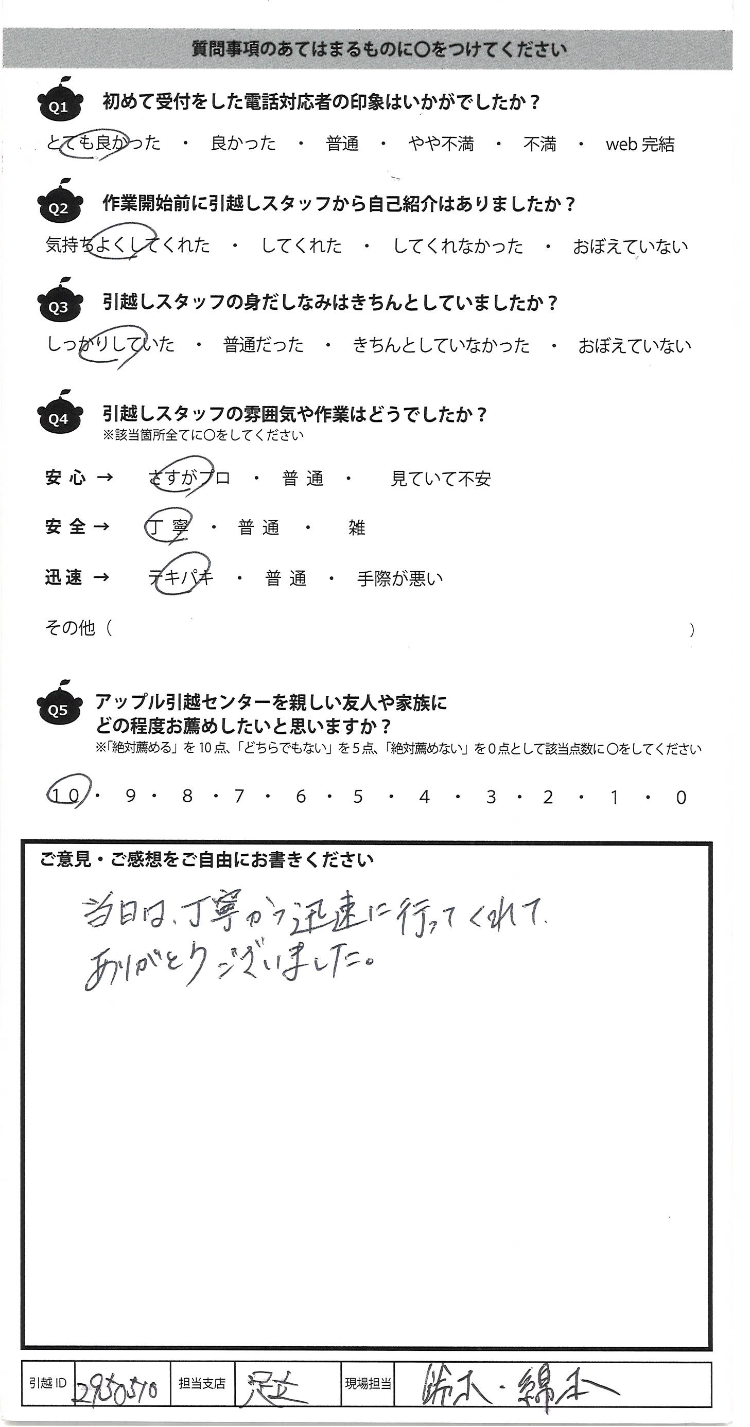 A.当日は、丁寧かつ迅速に行ってくれて、 ありがとうございました。