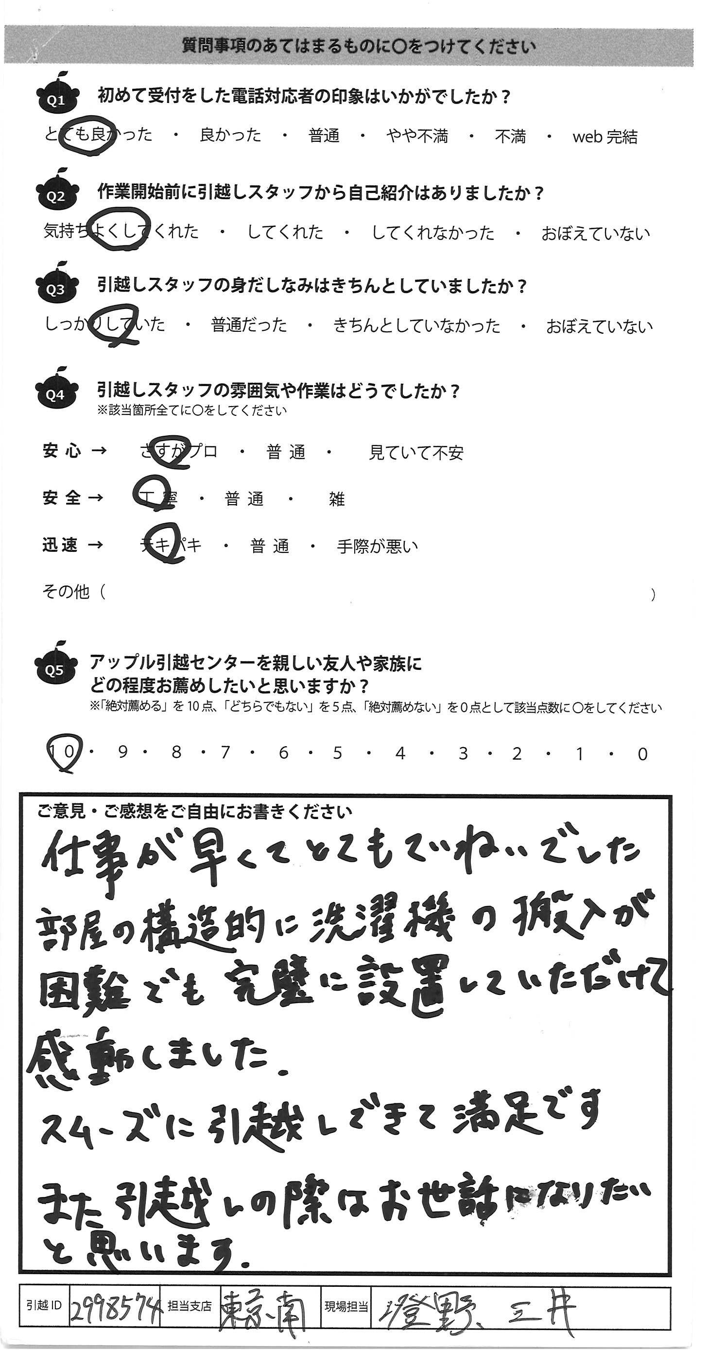 A.仕事が早くてとてもていねいでした 部屋の構造的に洗濯機の搬入が 困難でも完璧に設置していただけて 感動しました。 スムーズに引越しできて満足です また引越しの際はお世話になりたい と思います。
