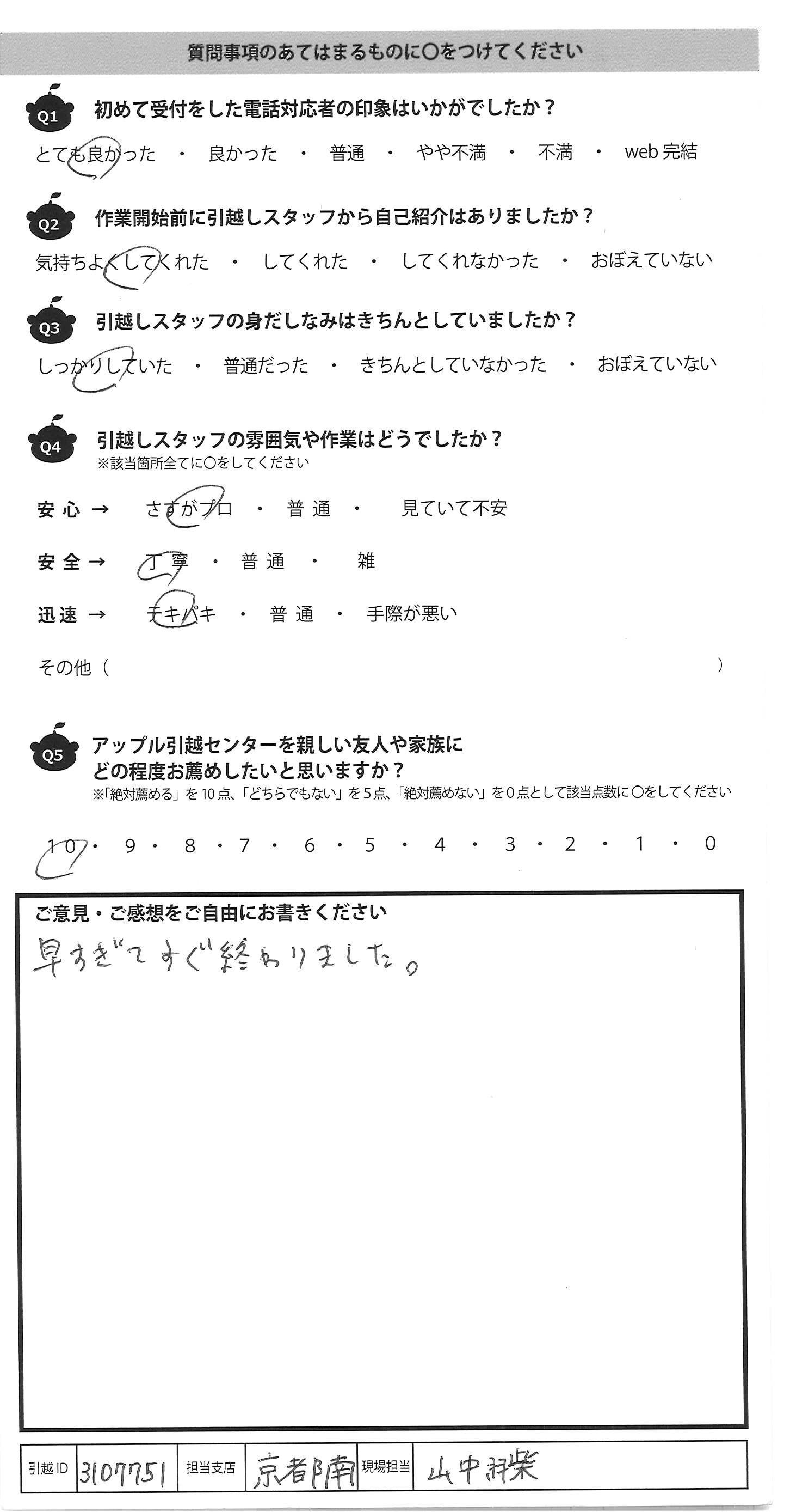 A.搬出から搬入まで、かなり頑張っていただいたと 思います。搬入先で部屋に番号を振っていたの ですが、その通りに運んでくれて良かったです。 また、小休憩をはさむ時に声かけいただいた のもよかった!ちゃんと休憩してえらい!! 1点だけ、中原さん?の声が小さめだったので、 もう少し大きな声で話していただけるとあり がたかったです。オバちゃん聞こえんのよ… しばらく自分の引越しはないと信じたいので、 知人で引越しする人がいたら、それとなく勧めます!